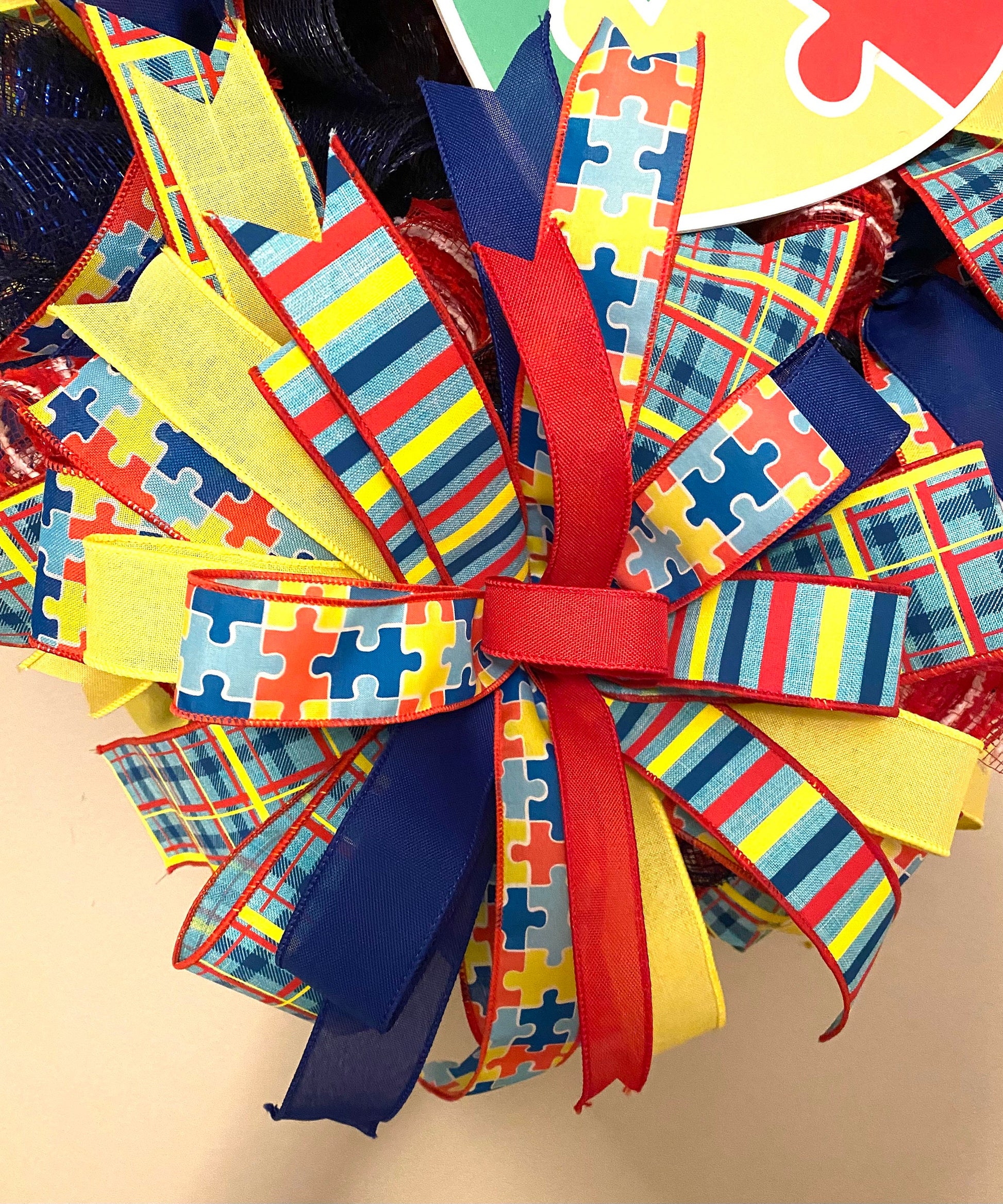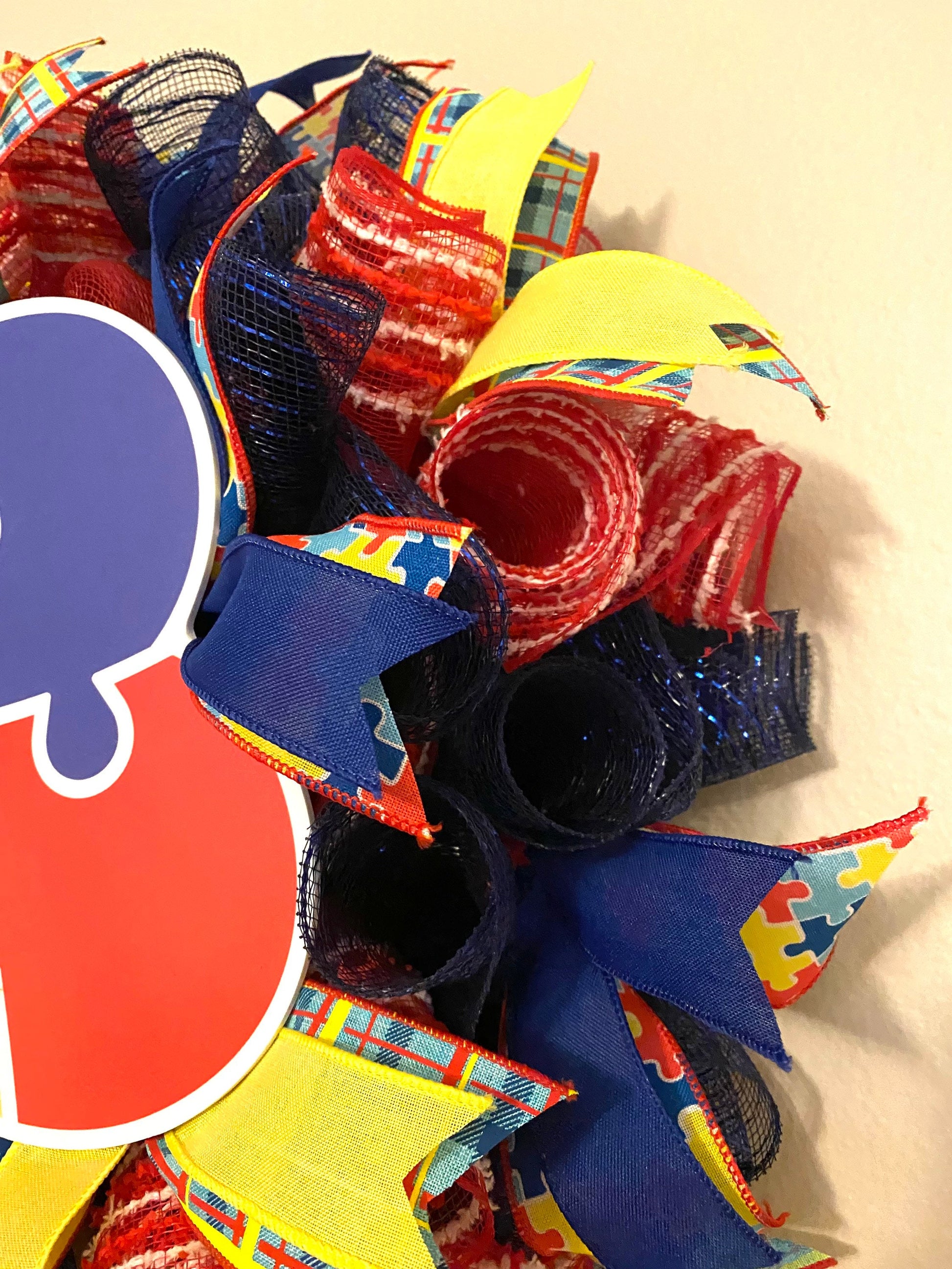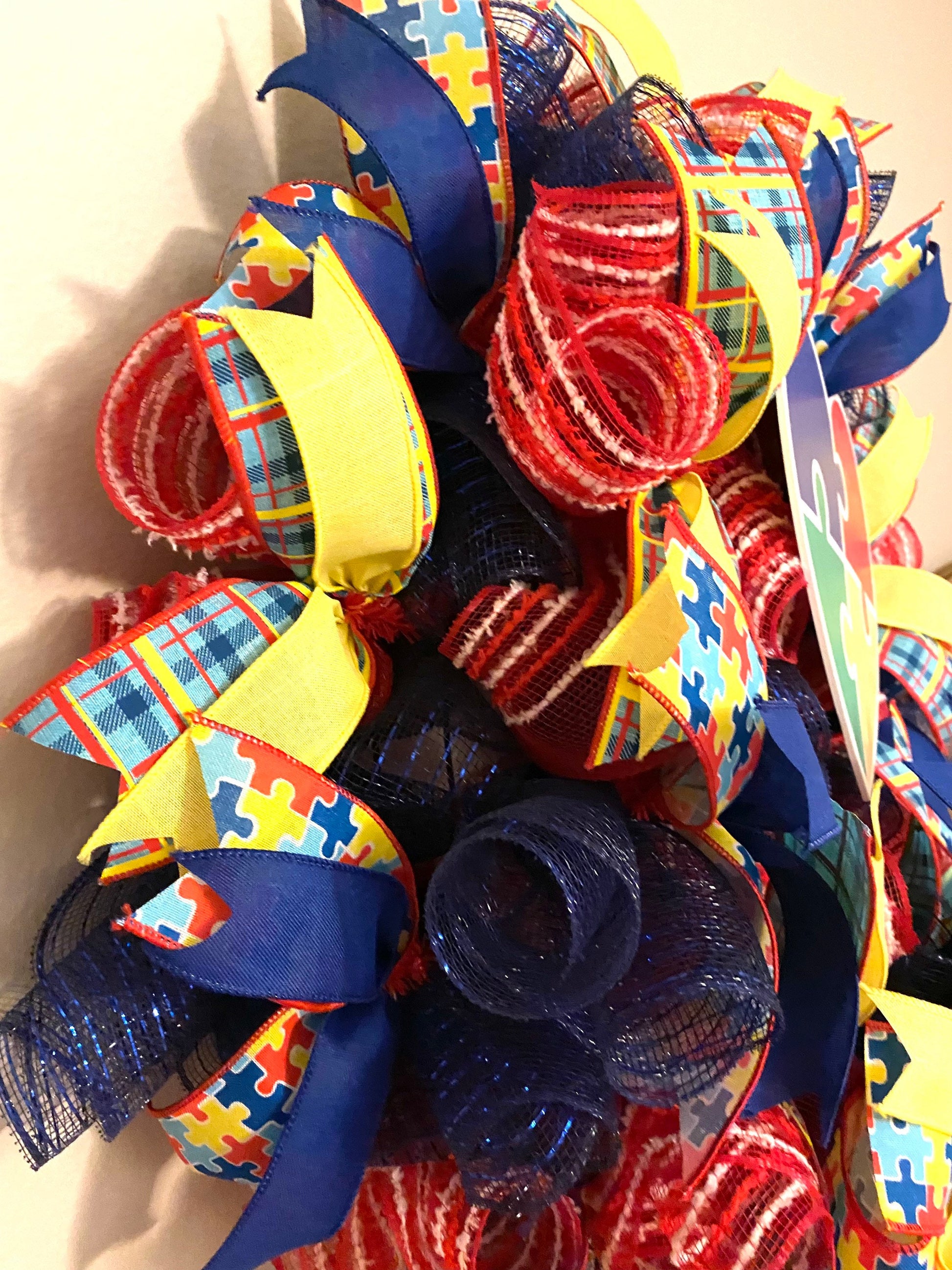 This bright and colorful handmade Autism Awareness wreath is made with deco mesh in blue, and red with white stripes. It is embellished with a heart shaped sign with with puzzle pieces, and wired ribbon in the colors red, yellow, & blue in various pints. The wreath is in an oval shape and measures 26 inches in height, 22 inches in width, and 10 inches in depth.