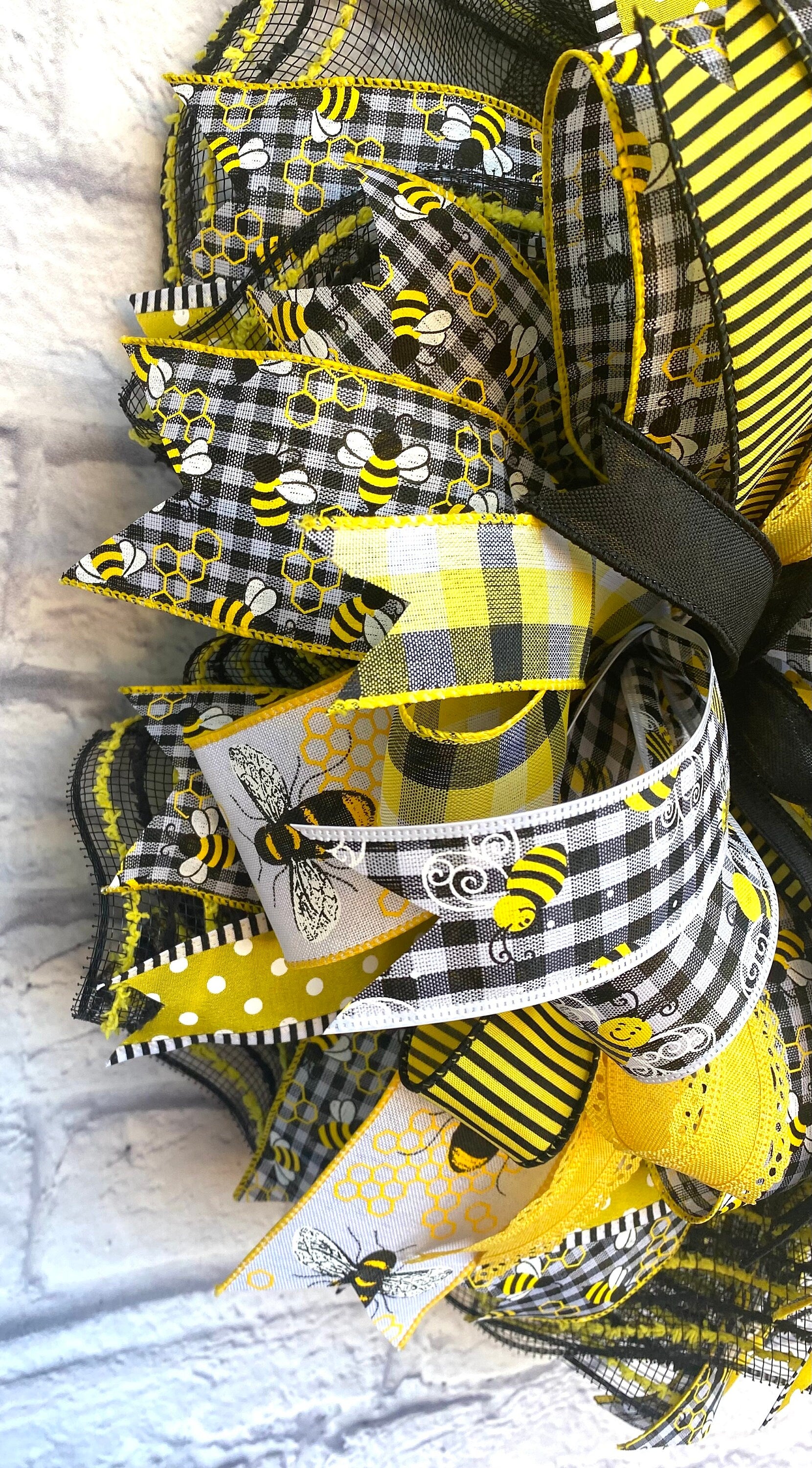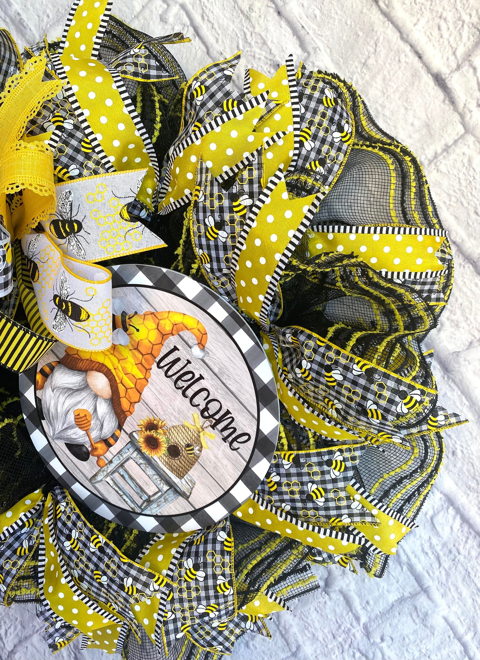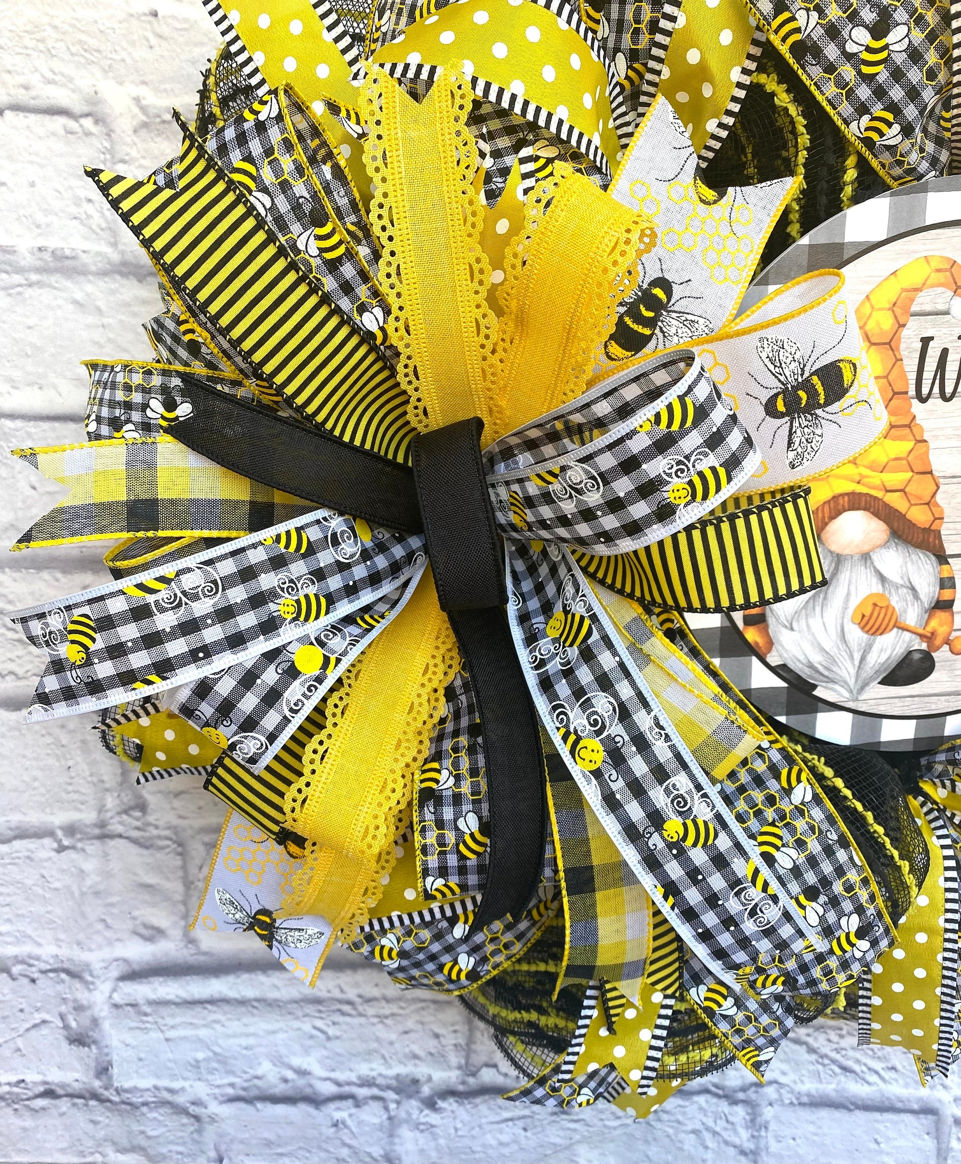 This bright & colorful handmade Farmhouse Gnome wreath with Bees is made on a wood wreath frame and made with black deco mesh with yellow border stripes. It is embellished with a plastic sign with a gnome and bees stating "Welcome", and a wired ribbons in white, yellow, and black in various prints. The wreath measures 22 inches in diameter, and 6 inches in depth. This wreath is designed to fit in between your door and storm door.