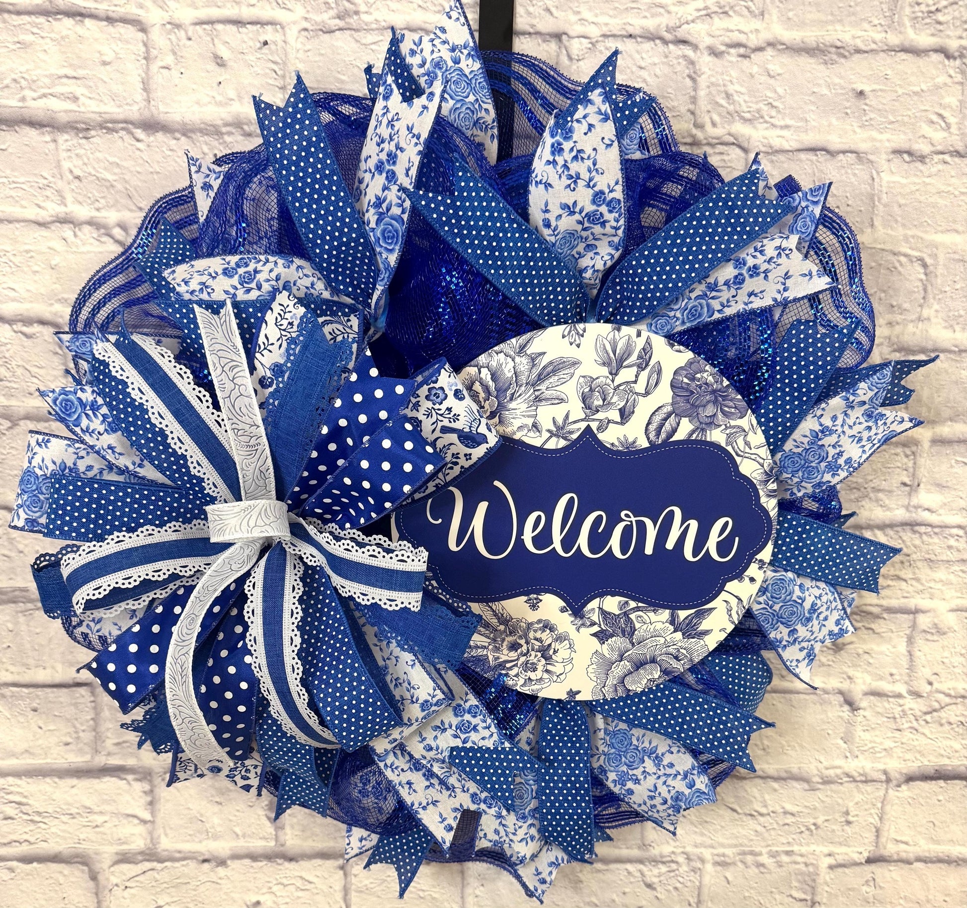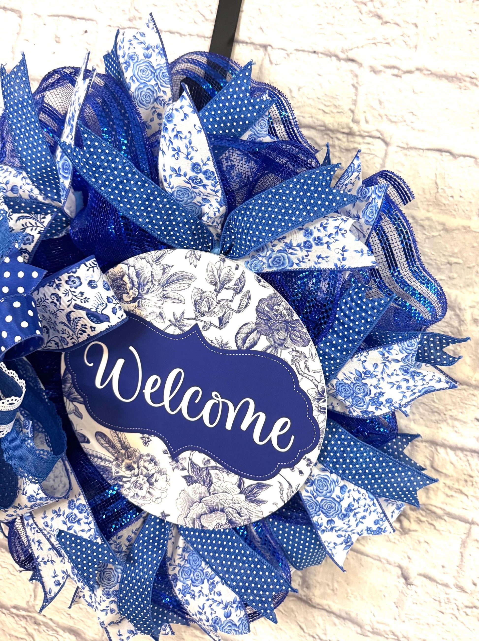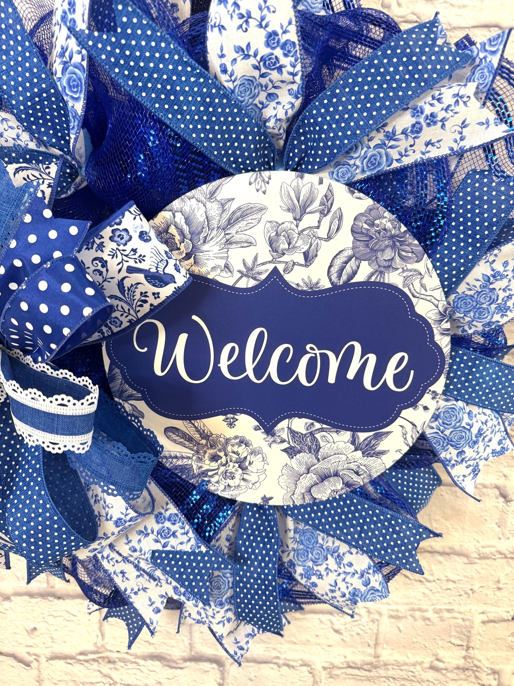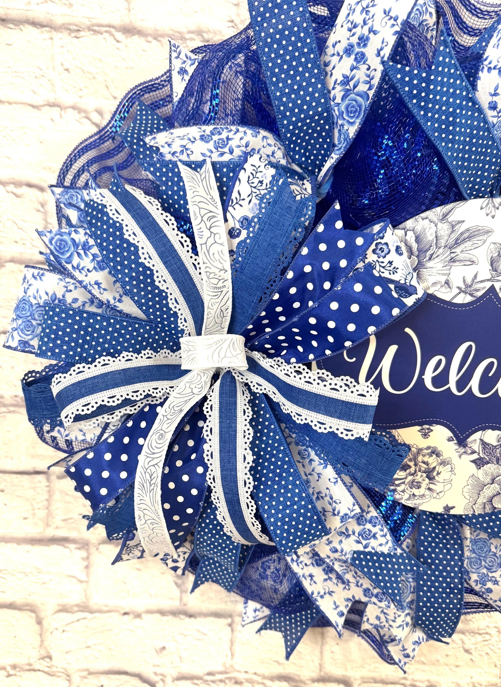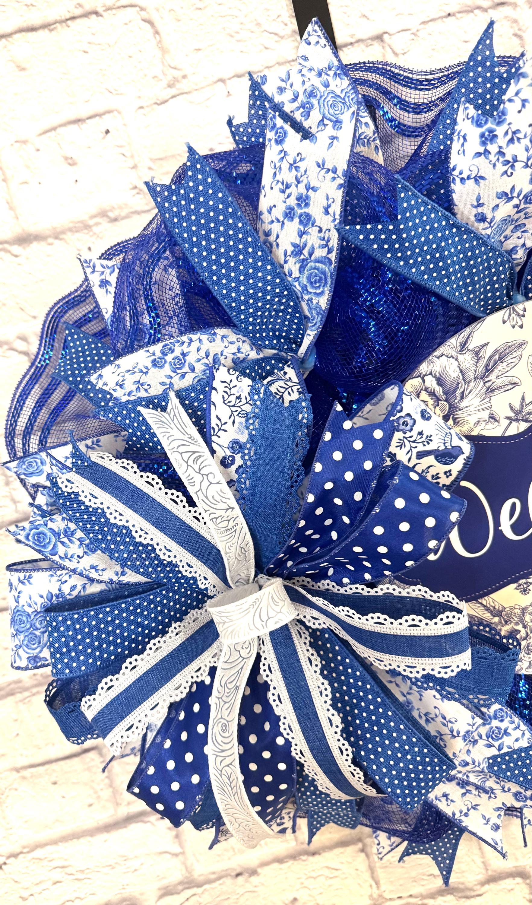 Add a touch of timeless charm to your entryway with this stunning blue and white “Welcome” wreath. Featuring a blend of floral toile, polka dots, lace-trimmed ribbon, and sparkling blue mesh, this handcrafted wreath brings elegance and warmth to any door or wall. The intricate mix of textures and patterns creates a fresh, cottage-style look perfect for year-round decor or as a thoughtful gift.