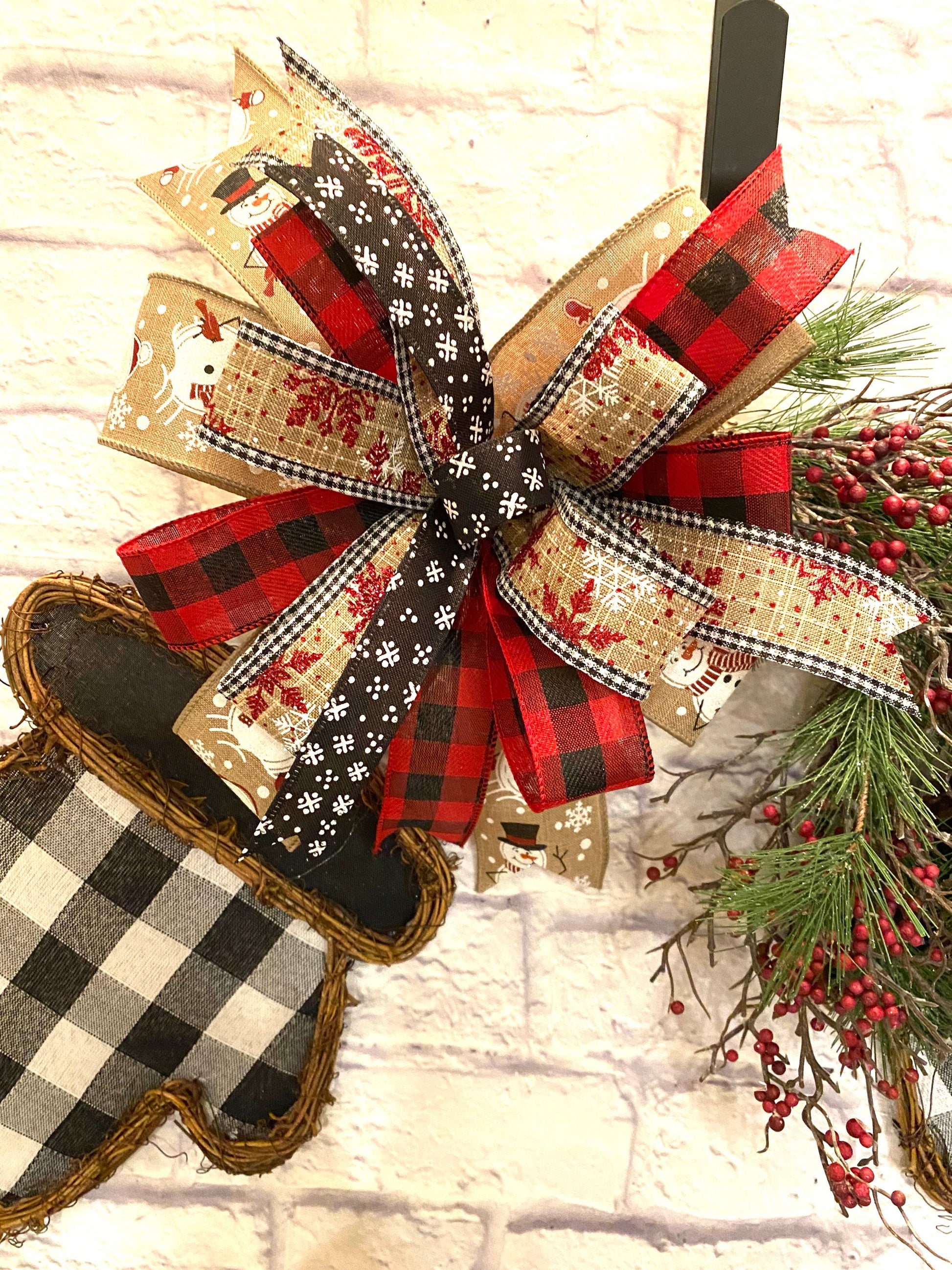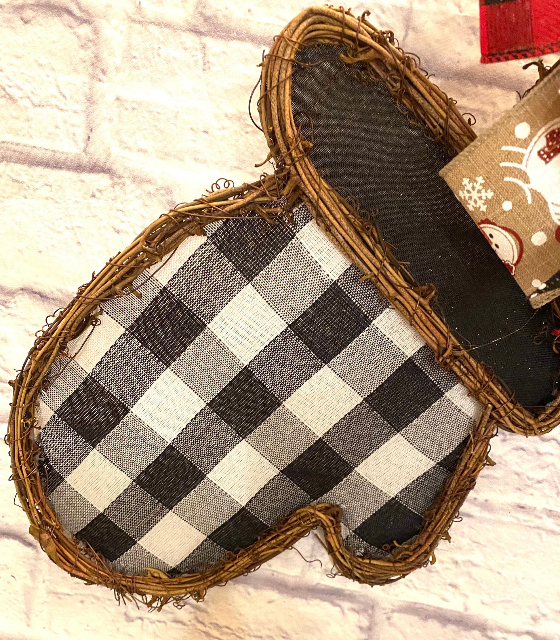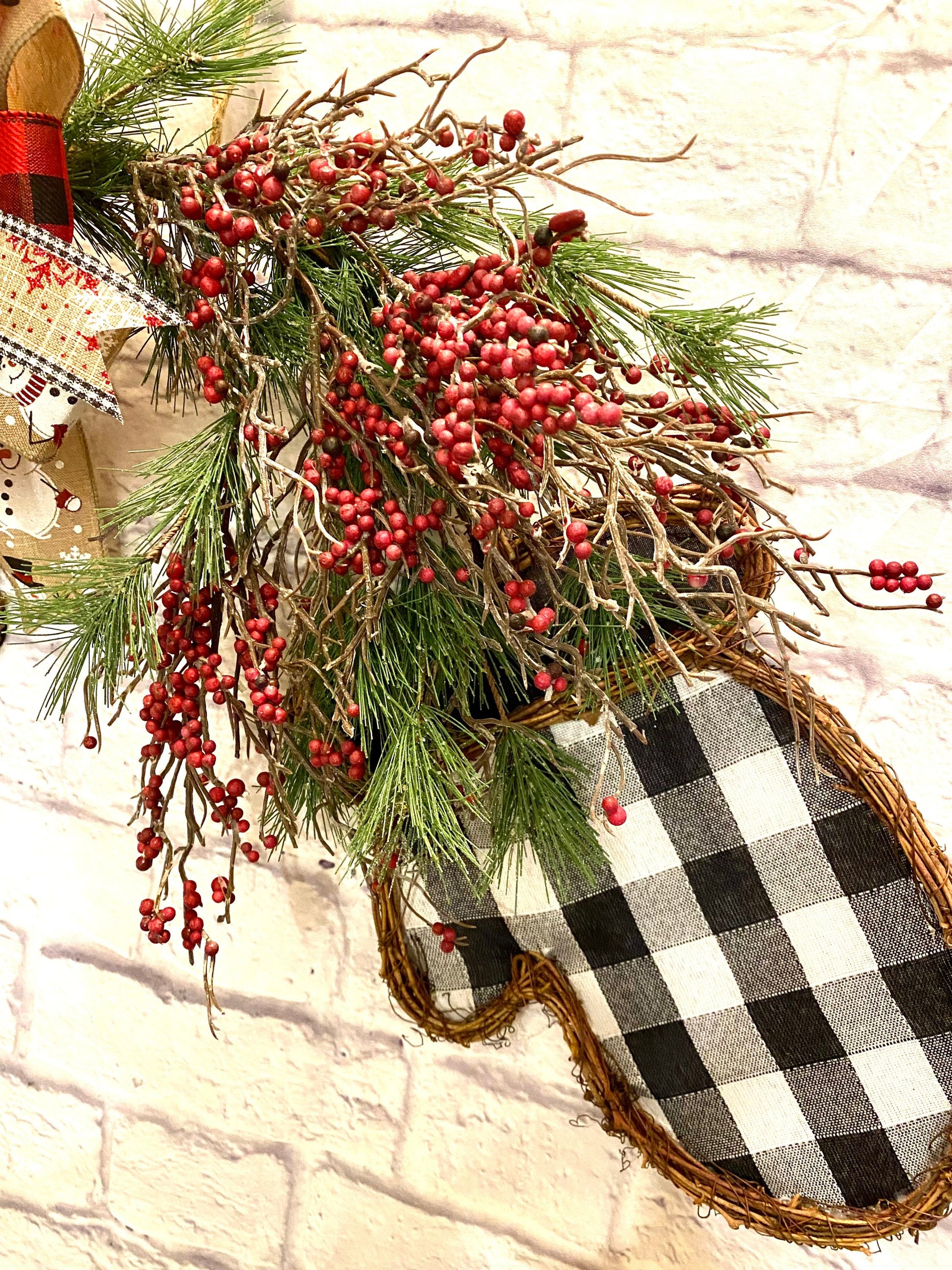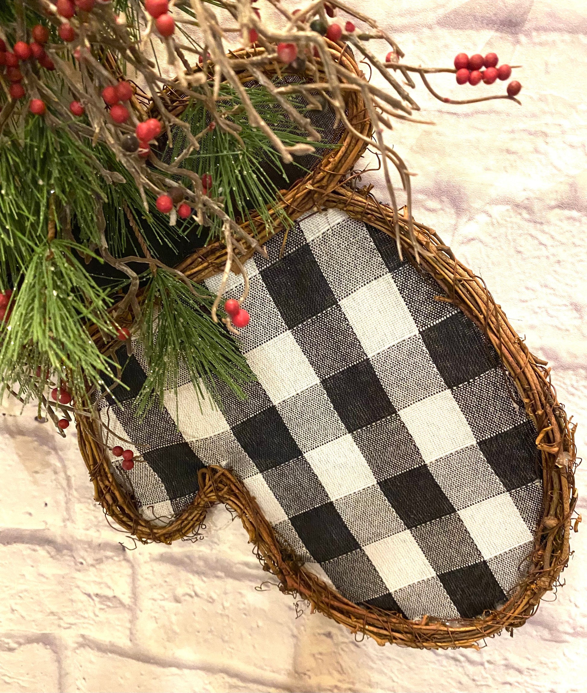 This beautiful Buffalo Check Winter Snow Mittens door hanger or wall decoration, is made with mitten shaped twig (grapevine) frame and black & white buffalo check fabric. It is embellished with glittery pine greenery & twigs with red berries, and a bow made with wired ribbon in the colors of red, black, beige, & white in various prints. This door hanger measures 20 inches in height and 27 inches in width.