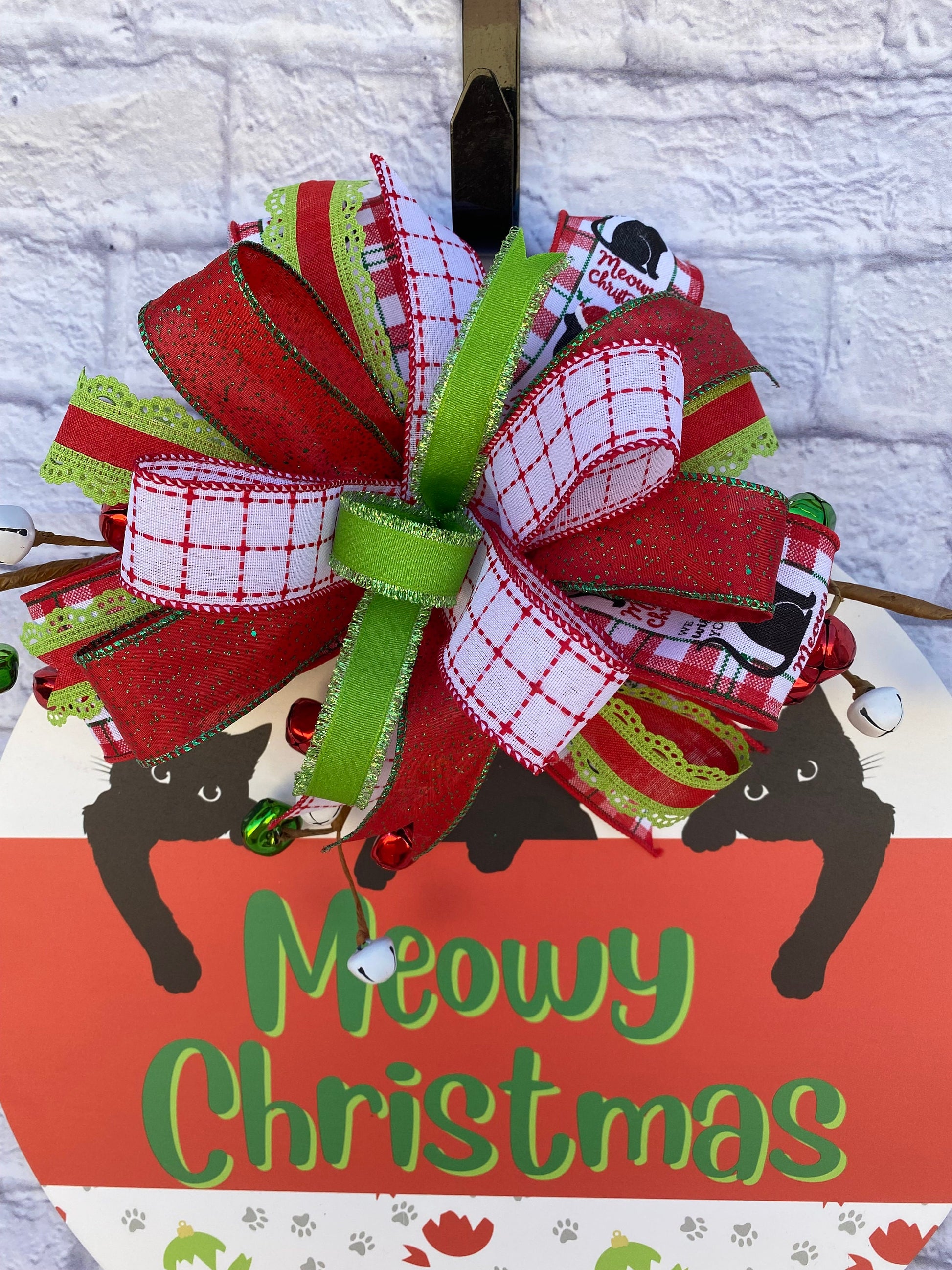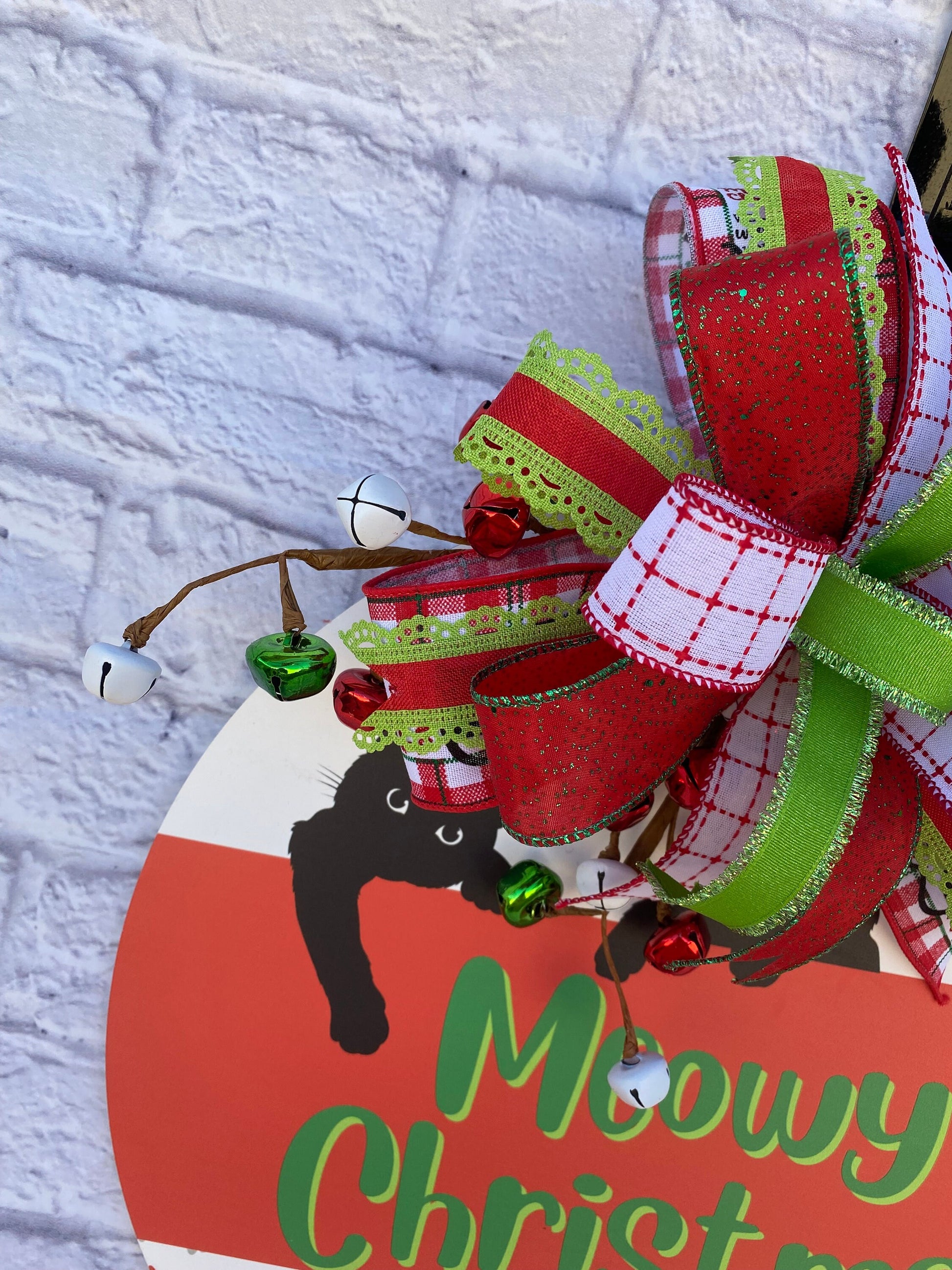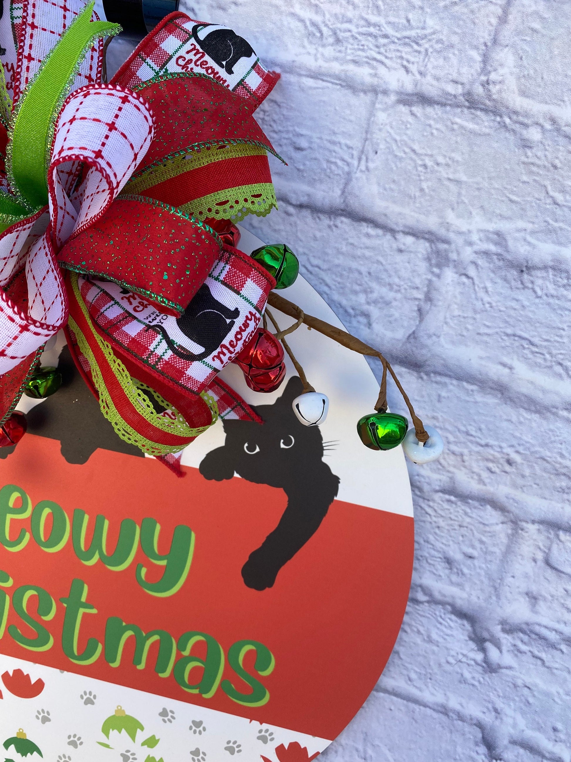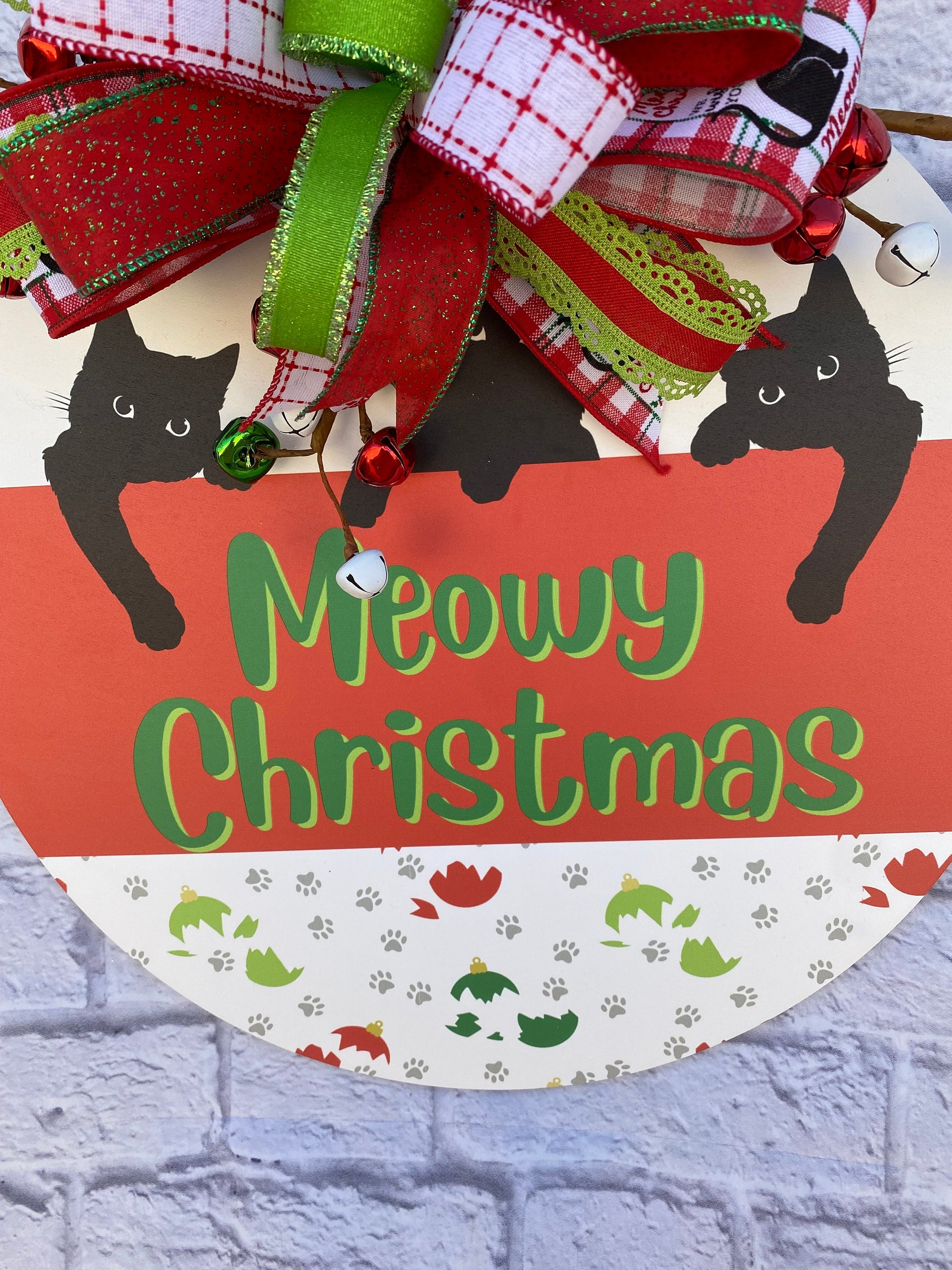 Are you a cat parent? Or are you needing a gift for a cat parent? If so, this Christmas cat door hanger is for you. This fun and whimsical cat Christmas door hanger is made with wood, is printed in a in red & white and with green print that states “Meowy Christmas”, and with 3 black cats, paw prints, and broken ornaments. The door hanger measures 18 inches in diameter, and 6 inches in depth. The door hanger is embellished with red, green, & white bells and a bow made with wired ribbons in the colors of red, green, and white in various prints.