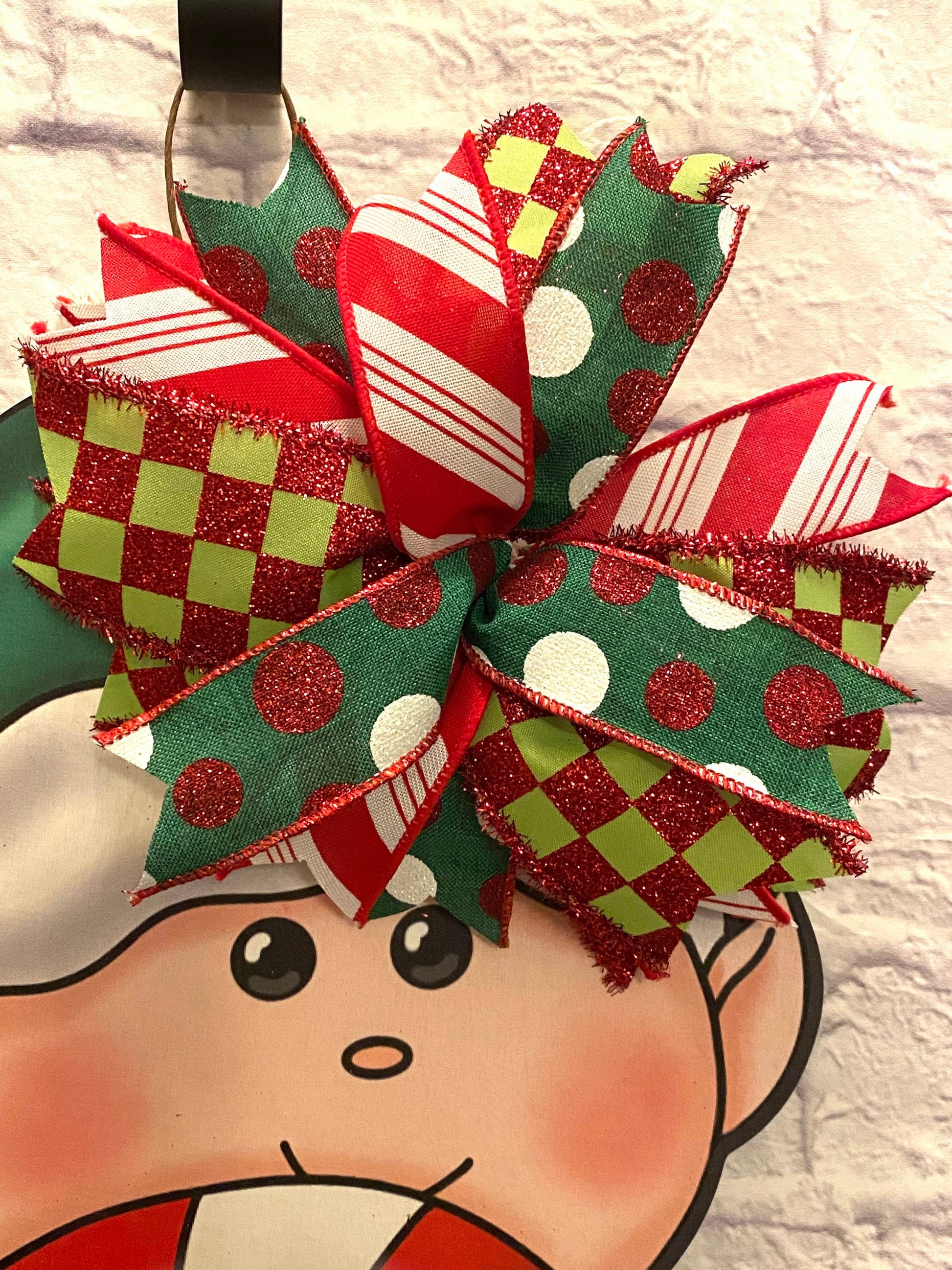 This fun Christmas Elf door hanger, is made with wood, printed in red, green, & white and measures 28 inches in length, 18 inches in width, and 4 inches in depth. The door hanger is embellished with a bow made with wired ribbon in green and red, in various prints.