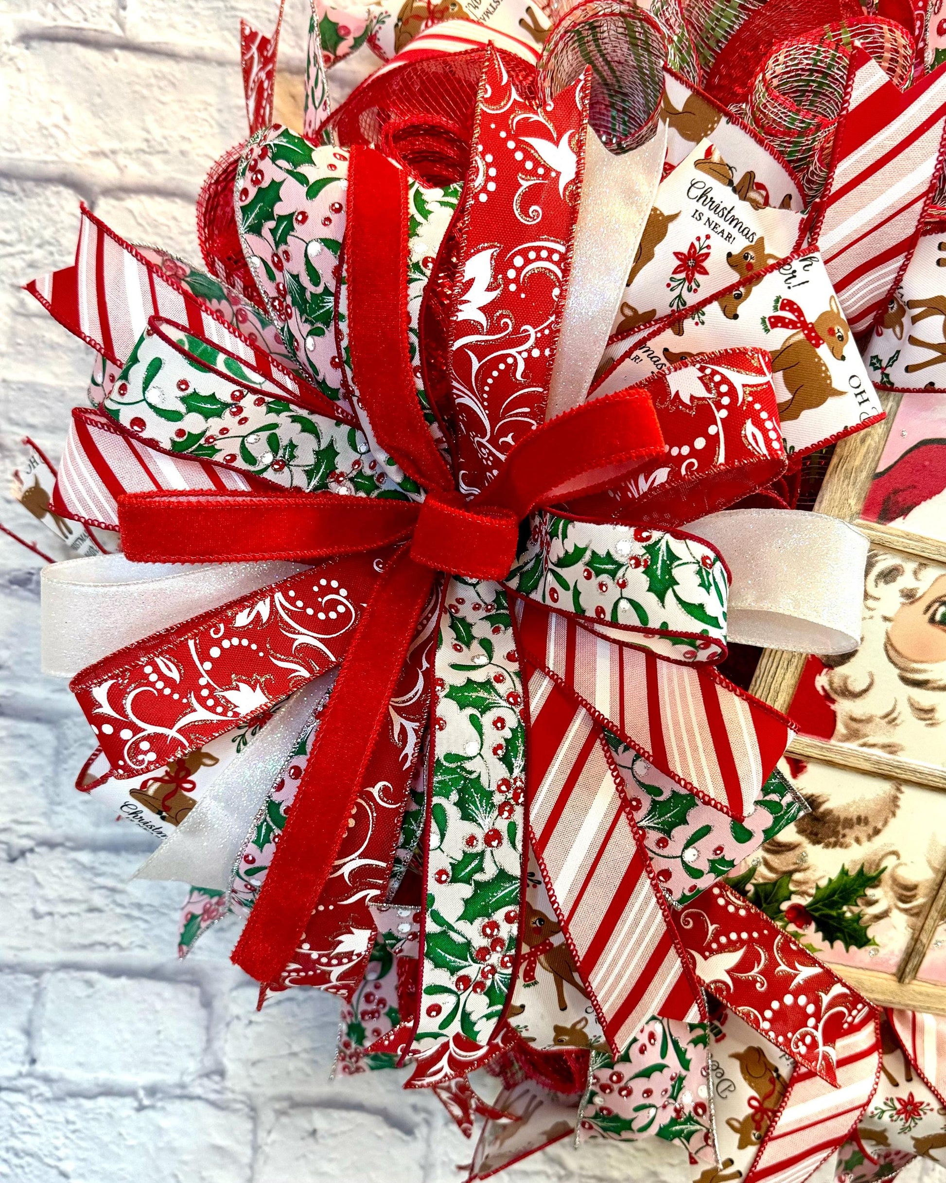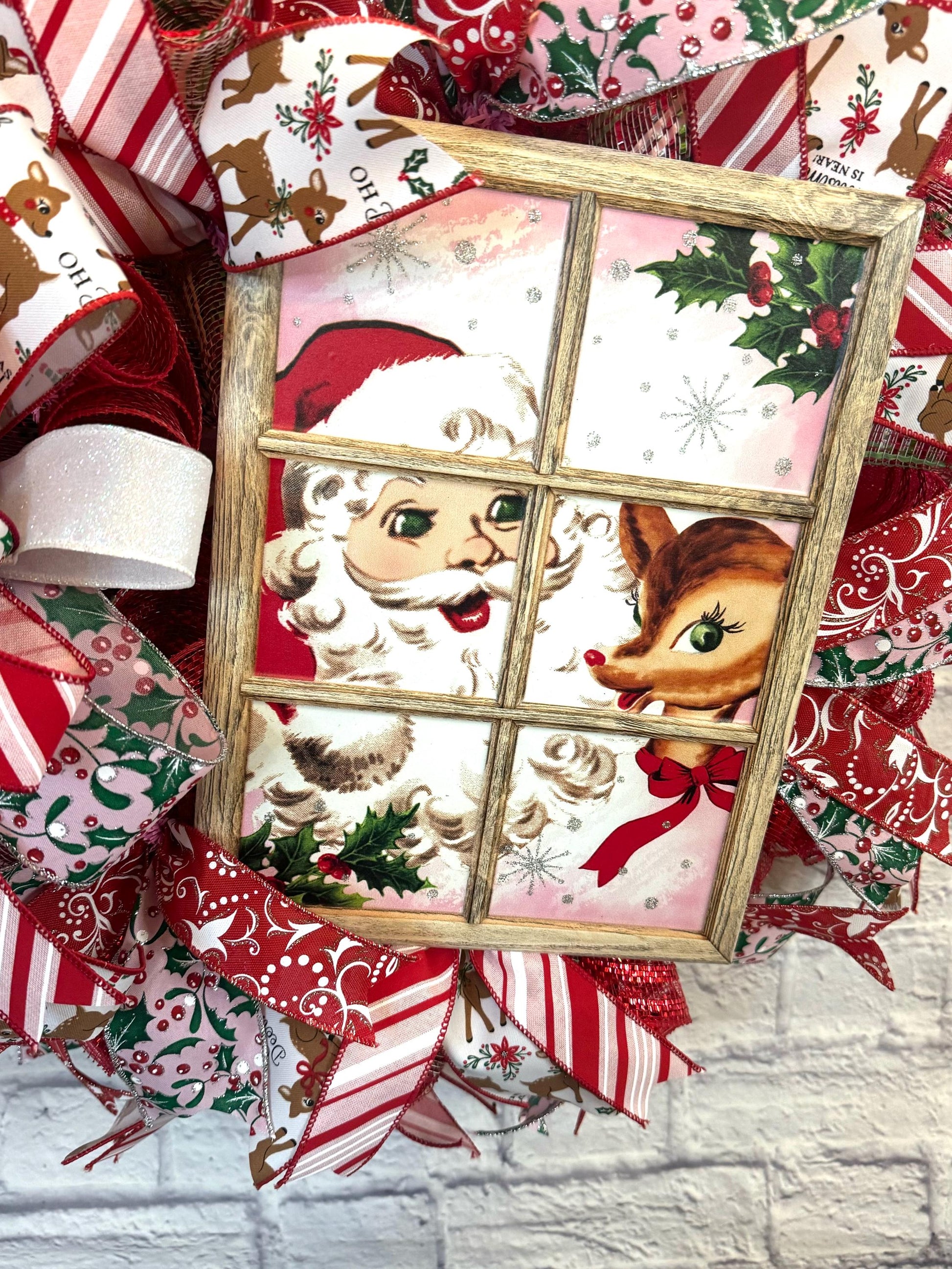 Bring holiday cheer to your home with this beautifully handcrafted Christmas wreath! Featuring vintage-inspired Santa and reindeer artwork framed in a rustic window, this wreath is adorned with vibrant ribbons in red, green, and white with festive prints like candy canes, holly, and reindeer.