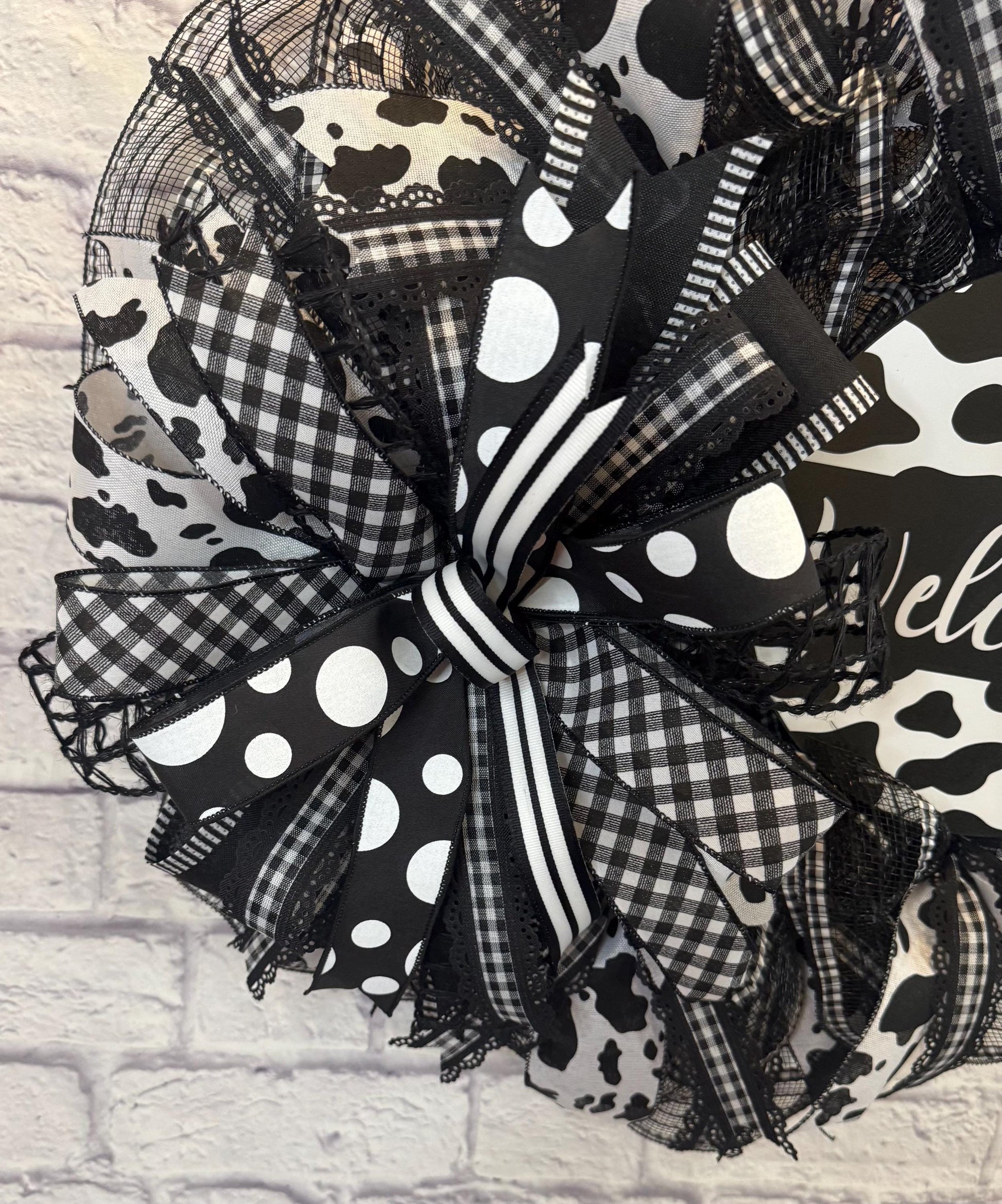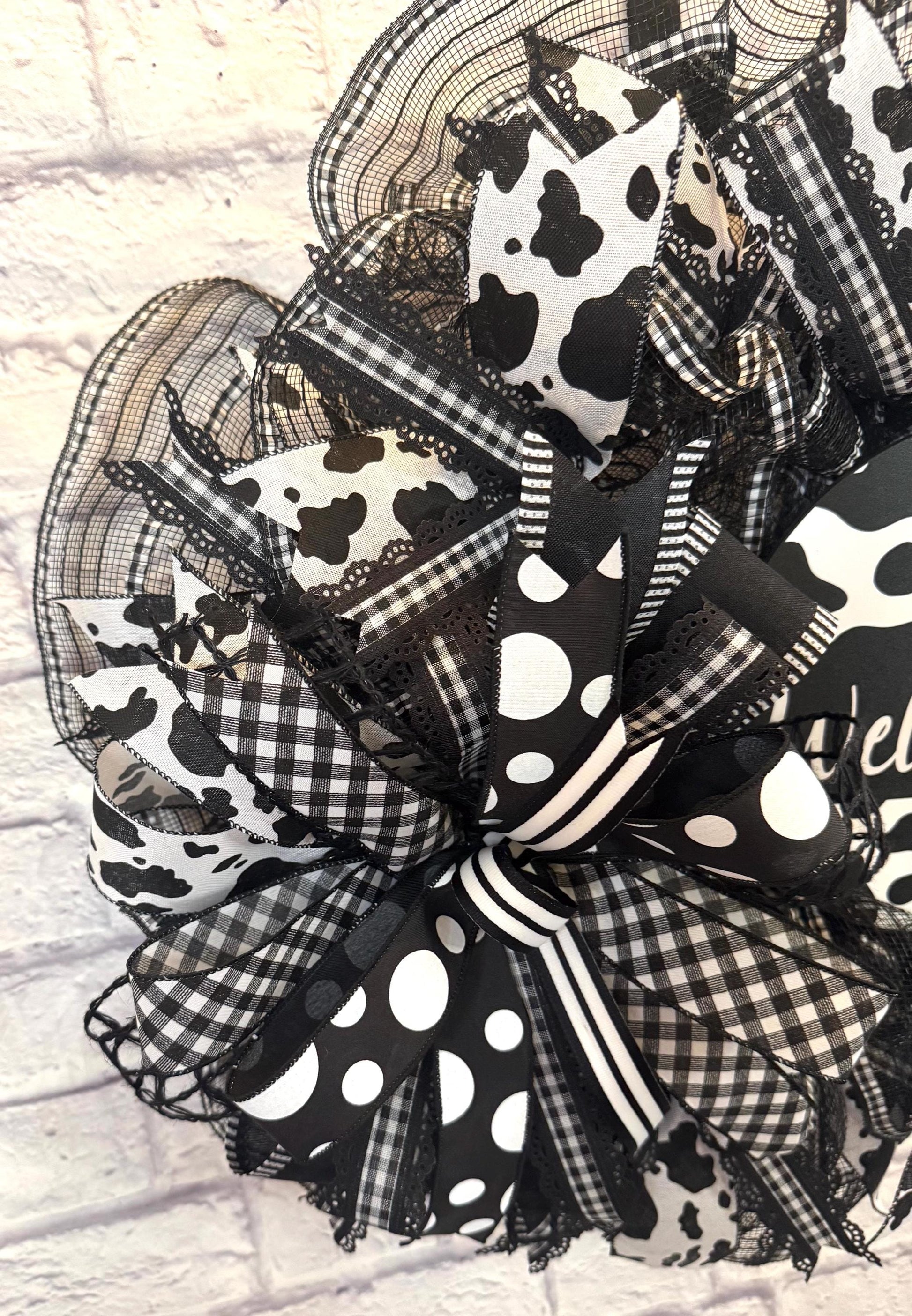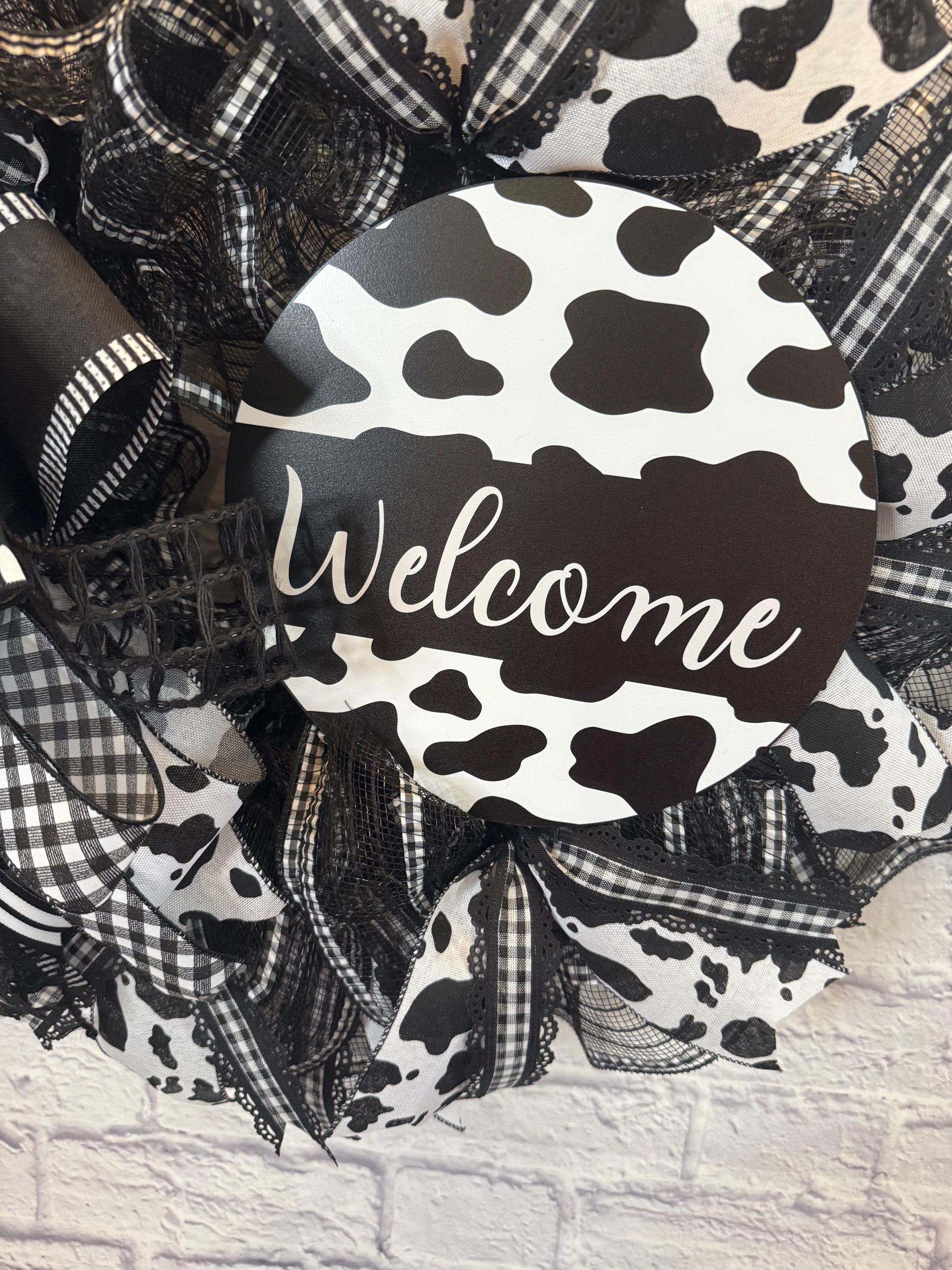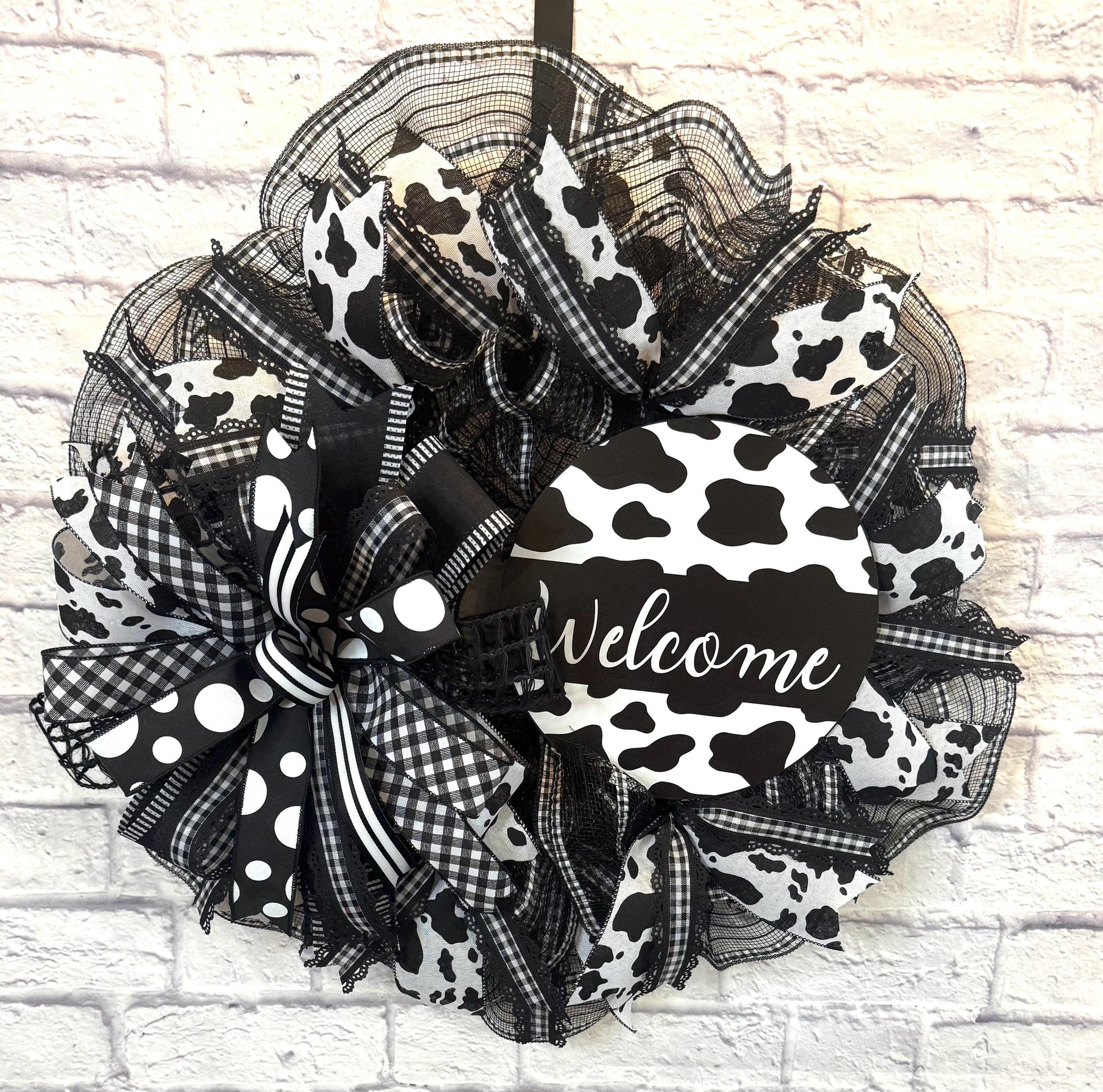 Welcome guests in style with this bold and charming black-and-white cow print wreath! Designed with layers of high-quality mesh, eye-catching cow print ribbon, buffalo plaid, polka dots, and a stylish “Welcome” sign, this wreath is a perfect statement piece for your front door, entryway, or farmhouse decor. The oversized bow adds a playful touch that blends rustic charm with modern flair.