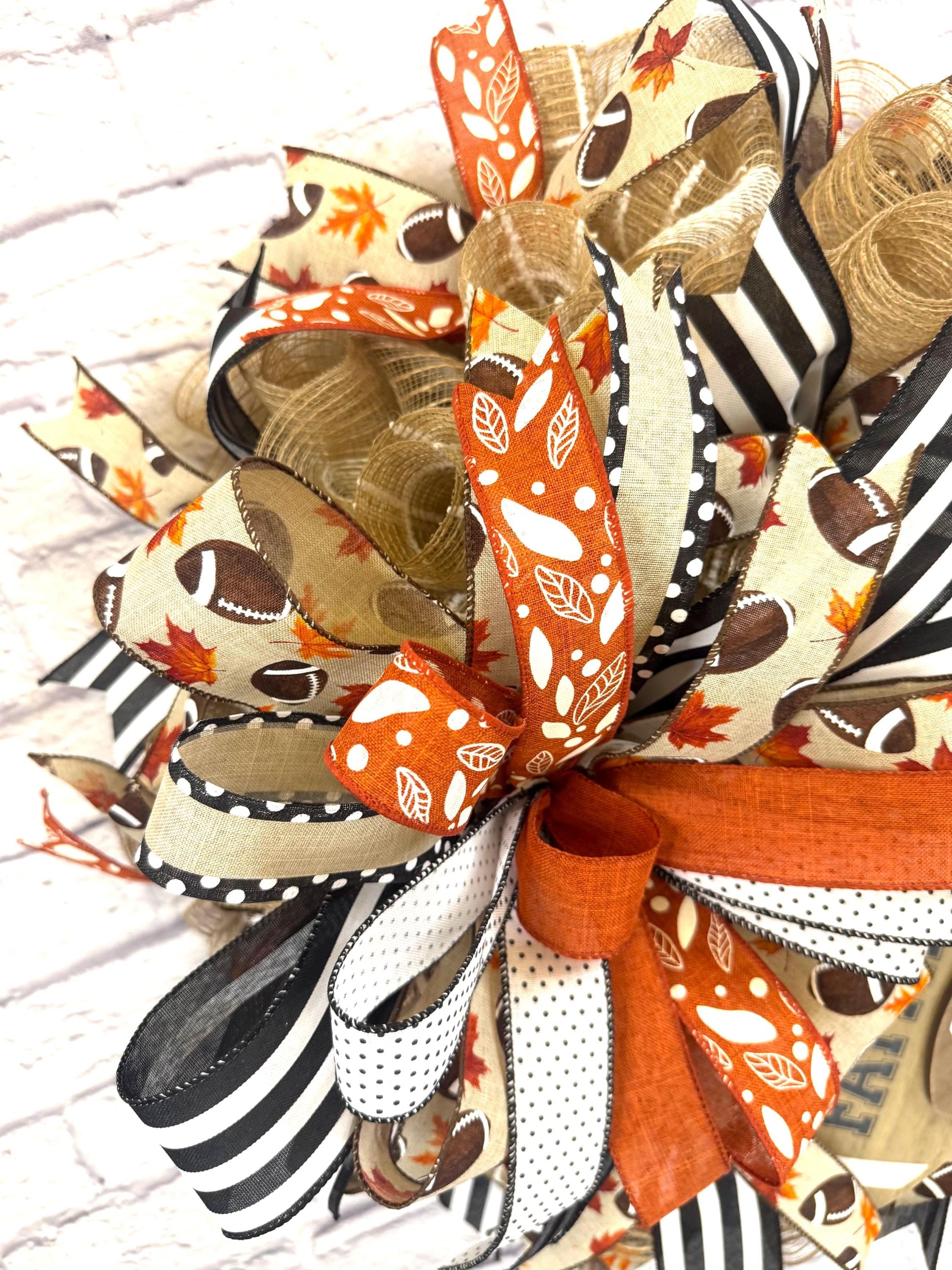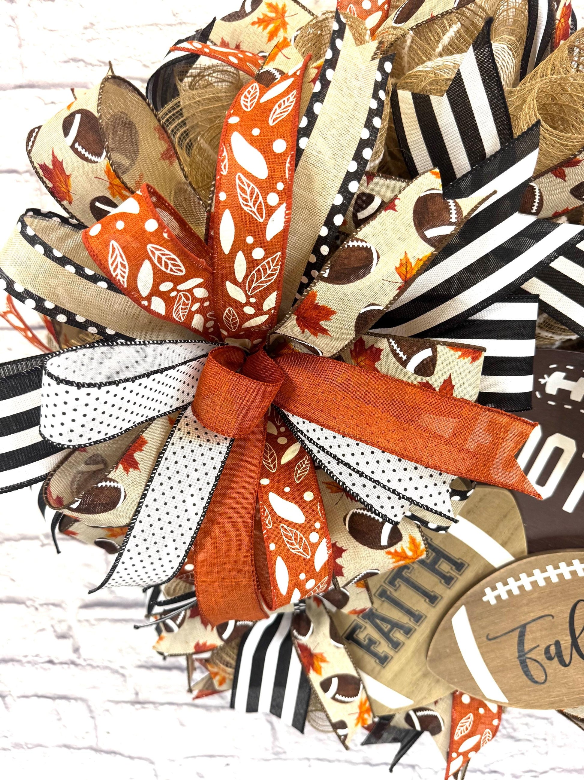 At the center, a trio of football signs reads: “Faith, Fall, Football” – the ultimate fall mantra for sports-loving families. A large bow in orange, polka dot, stripe, and football-themed ribbons ties it all together, making this wreath a true statement piece for your door.