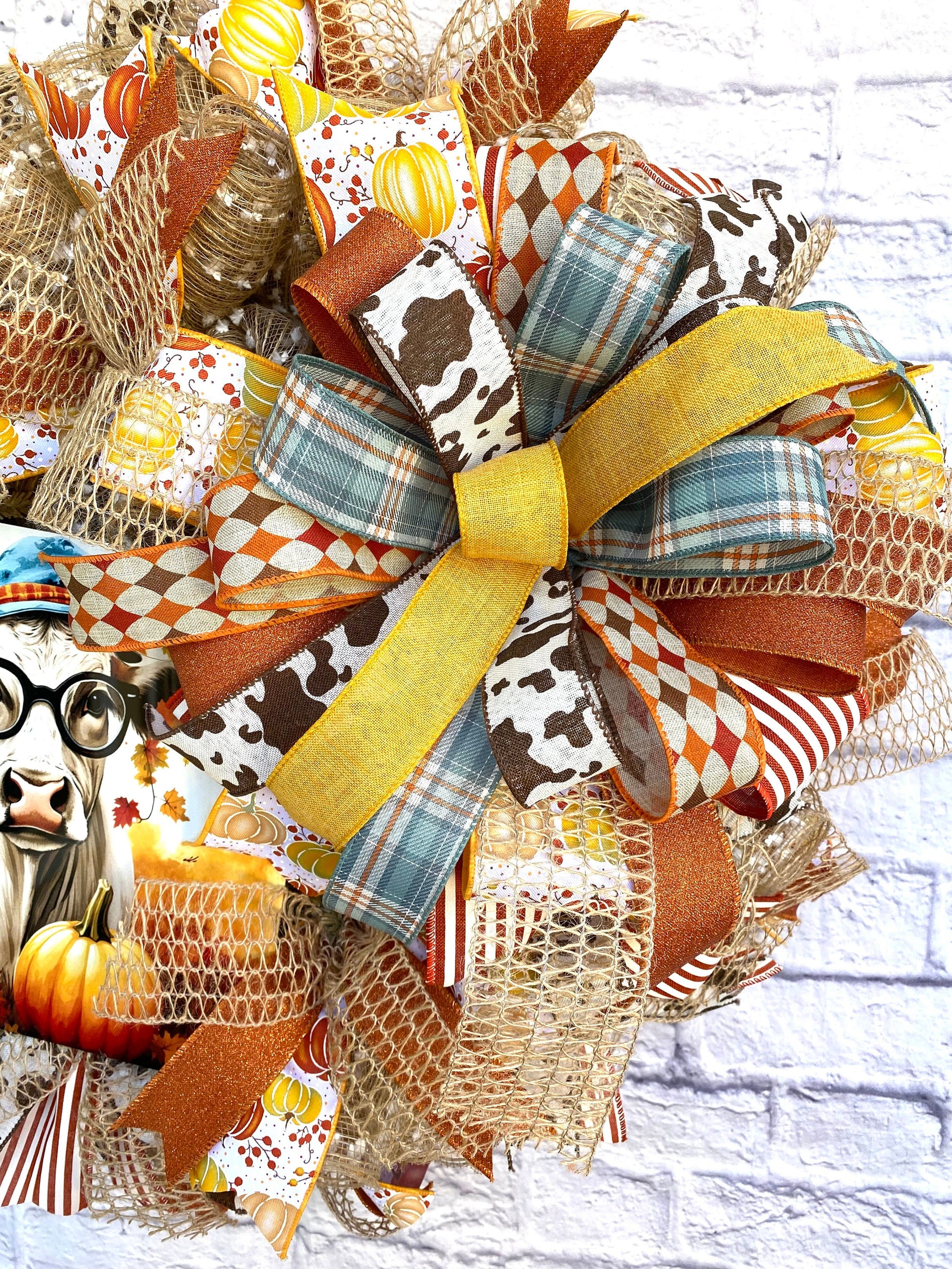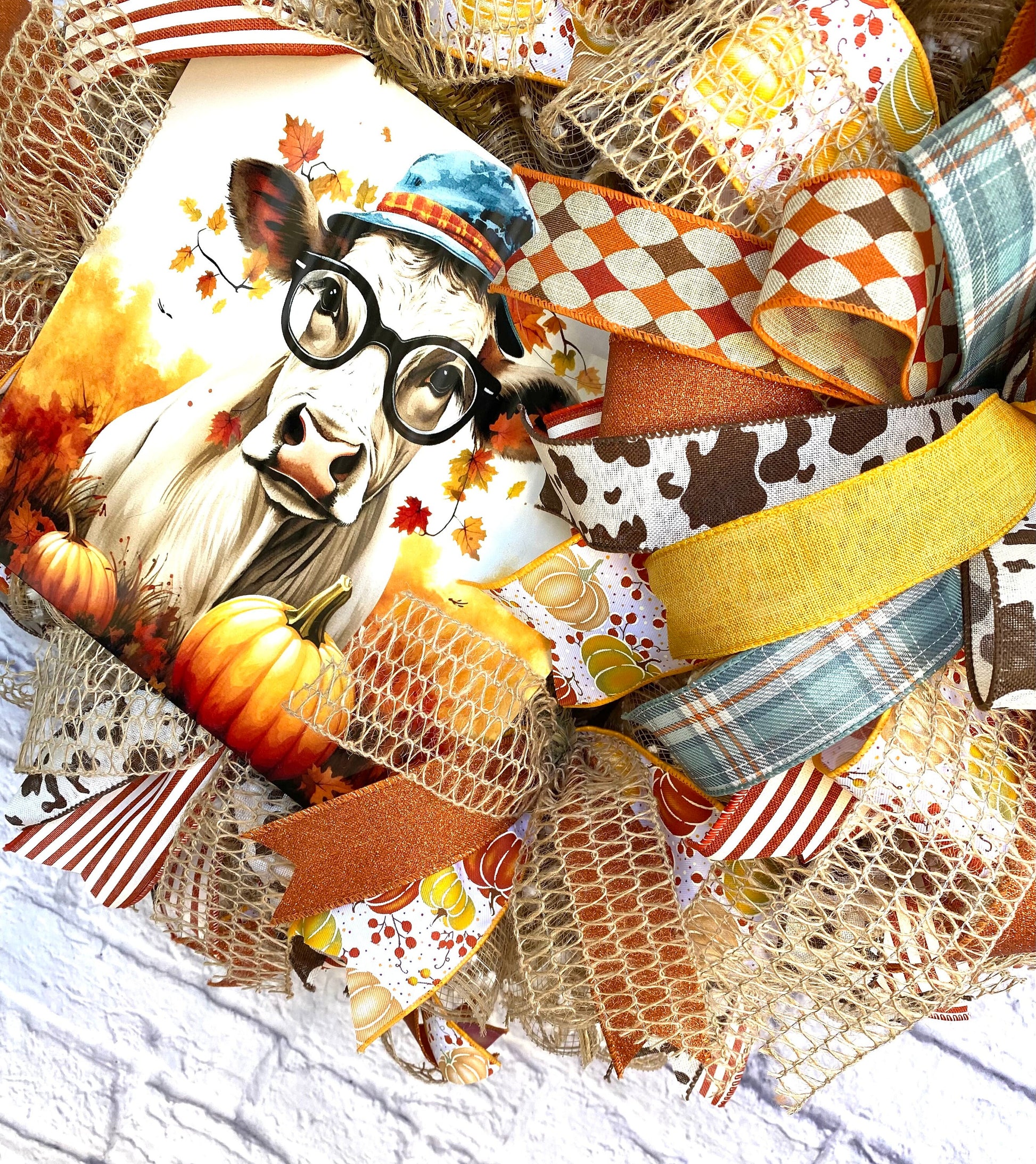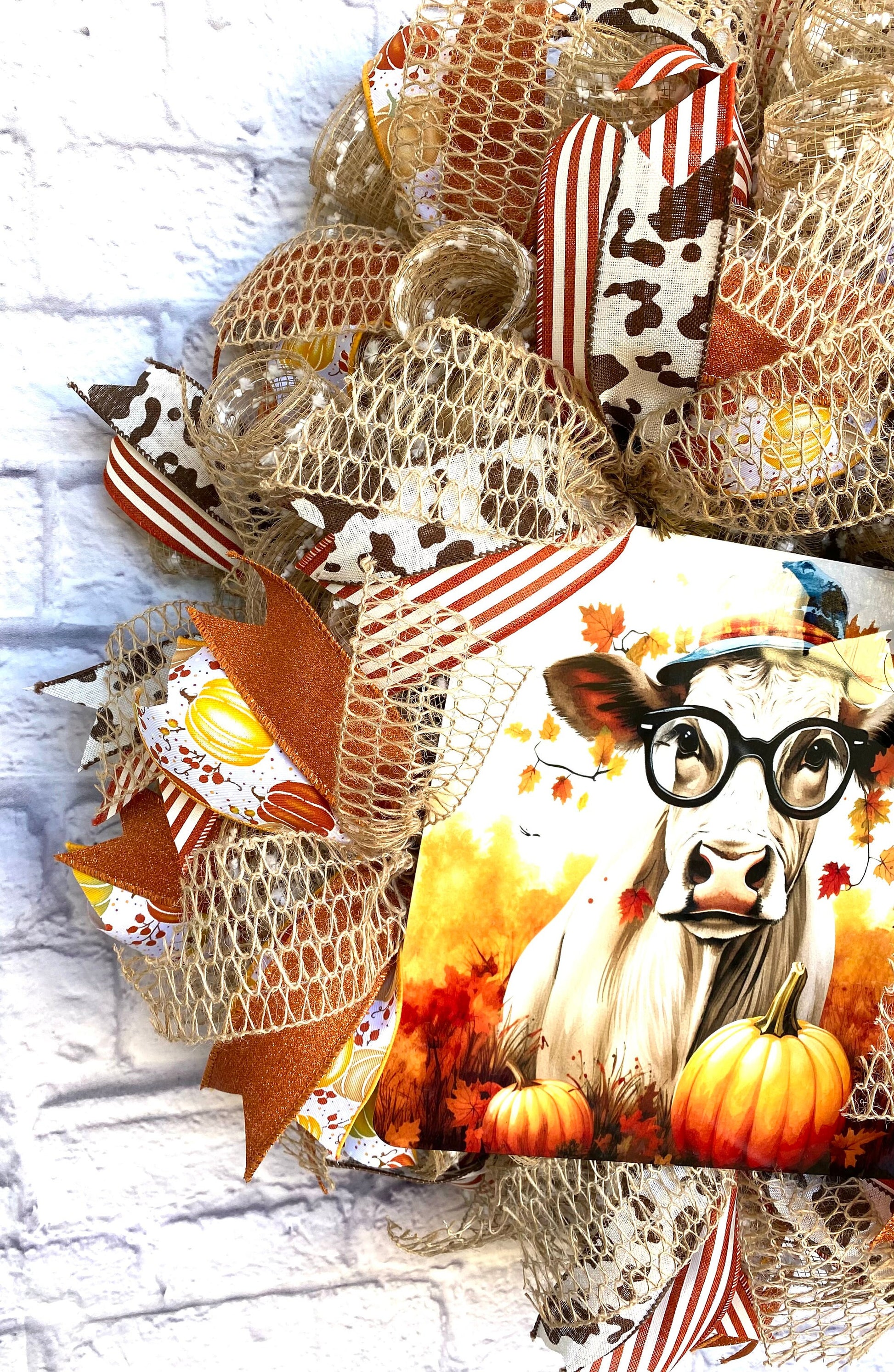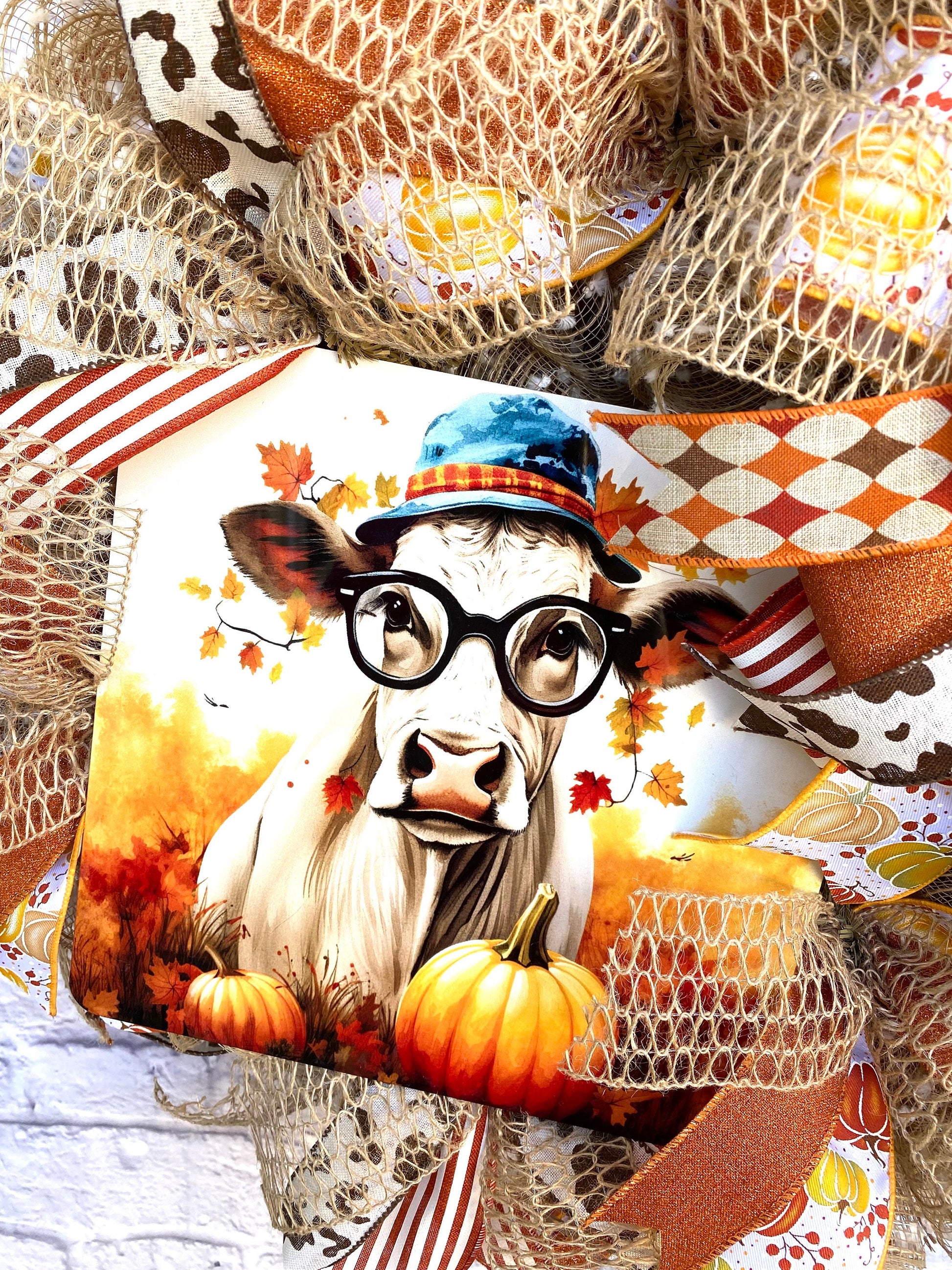 - Adorable Cow Centerpiece: The centerpiece of the wreath is an adorable cow wearing glasses and a hat, surrounded by pumpkins and autumn leaves, bringing a whimsical touch to your fall decor.