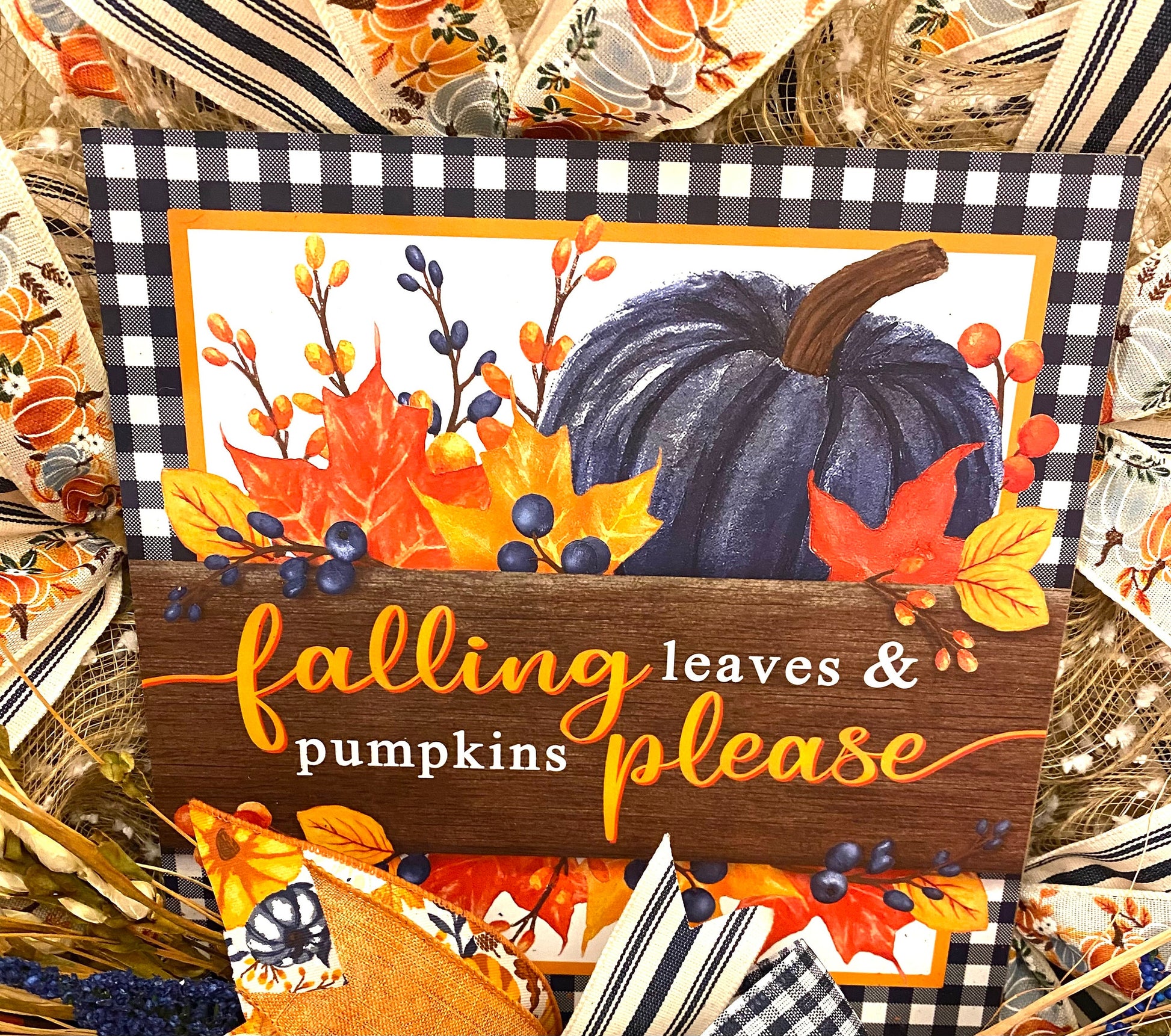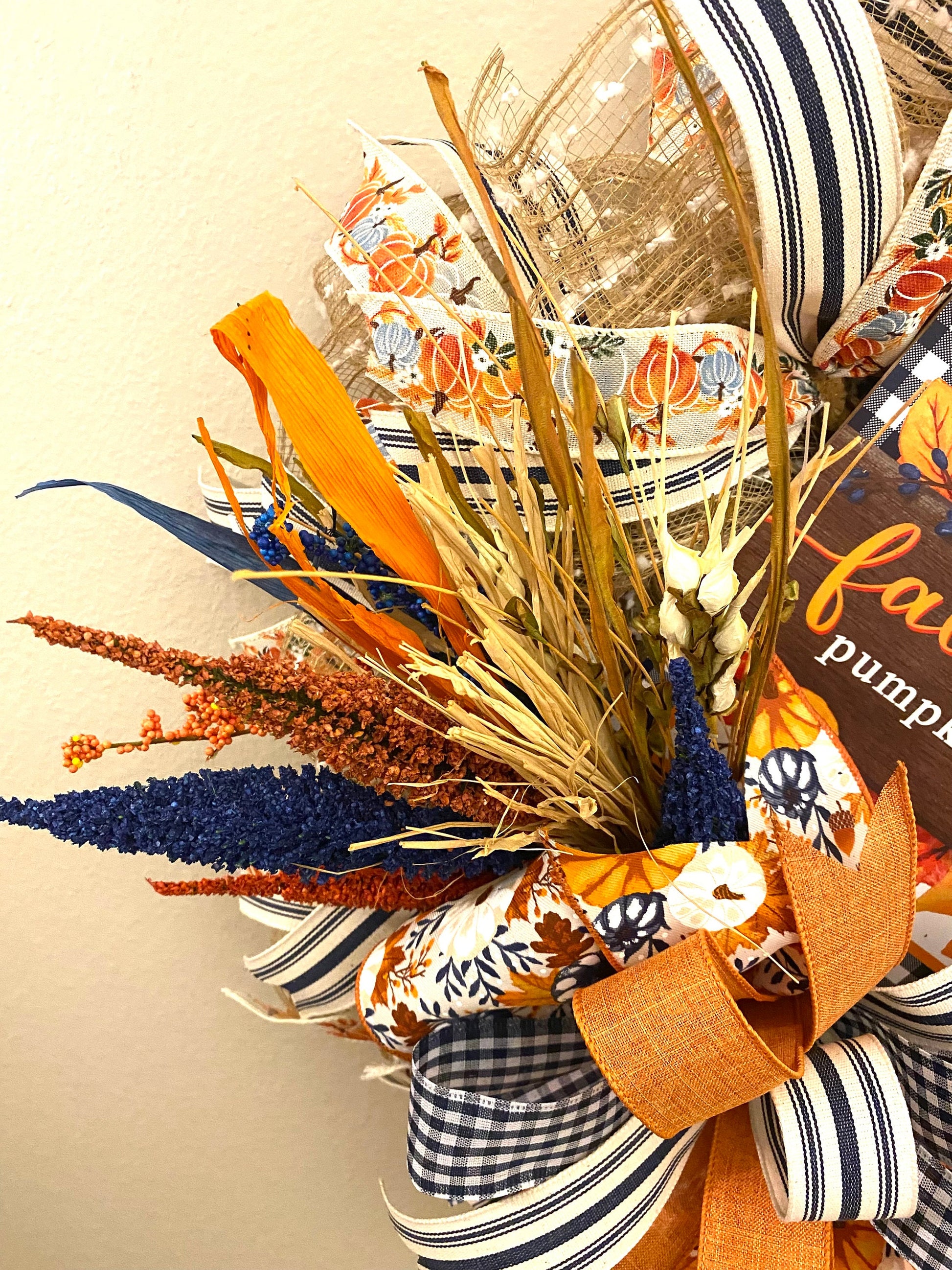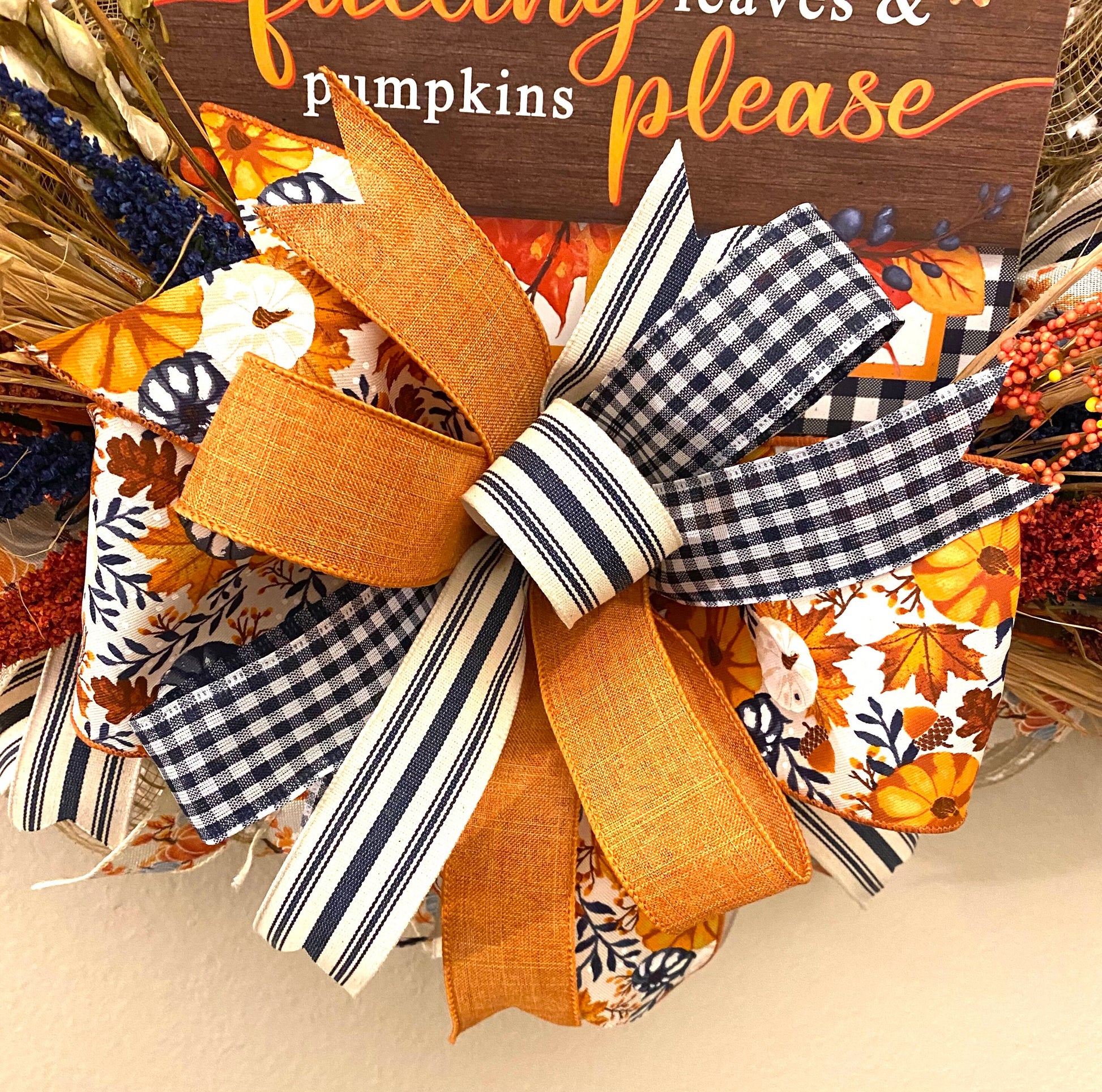 This beautiful handmade Autumn or Fall Farmhouse style wreath is made on a red und flat wood wreath frame and beige jute mesh with white stripes. It is embellished with a wood sign with pumpkins and leaves and states “Falling Leaves & Pumpkins Please”, wired ribbon in the fall colors burnt orange, dusty blue, navy blue, and cream in various prints, and fall greenery. The wreath measures 24 inches in diameter and 6 inches in depth. This wreath is perfect to fit in between your door and storm door.