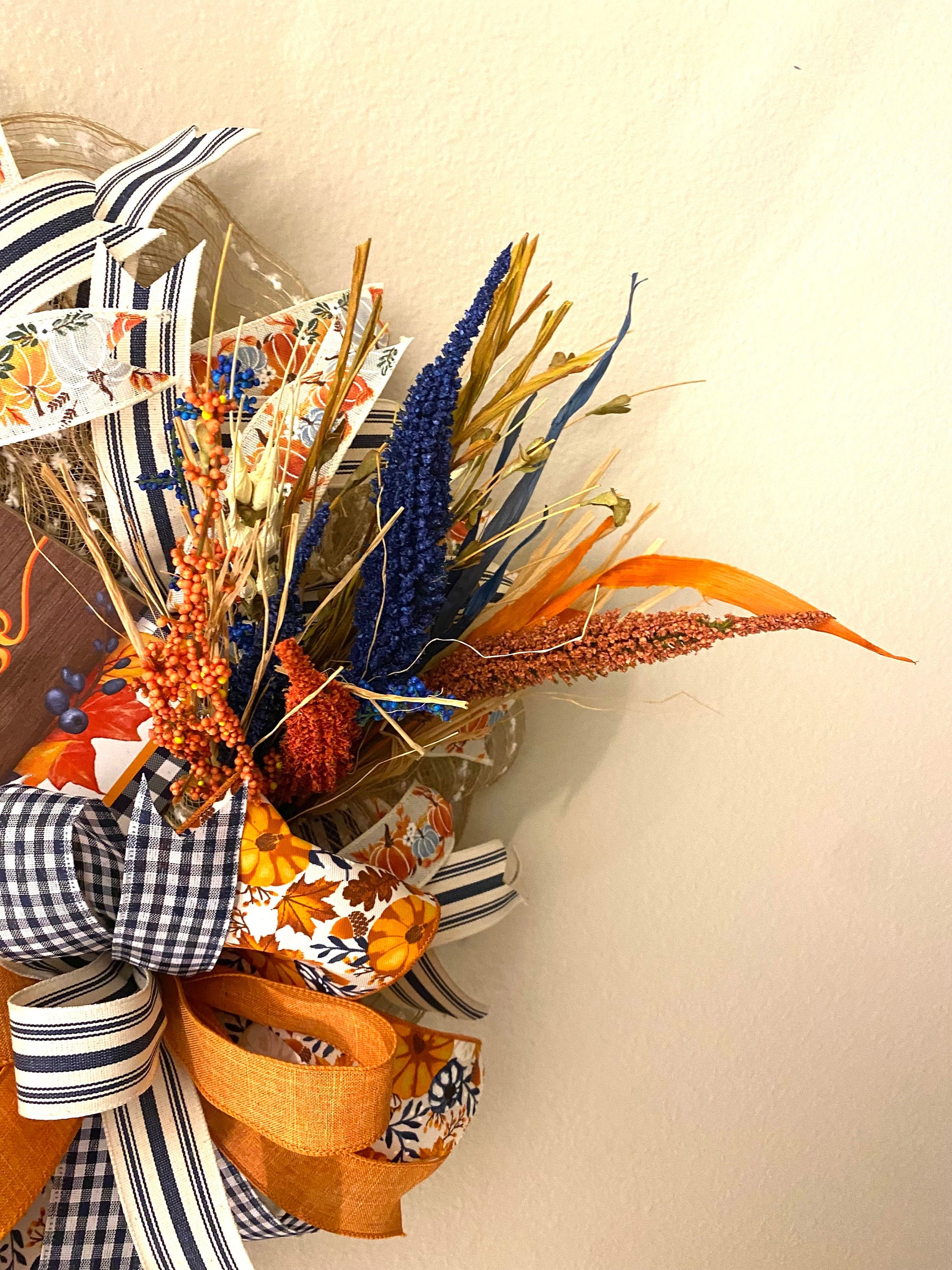 This Fall farmhouse wreath would be a great addition to your homes fall decorations. It would look wonderful hanging above a fireplace, on a wall, or front door all year long. This wreath would be perfect as a birthday, anniversary, housewarming, a just because gift, or a gift to yourself.