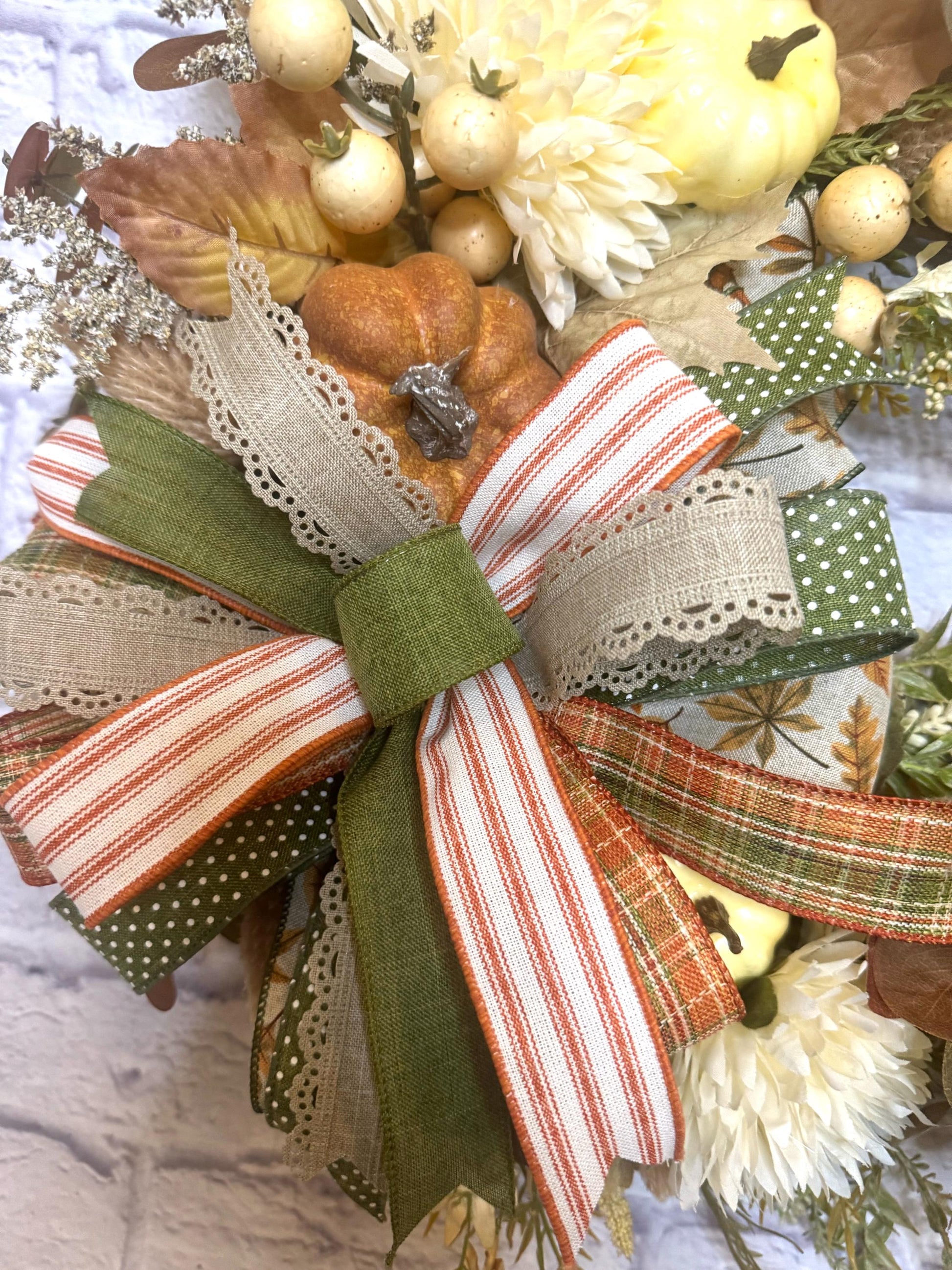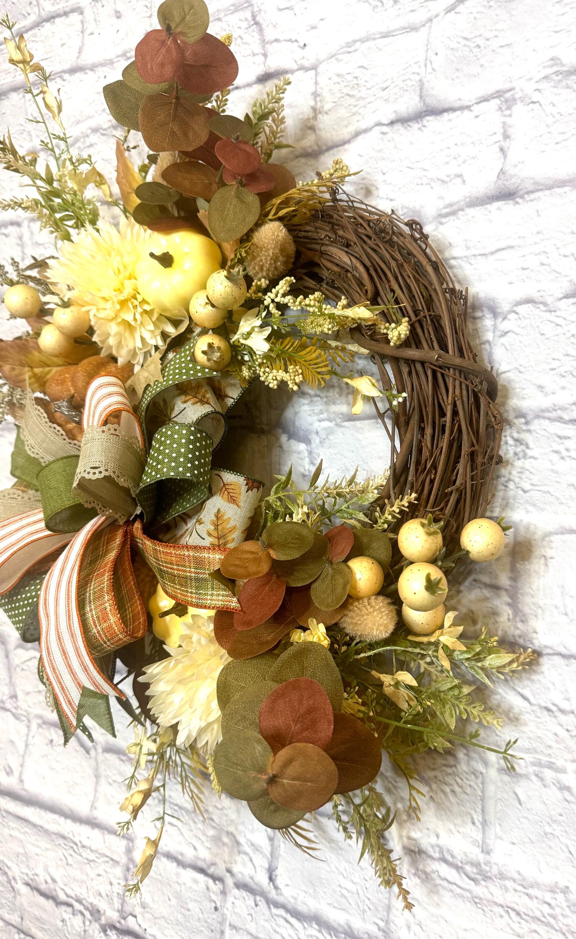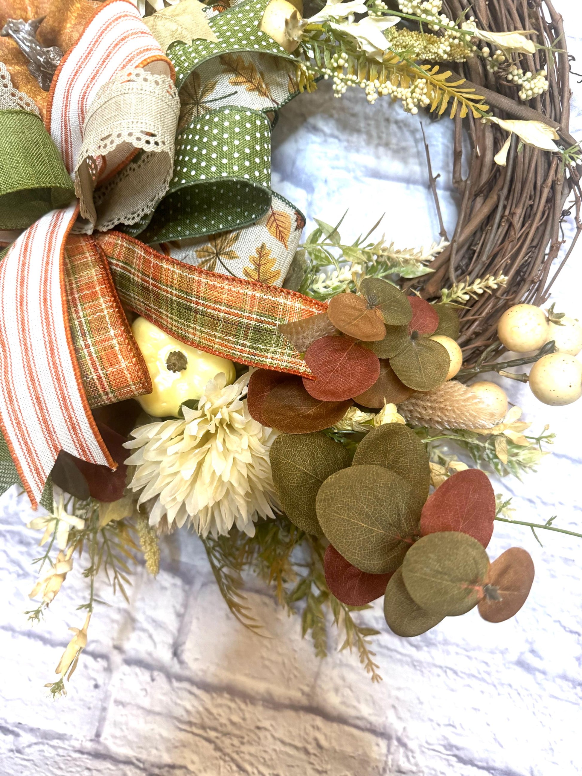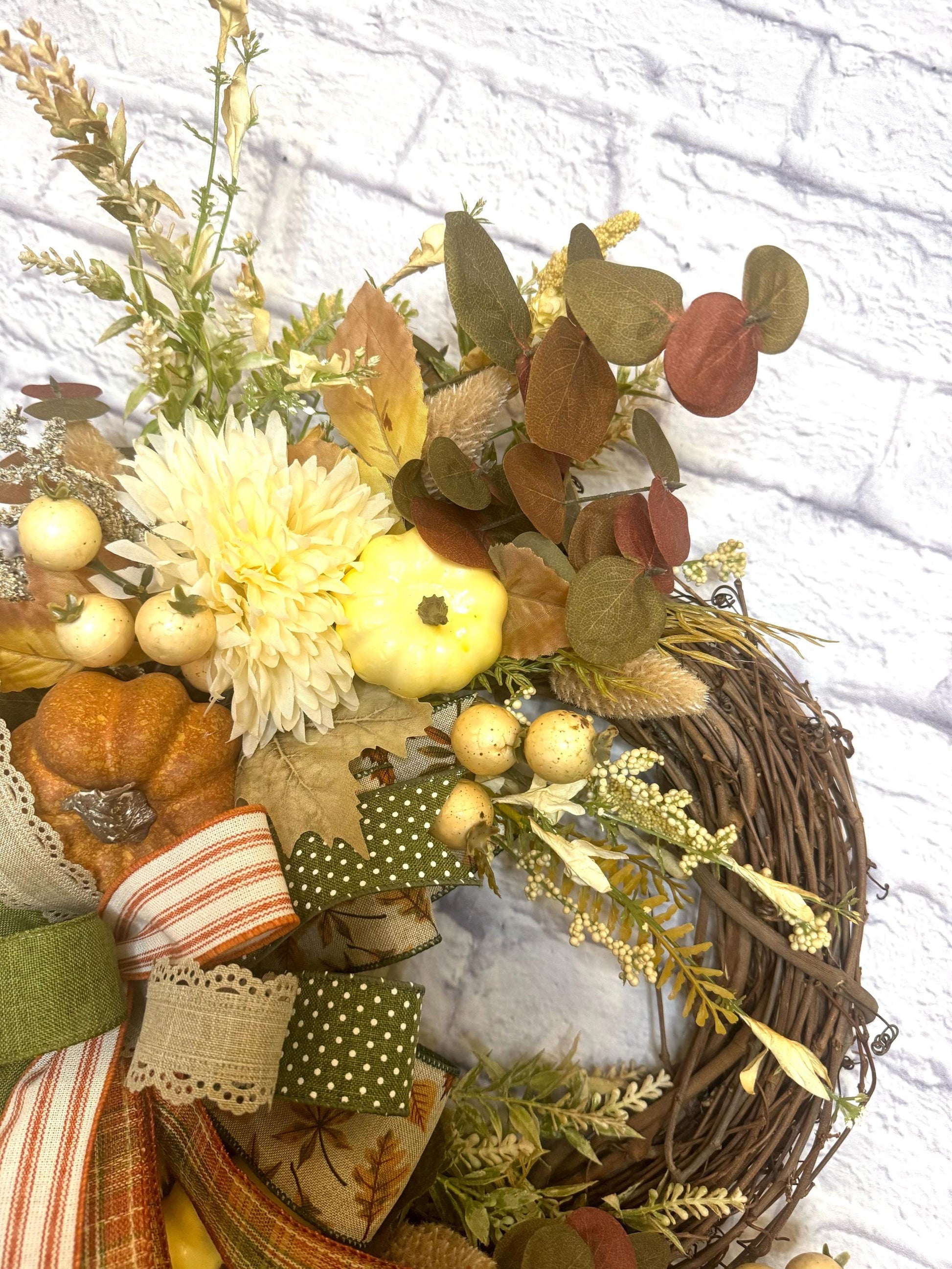 Celebrate the harvest season with this Handmade Fall Grapevine Wreath, a beautiful blend of rustic charm and autumn elegance. This stunning wreath features a mix of cream and green tones, highlighted by faux pumpkins, delicate florals, and a variety of greenery. The rustic fall themed ribbons add a touch of farmhouse style, making it an ideal decoration for your front door.