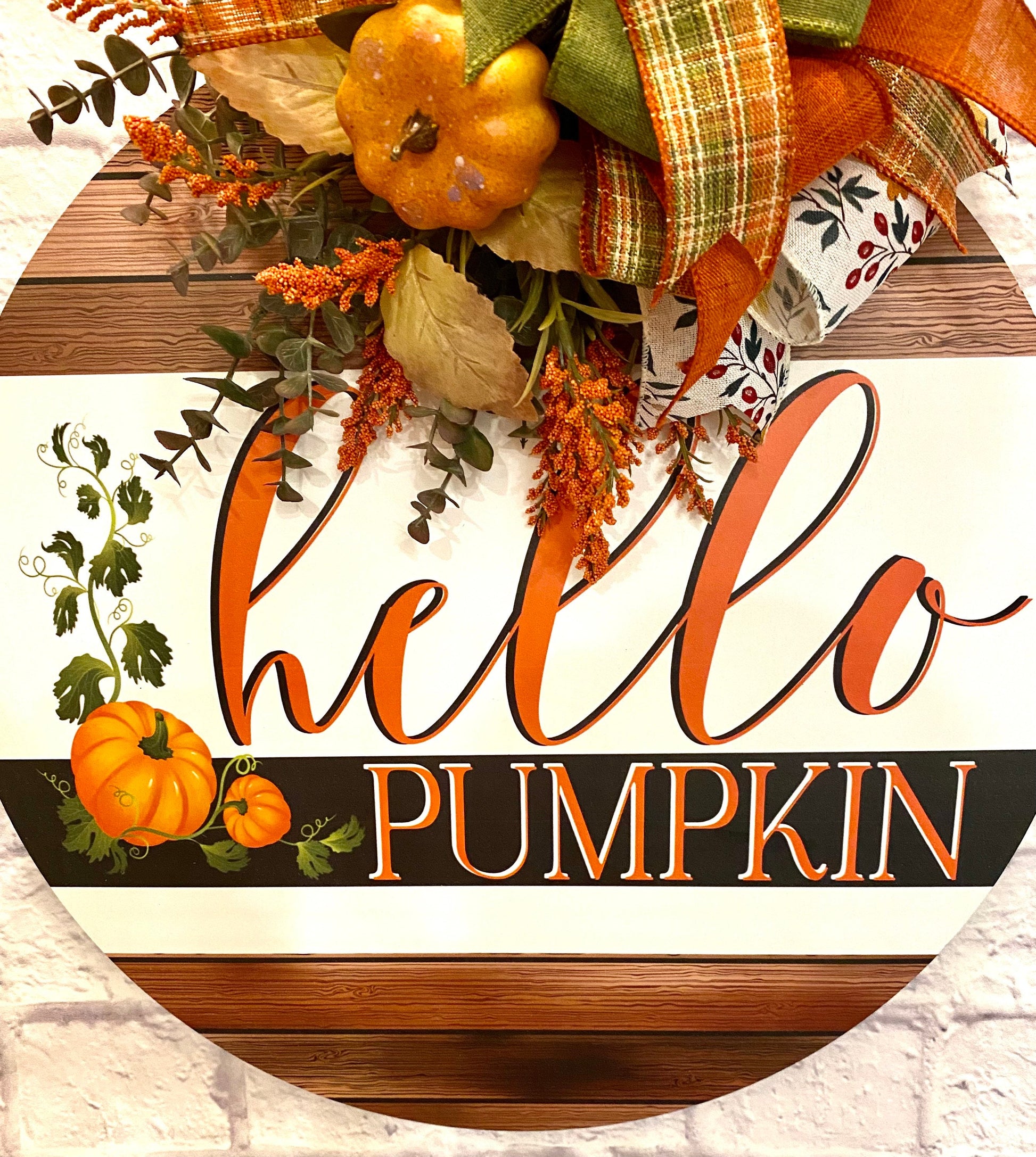 This beautiful Fall door hanger, is made with wood, printed in black, white, and orange, with a pumpkin and vines, and states “Hello Pumpkin”. The door hanger measures 18 inches in diameter, and 5 inches in depth. It is embellished with fall greenery, a pumpkin, fall florals, and a bow made with wired ribbon in cream, burnt orange, and green in various prints.