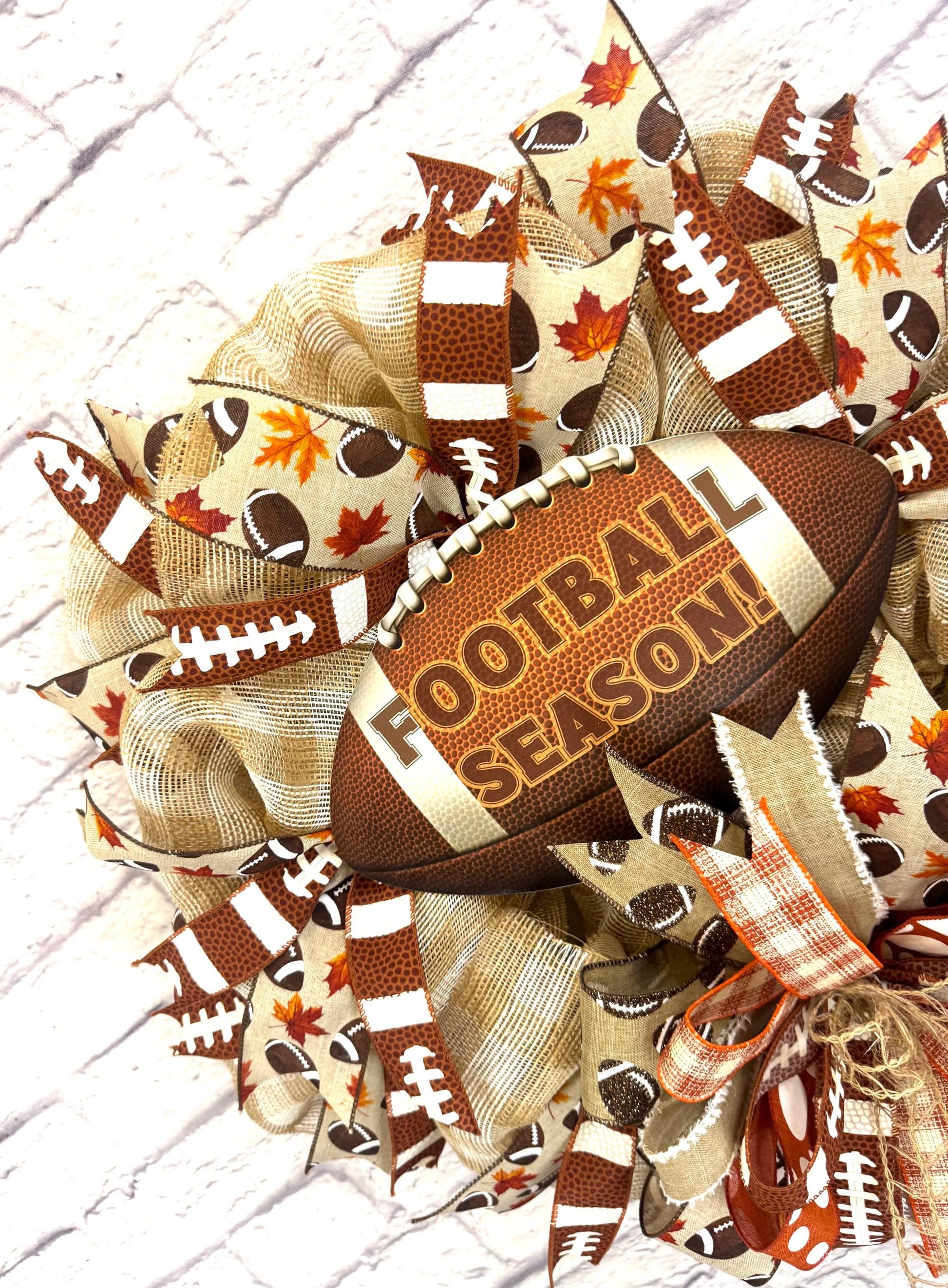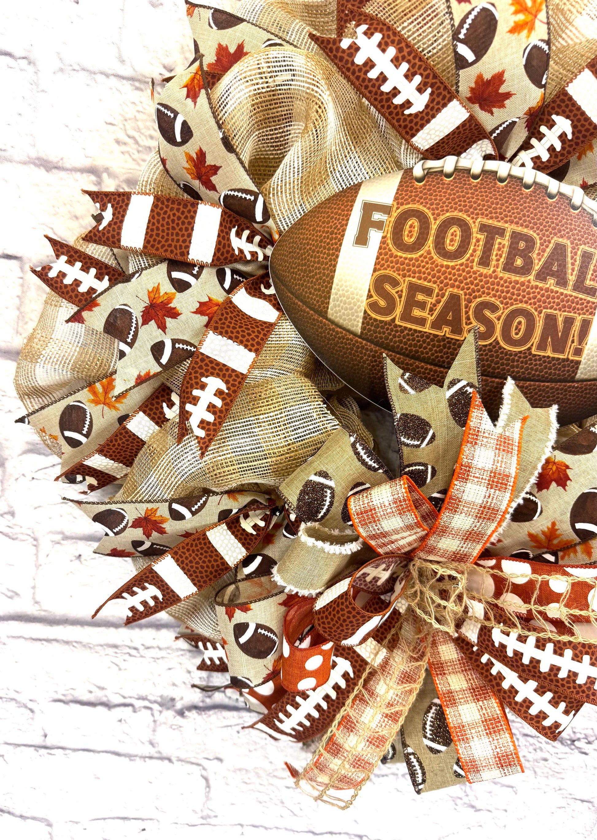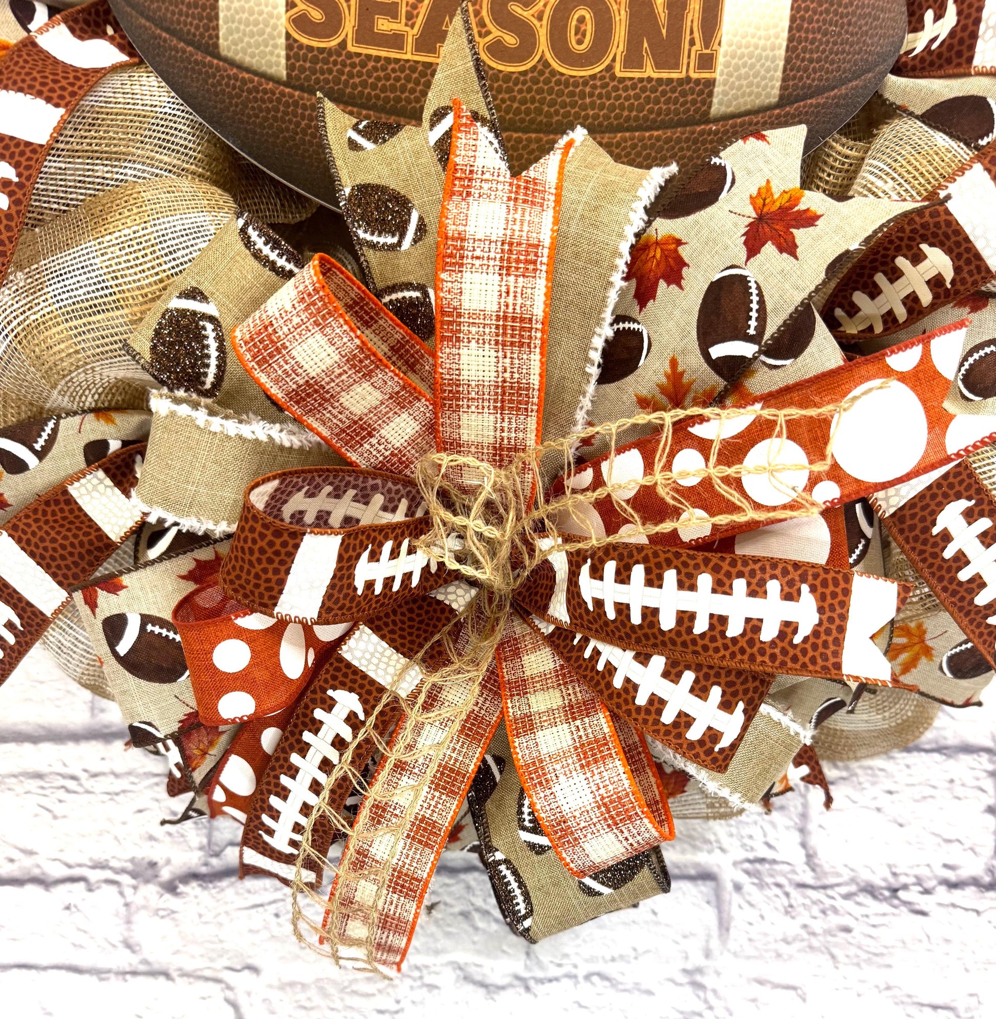 The centerpiece features a large plastic football sign that reads “FOOTBALL SEASON!” surrounded by mesh and ribbons decorated with footballs, stripes, polka dots, and autumn leaves. A layered bow in orange plaid, burlap, and football ribbon finishes the design with a bold seasonal flair.