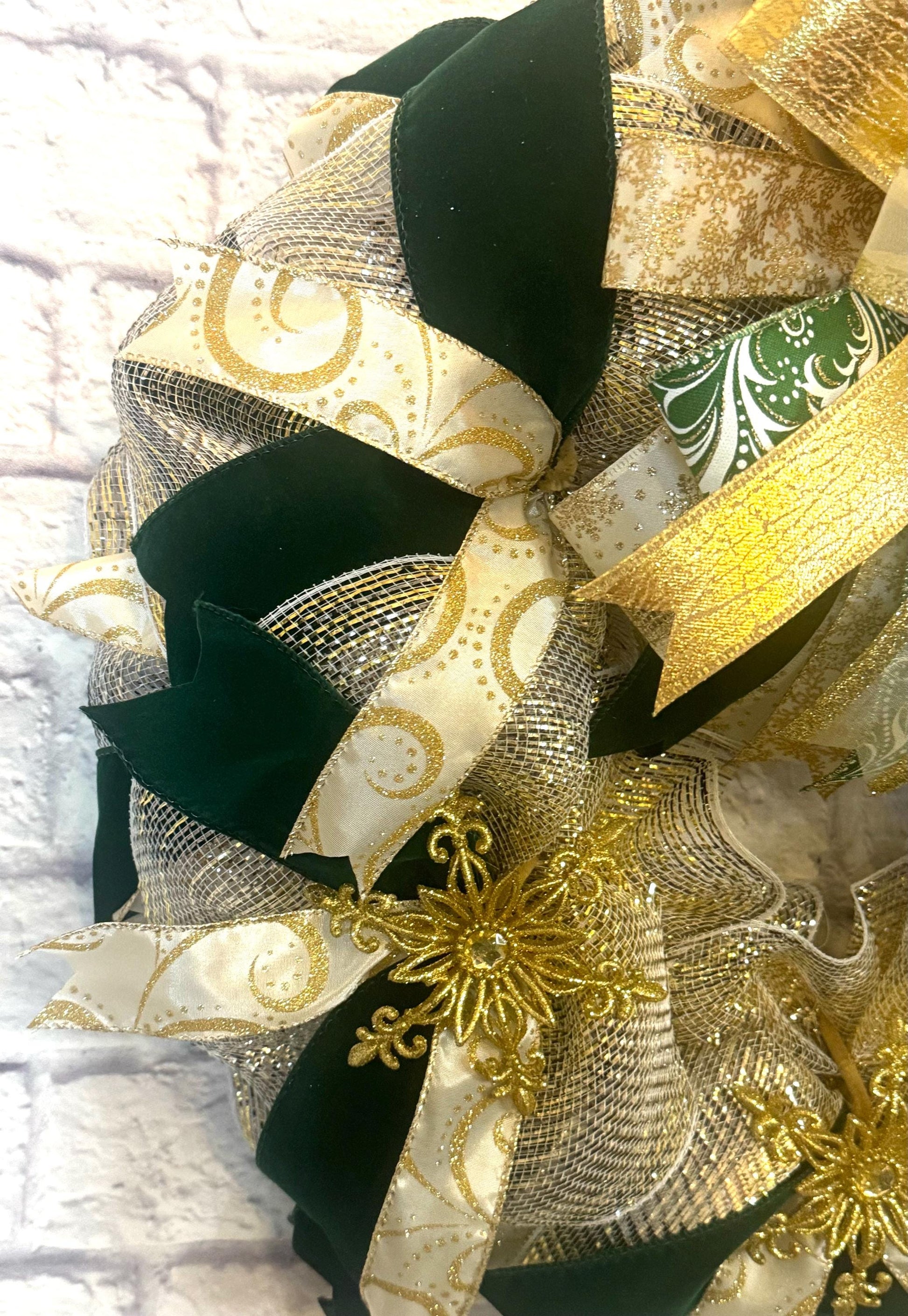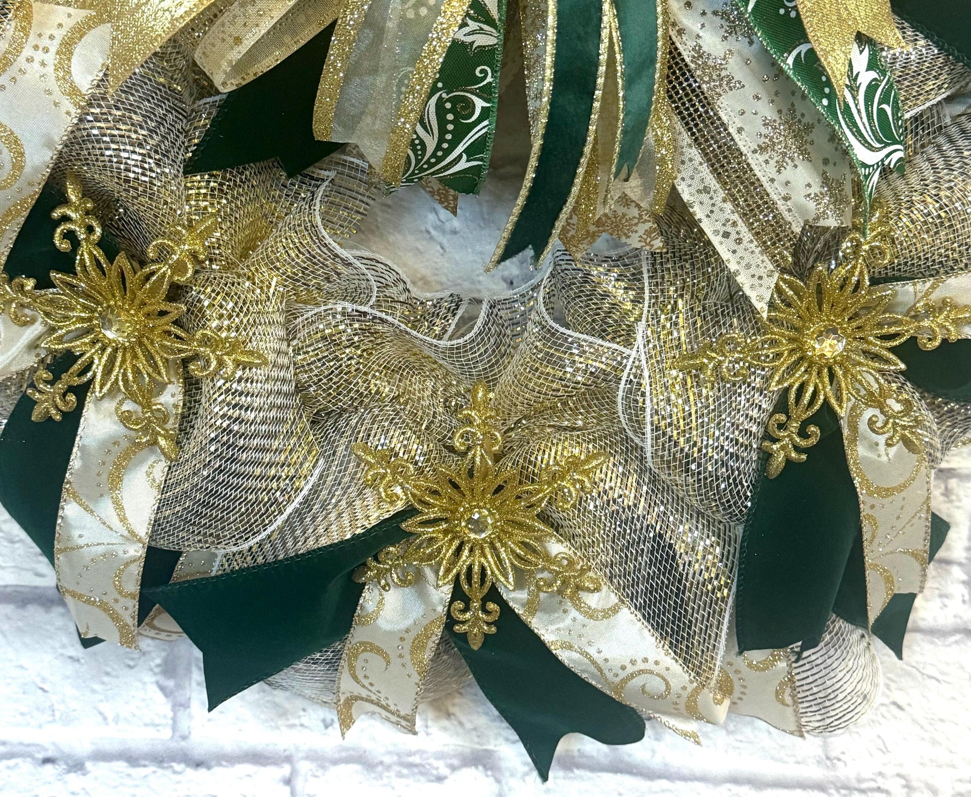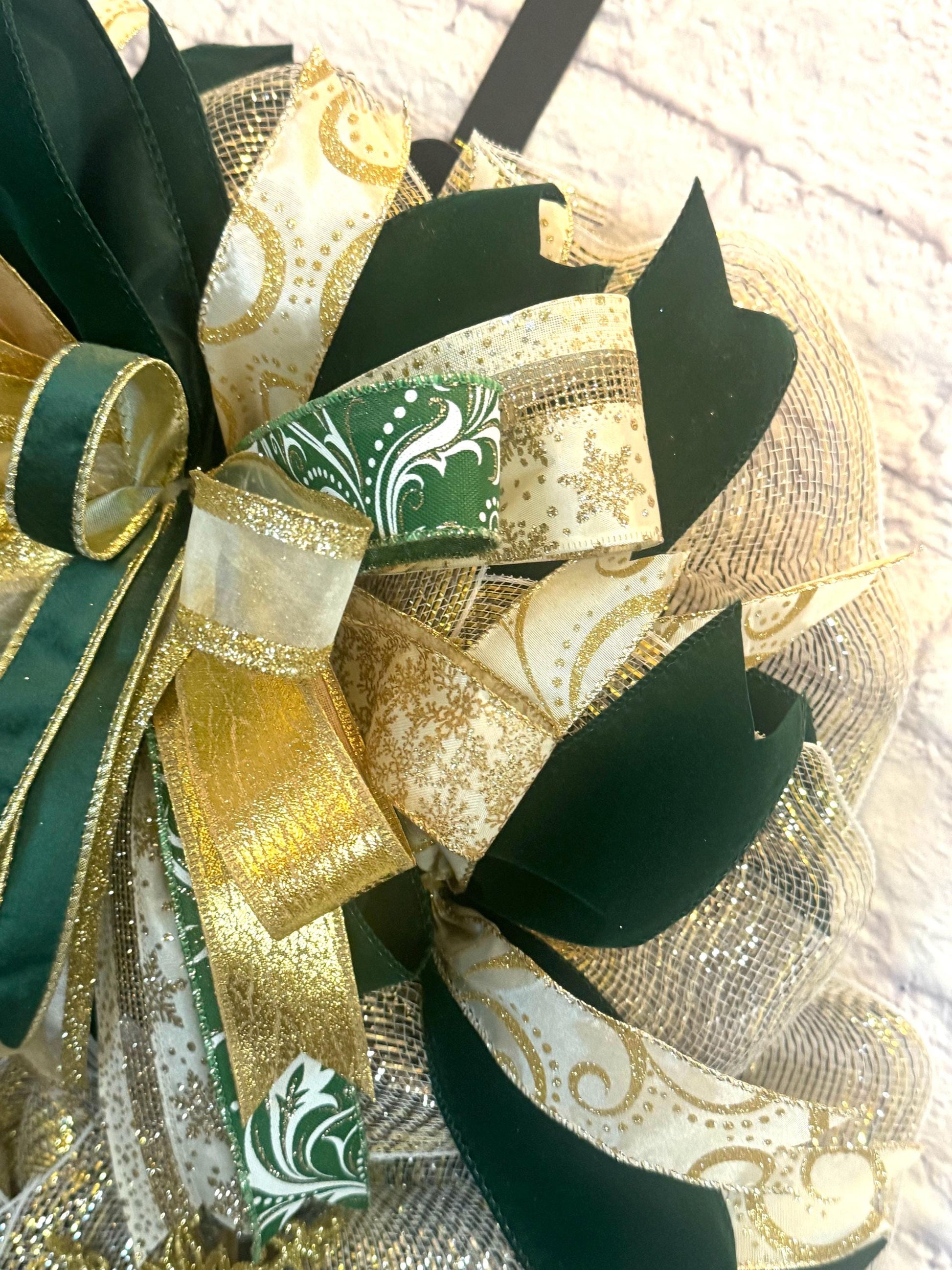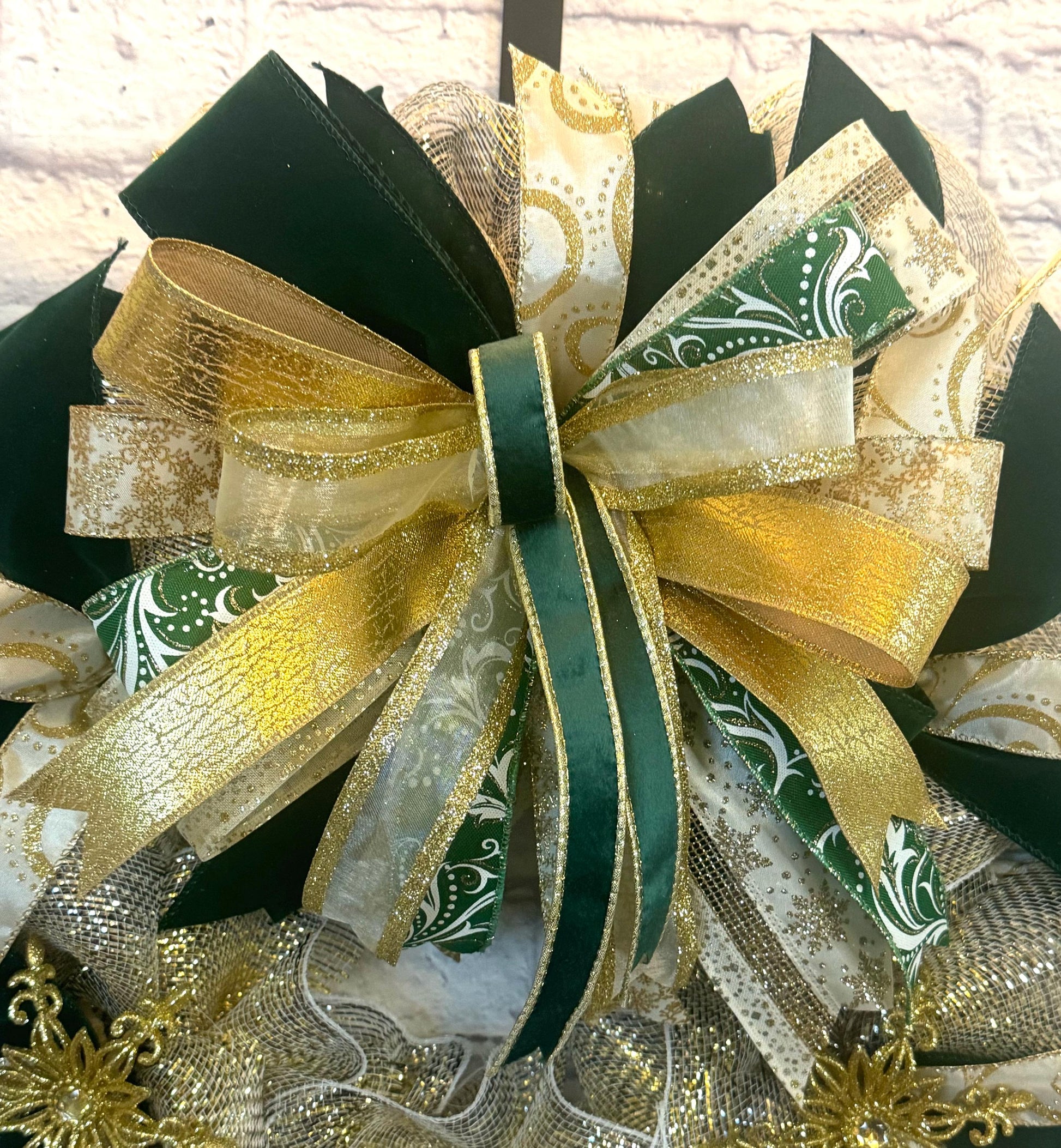 • Design: A mix of green and gold ribbons, gold glitter snowflakes, and mesh accents for a full, layered look.