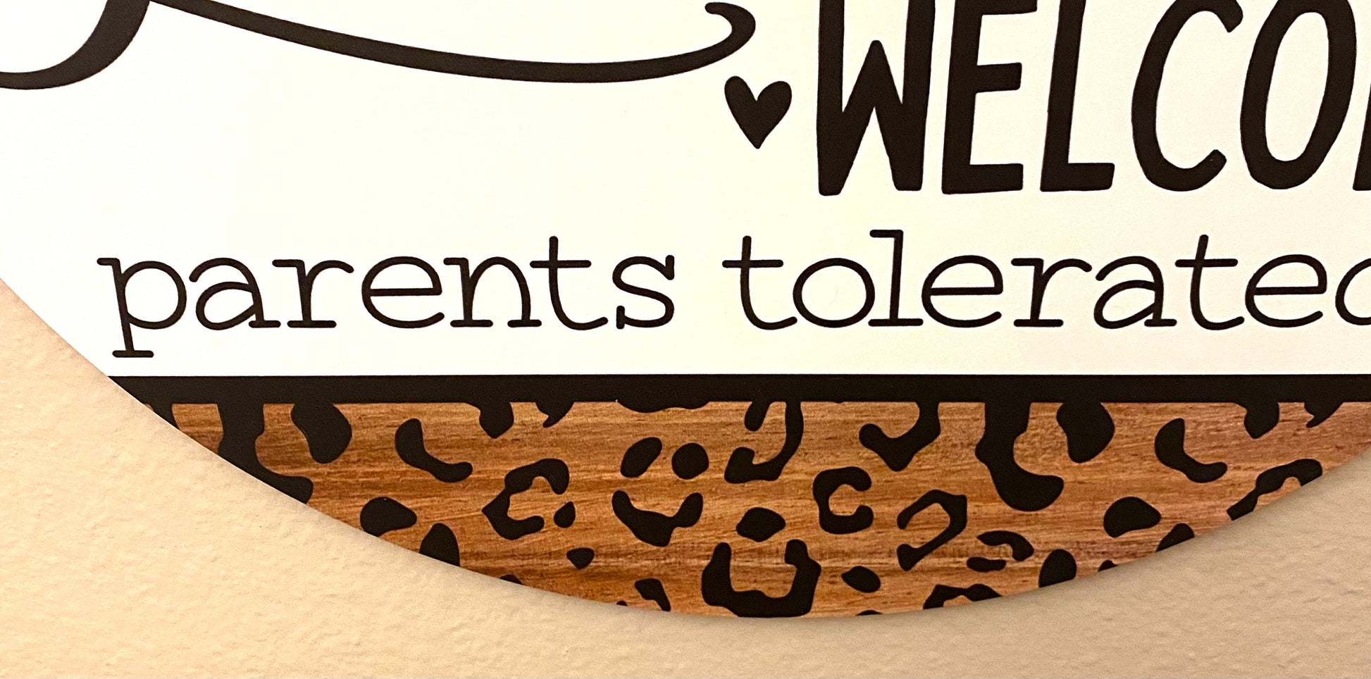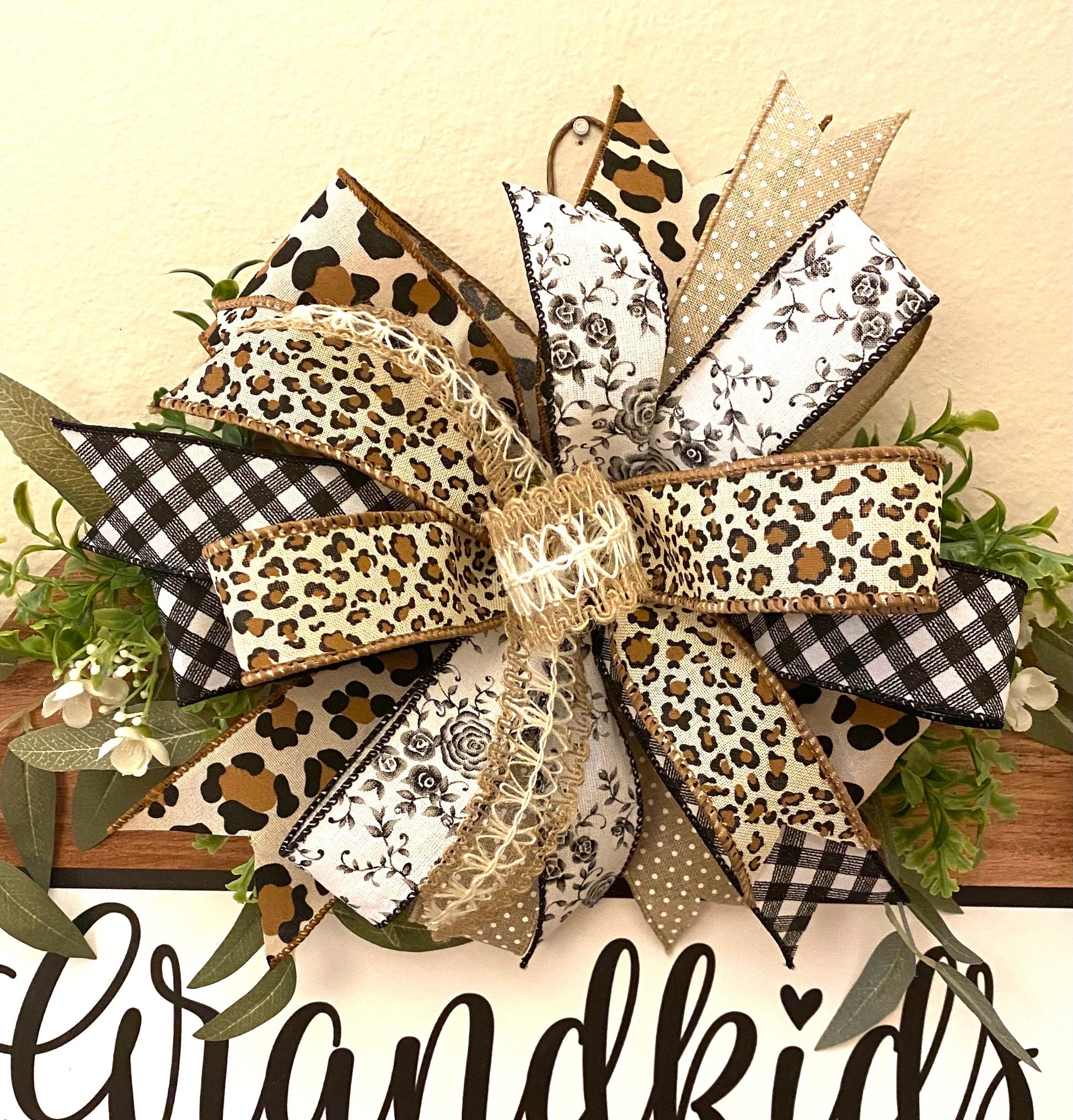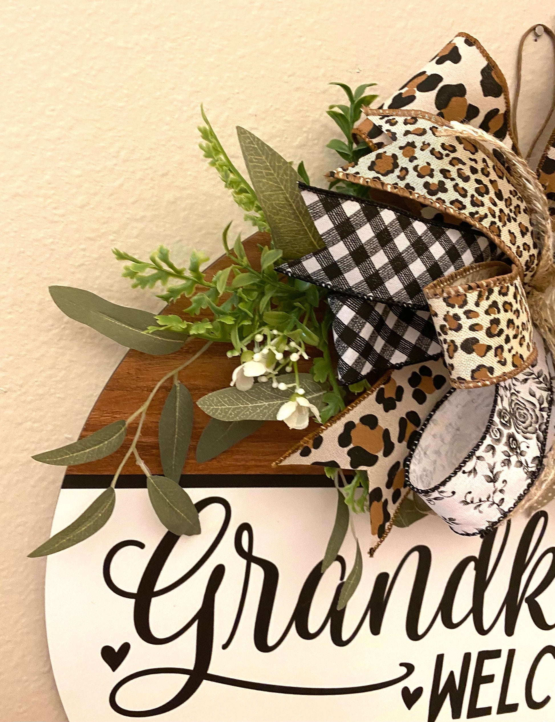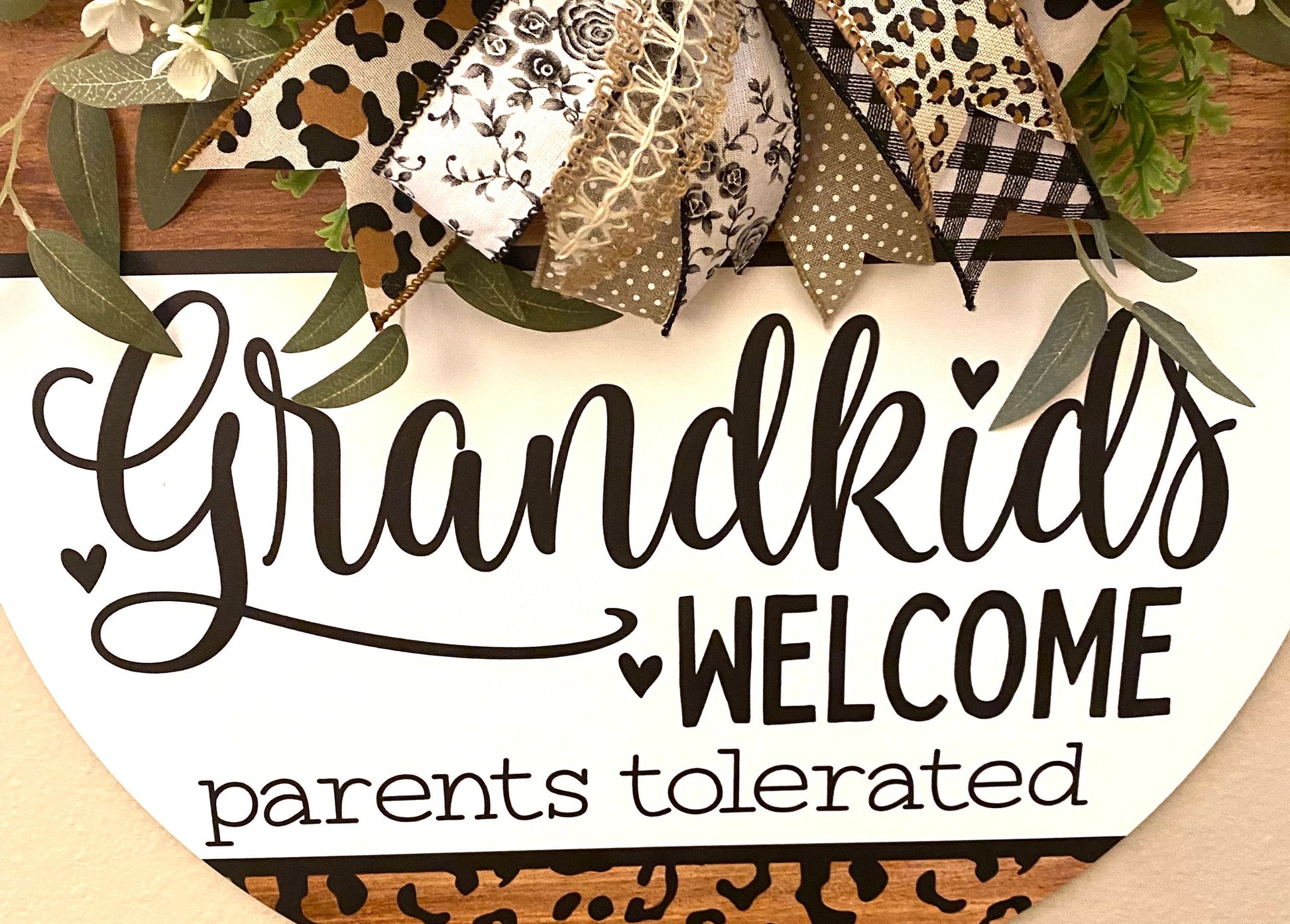 - Design: This round door hanger features a playful and heartwarming message: "Grandkids Welcome, Parents Tolerated." It's adorned with a beautiful, multi-patterned bow that combines leopard print, floral designs, and classic checkered patterns.