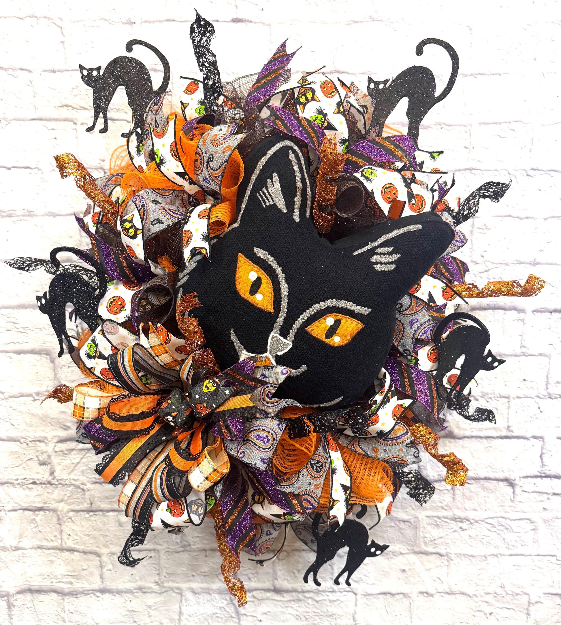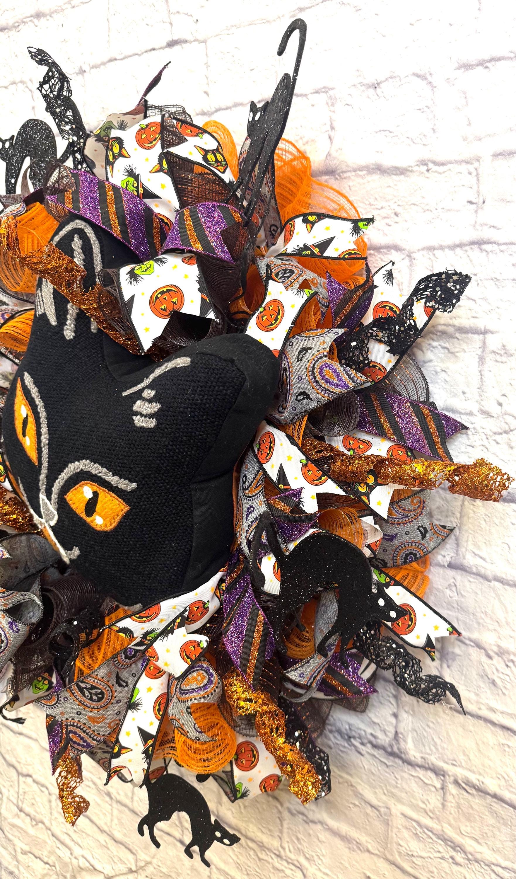 Bring spooky charm to your Halloween décor with this Black Cat Halloween Wreath! Featuring a bold plush black cat centerpiece with glowing orange eyes, surrounded by layers of festive ribbons, glitter, and playful black cat accents, this wreath is the perfect blend of spooky and fun.
