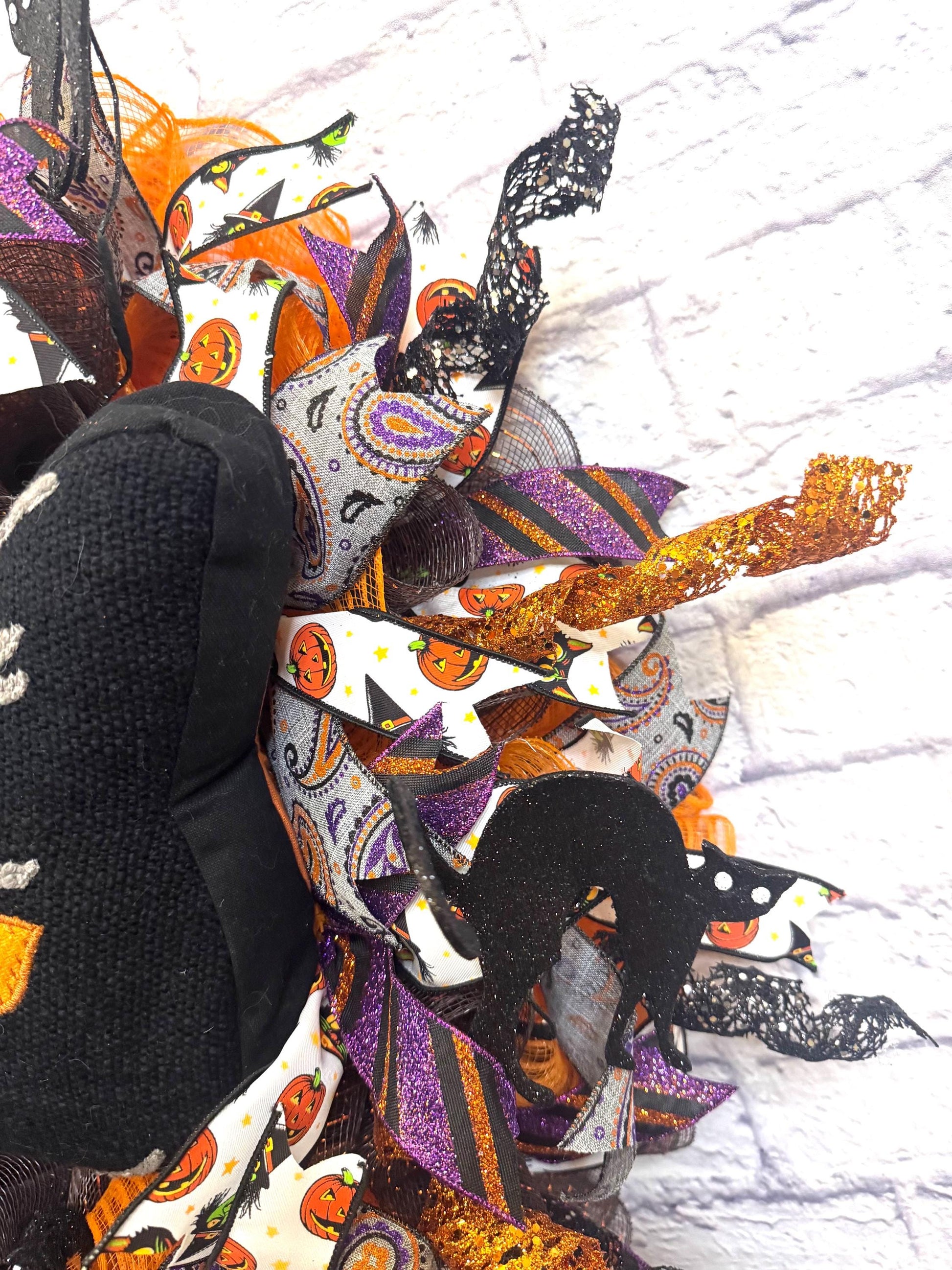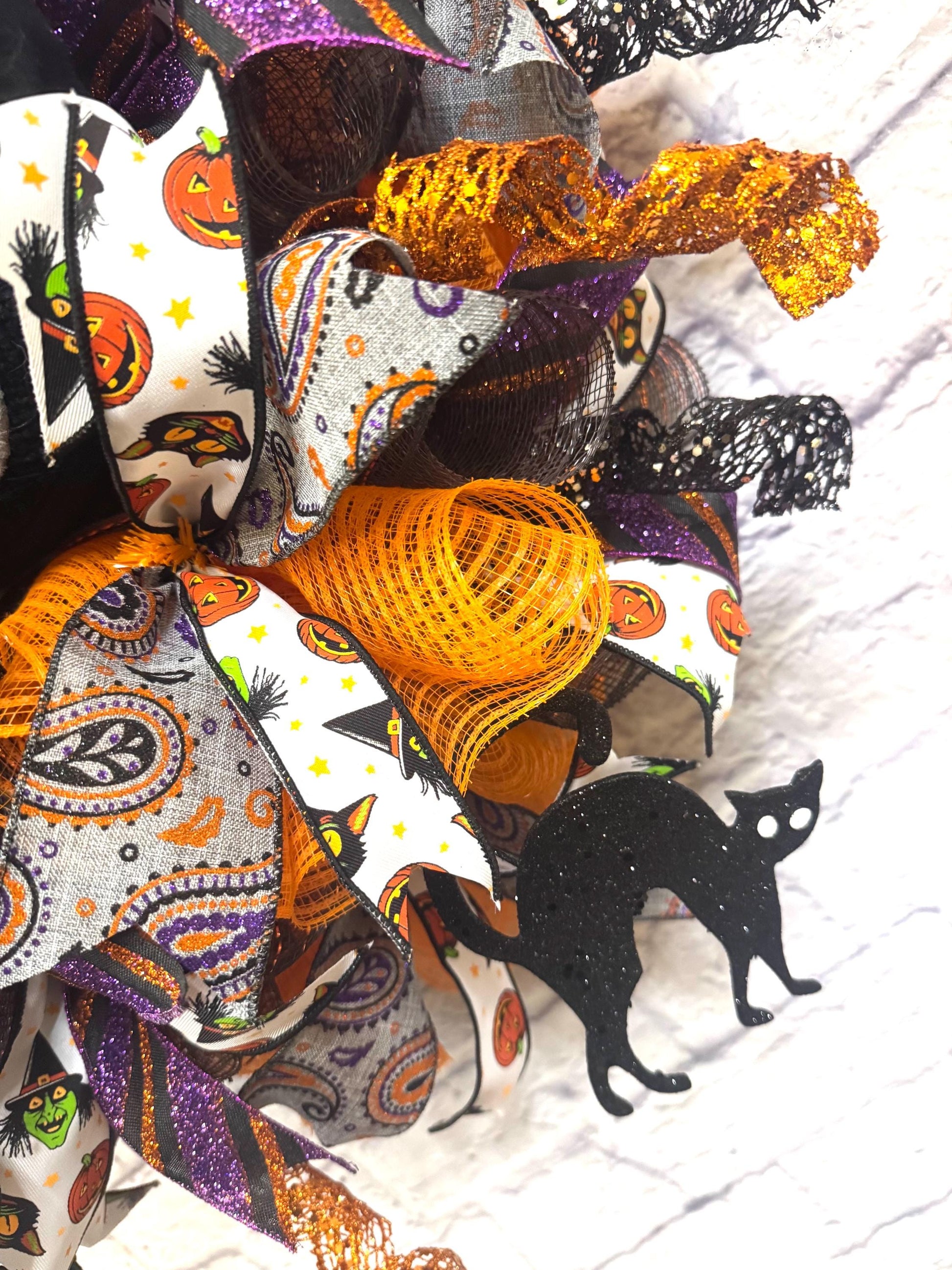 Handmade with Halloween-inspired ribbons in orange, black, purple, and plaid, along with glittered mesh and whimsical cat cutouts, this wreath is sure to be a standout on your front door, wall, or party space. Whether you love cats or just want a unique piece of Halloween décor, this wreath makes a bold seasonal statement.