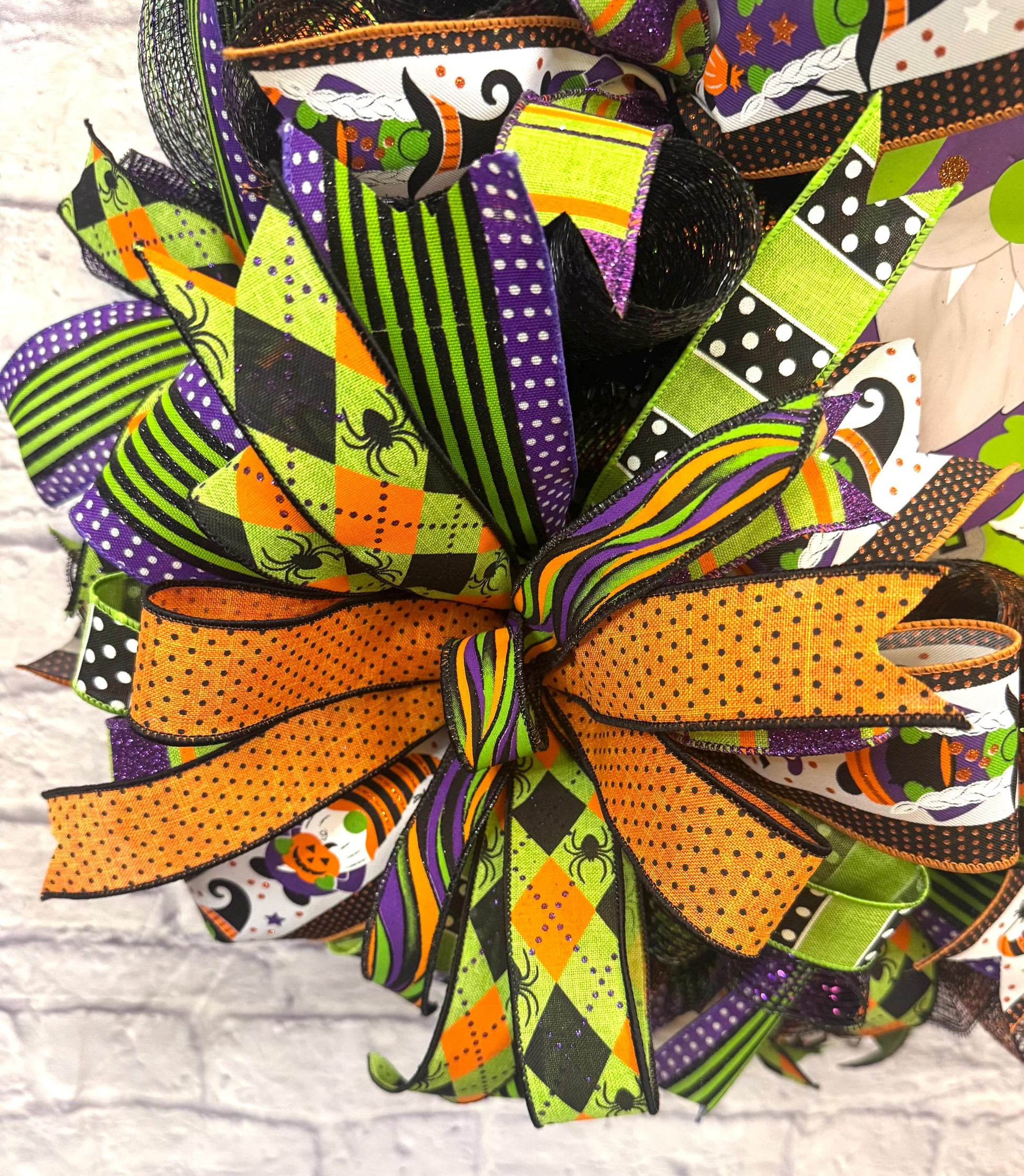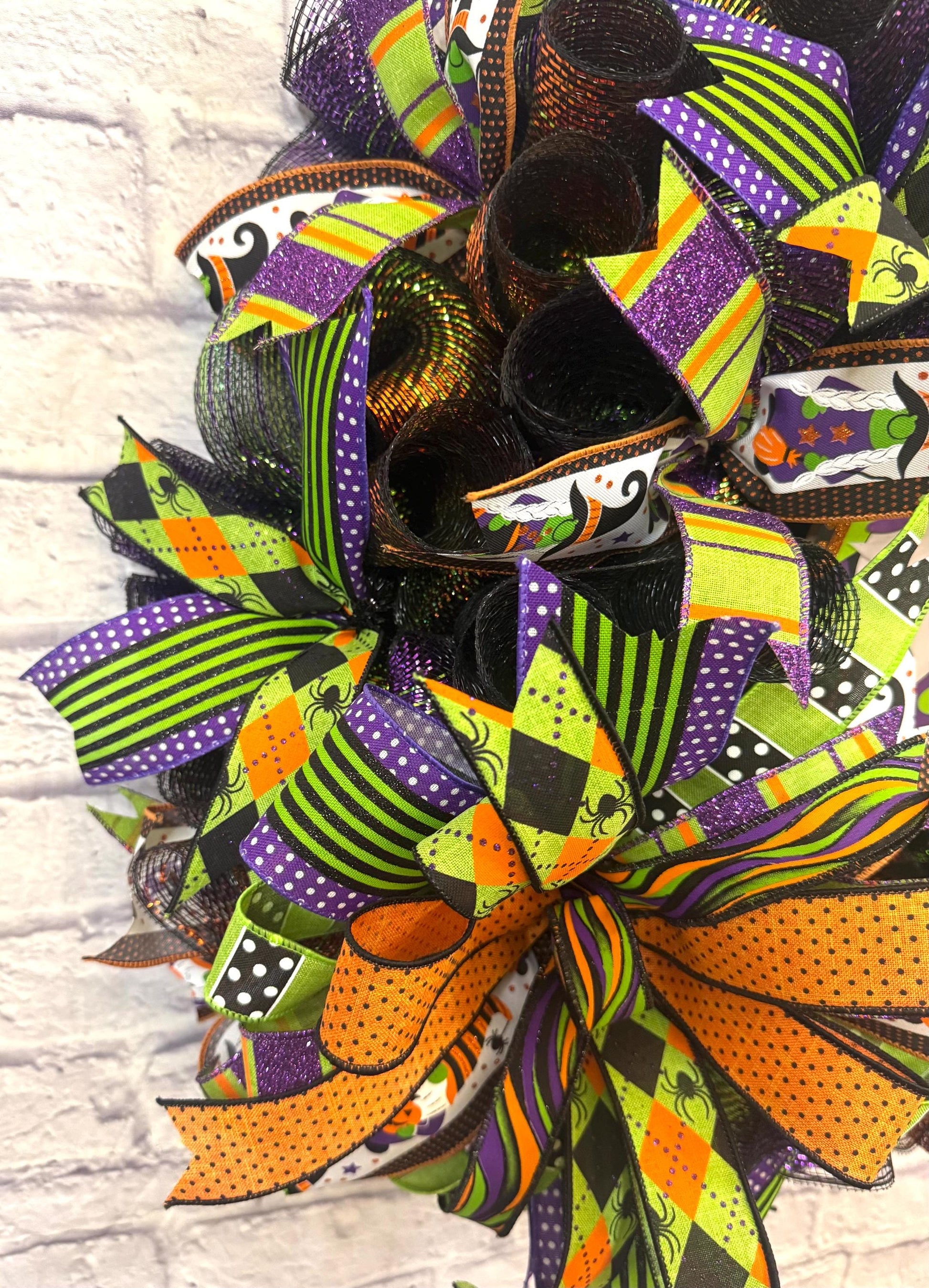 Handmade with layers of Halloween-themed ribbon in orange, green, purple, and black—along with glittery accents and a bold centerpiece sign—this wreath is perfect for your front door, porch, or party space. It’s a whimsical way to welcome trick-or-treaters and get into the spooky season.