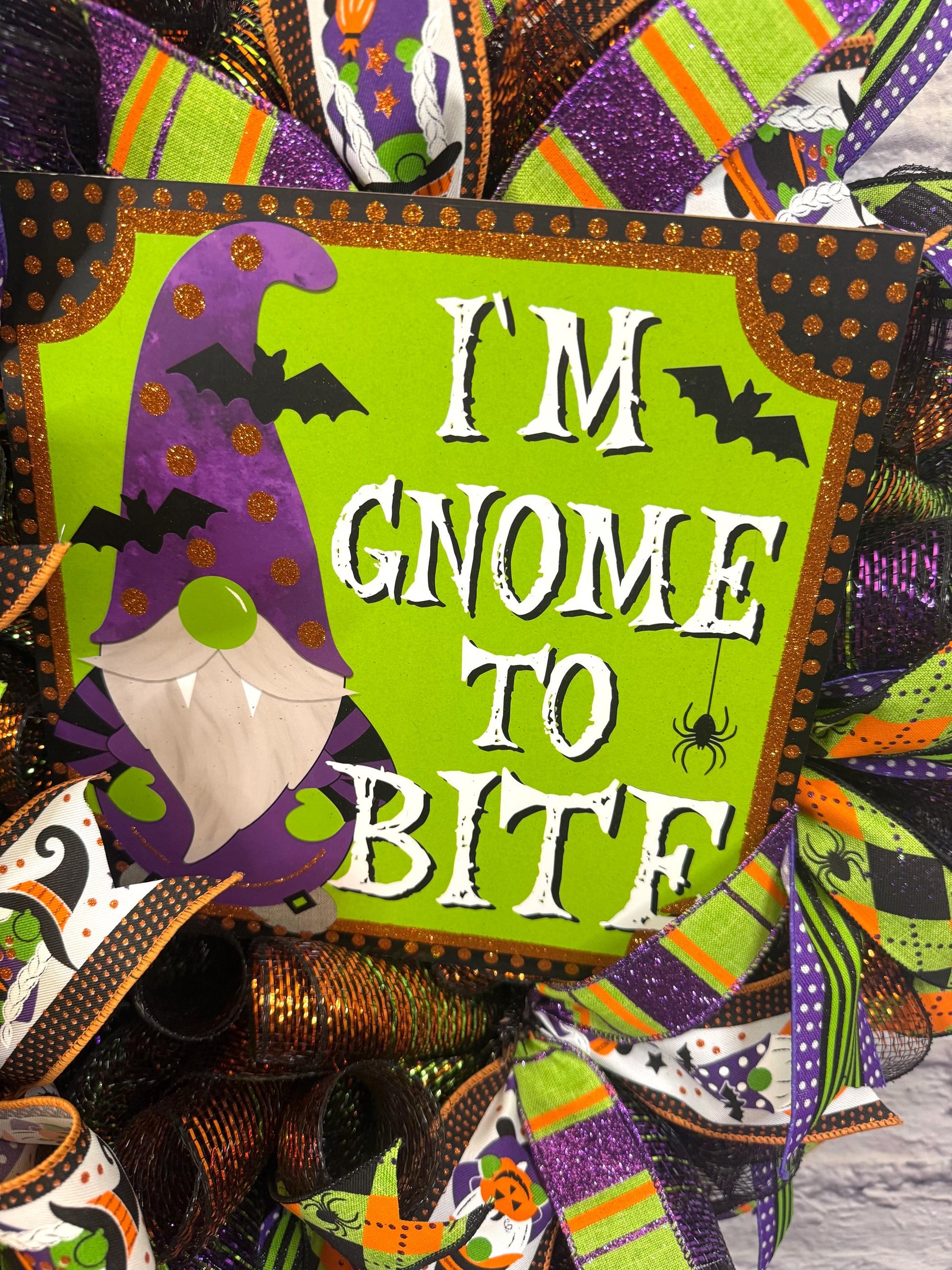 • Center sign with “I’m Gnome to Bite” message and Halloween gnome design