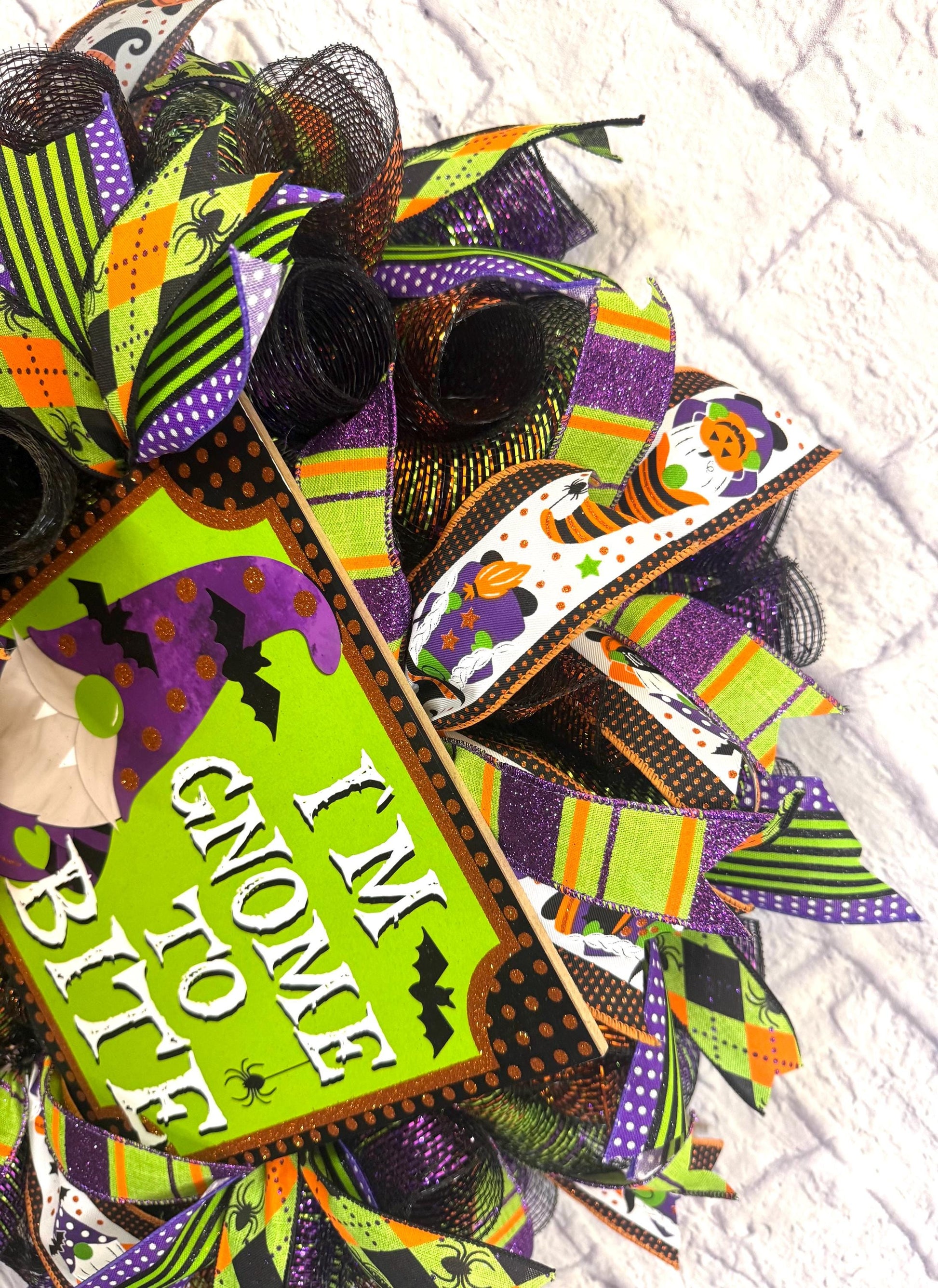 Bring humor and Halloween spirit to your home with this I’m Gnome to Bite Halloween Wreath! Featuring a playful gnome dressed in purple with bats, spiders, and bright neon-green accents, this wreath is full of festive Halloween fun.