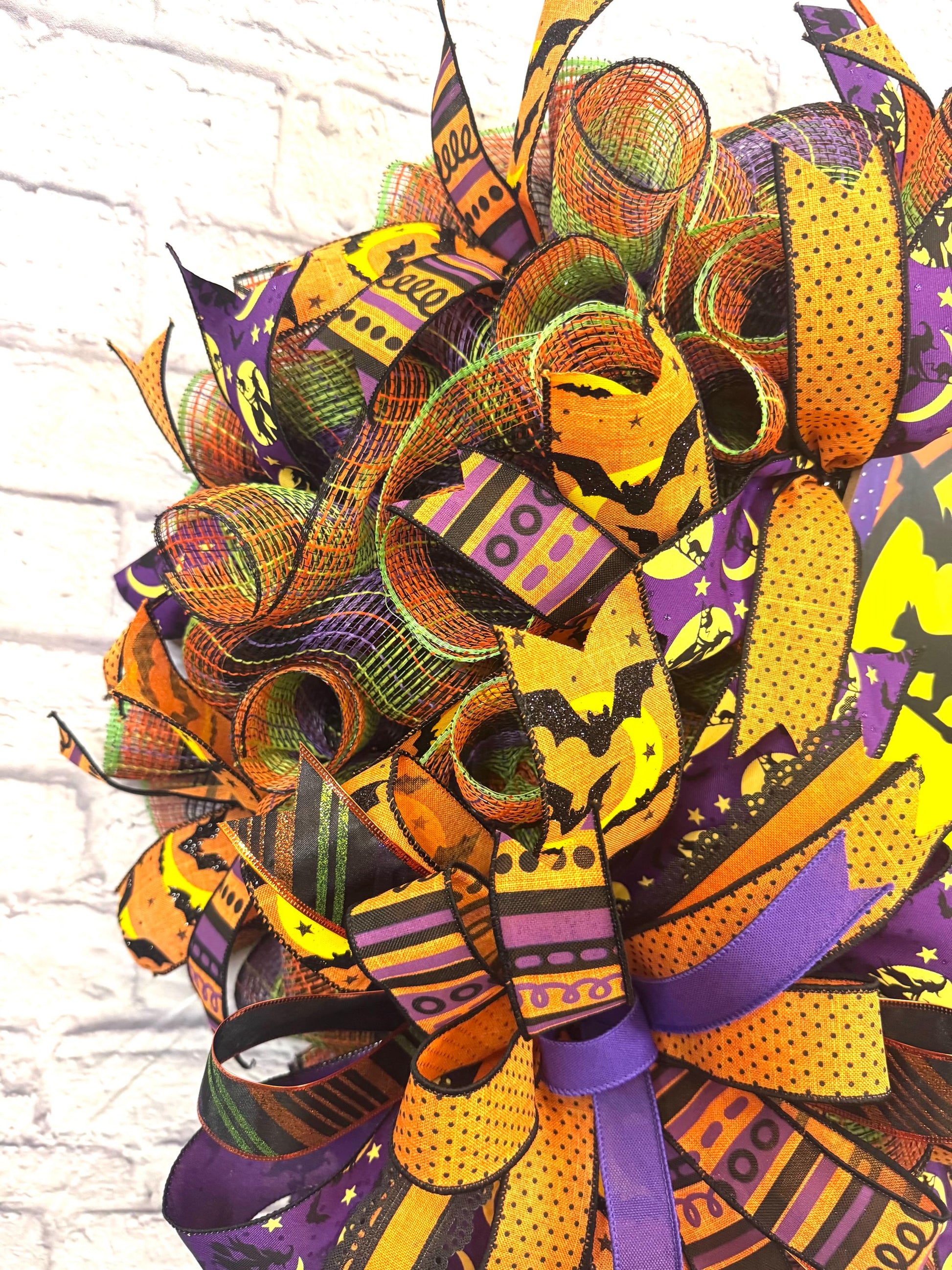 Handmade with layers of orange, purple, black, and green ribbons—complete with glitter accents and a large bow—this wreath captures the perfect spooky vibe. Whether you’re decorating for trick-or-treaters, a Halloween party, or simply love witchy décor, this wreath makes a striking seasonal centerpiece.