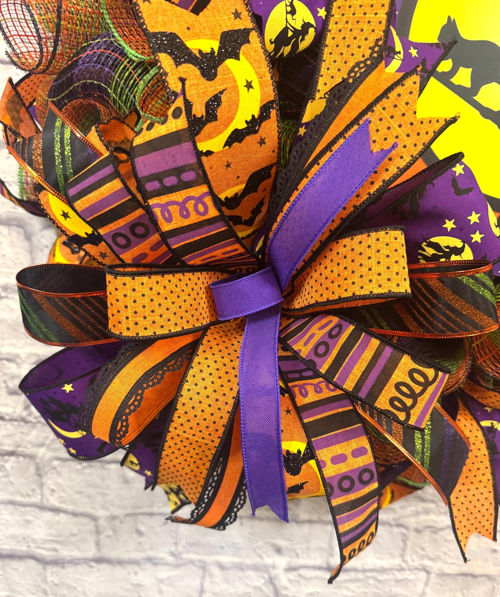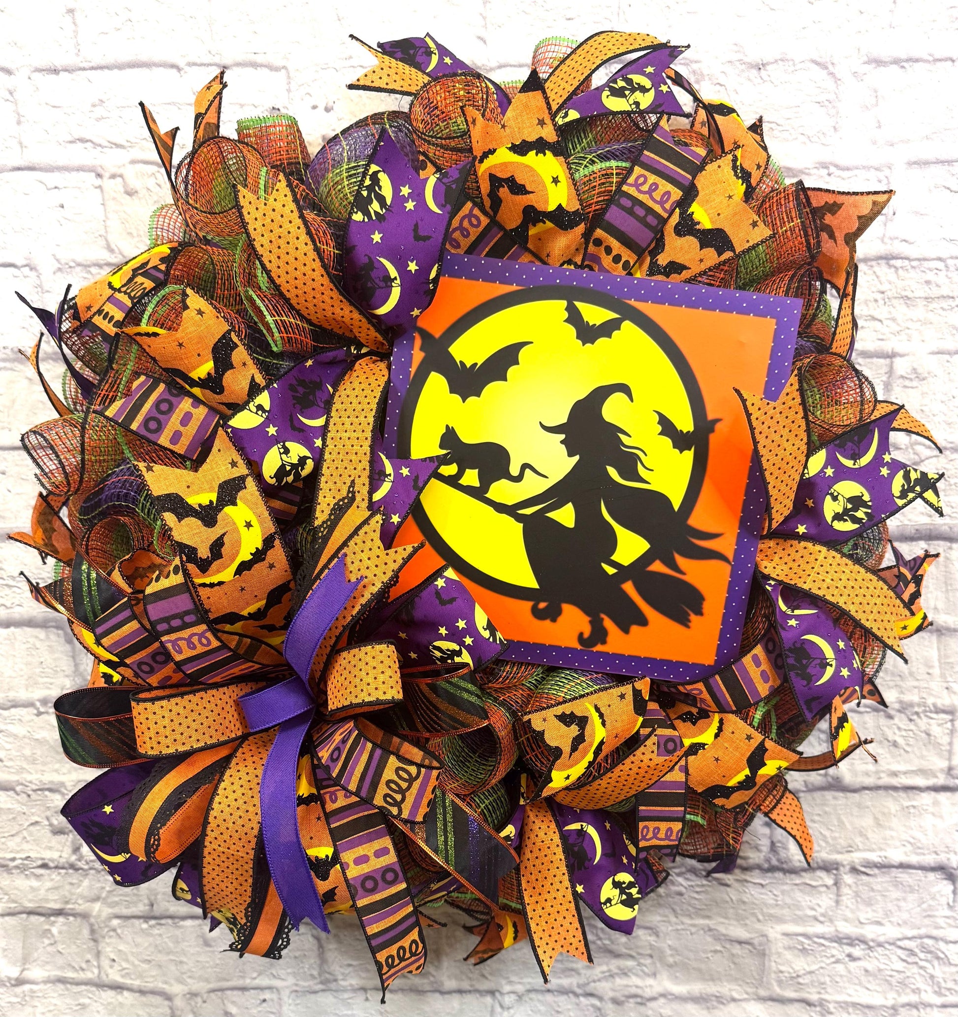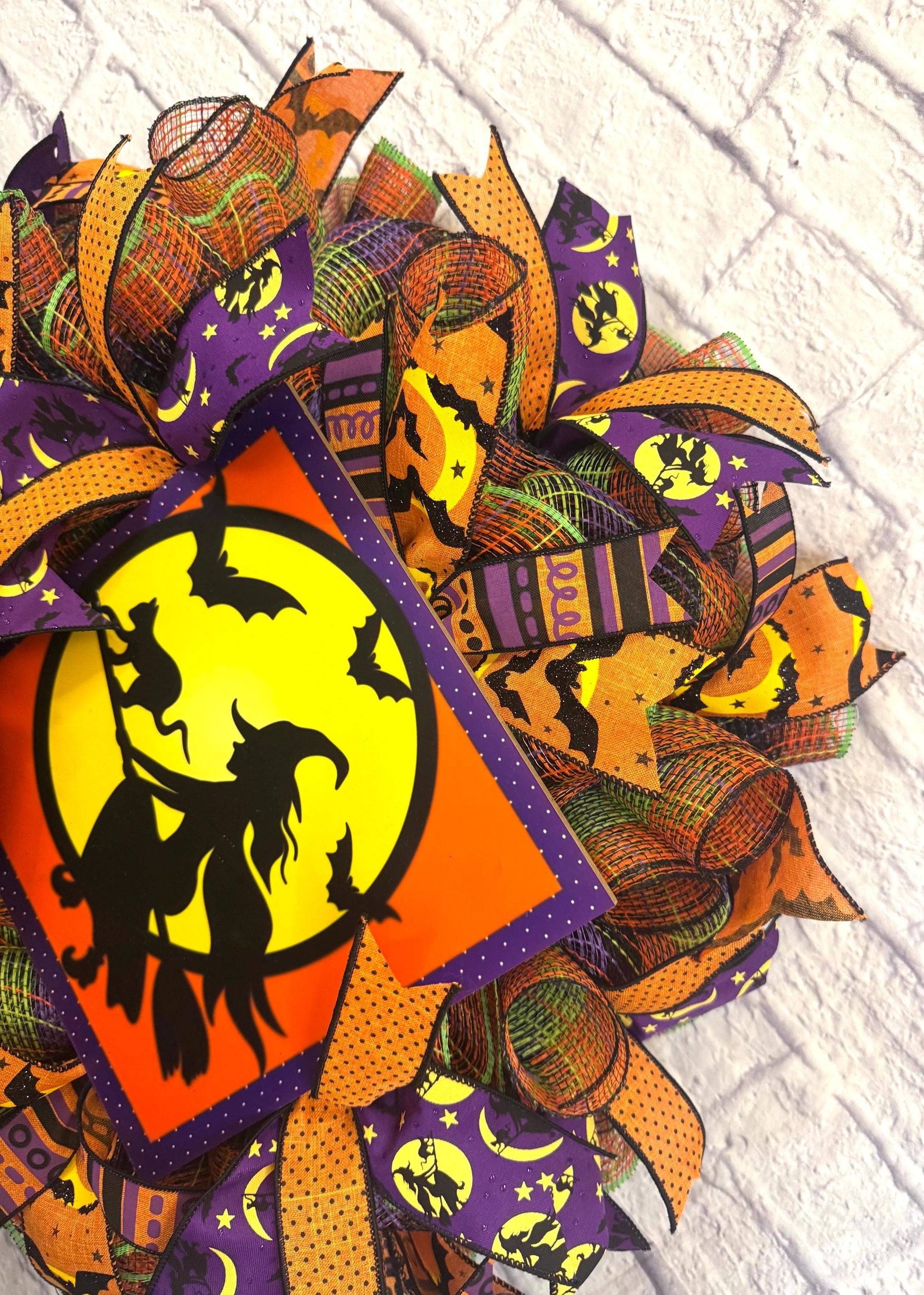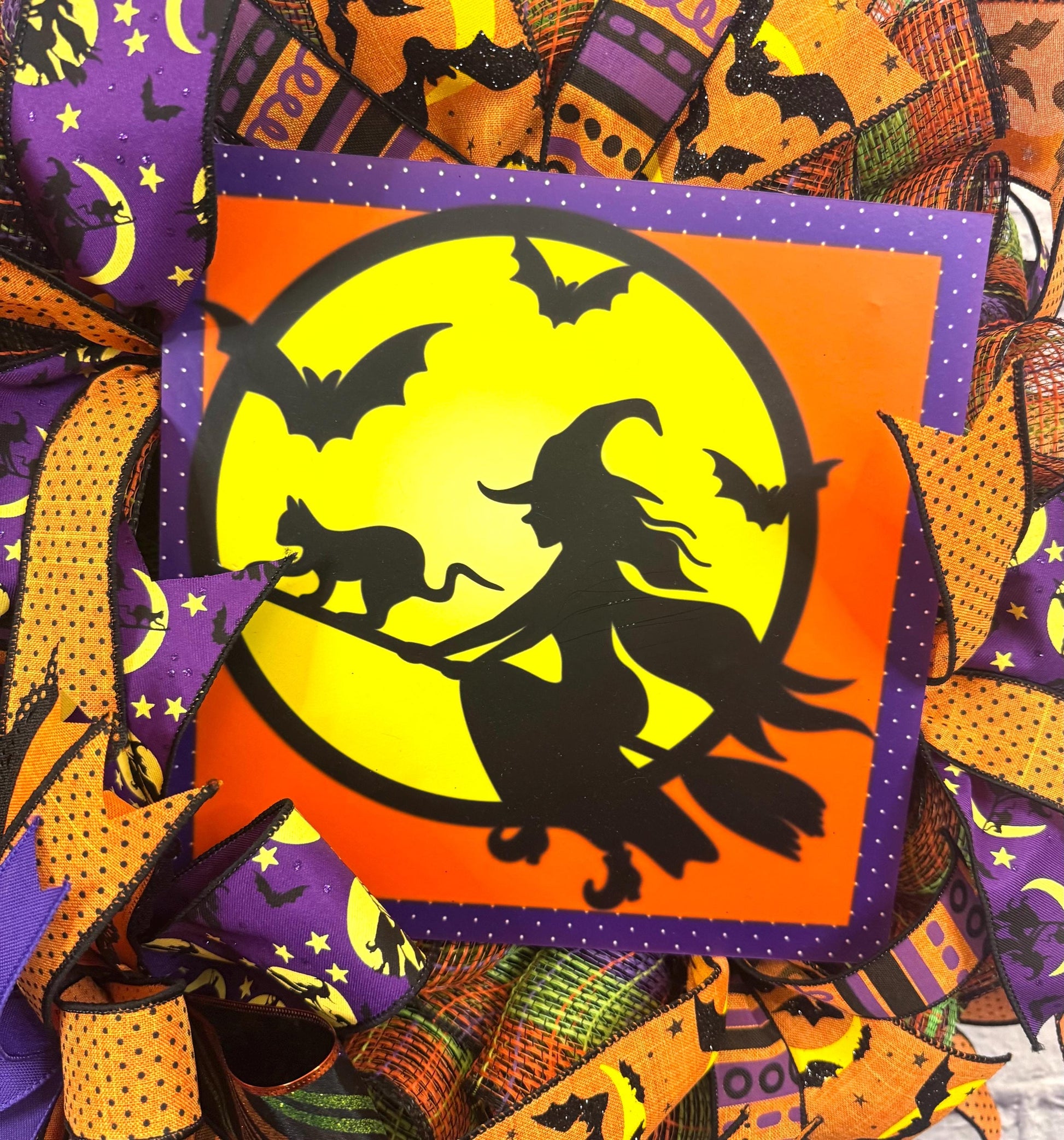 Bring classic Halloween magic to your home with this Witch Halloween Wreath! Featuring a bold silhouette of a witch flying across the moon with bats, this wreath is full of vibrant colors and festive detail.
