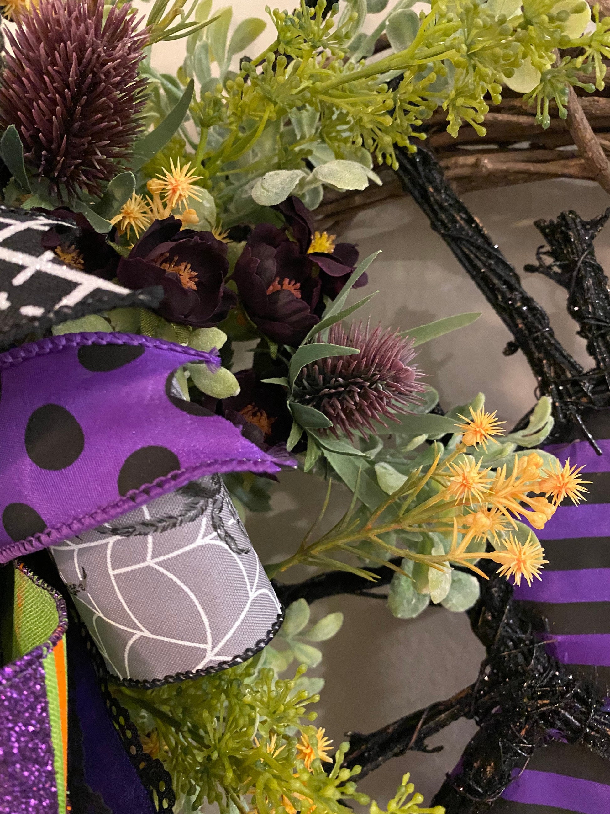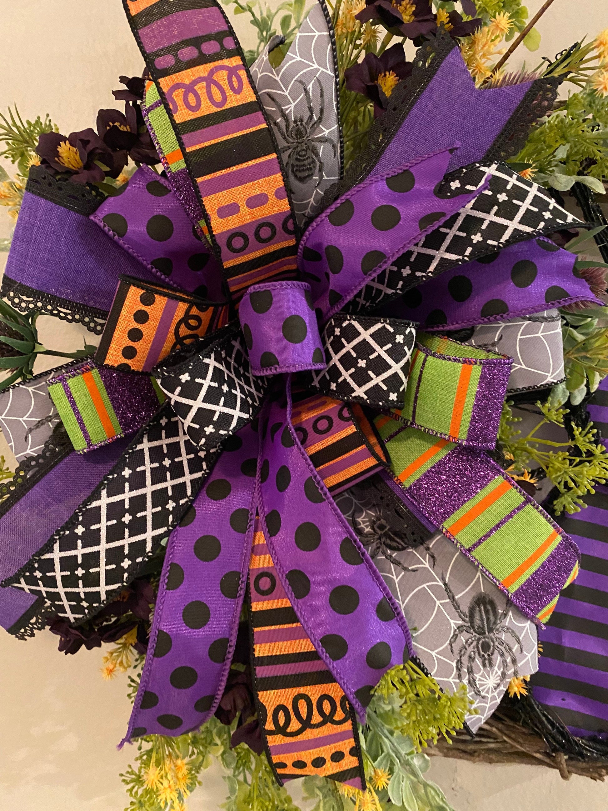 Add a touch of spooky elegance to your Halloween decor with this handmade wreath! Featuring a unique design with a striking purple and black striped spider, this wreath is sure to make a statement. The vibrant bow is crafted from an assortment of ribbons, including polka dots, stripes, and spiderweb patterns, all in festive Halloween colors. Accented with greenery and yellow flowers, this wreath blends the eerie with the beautiful for a perfect Halloween decoration.