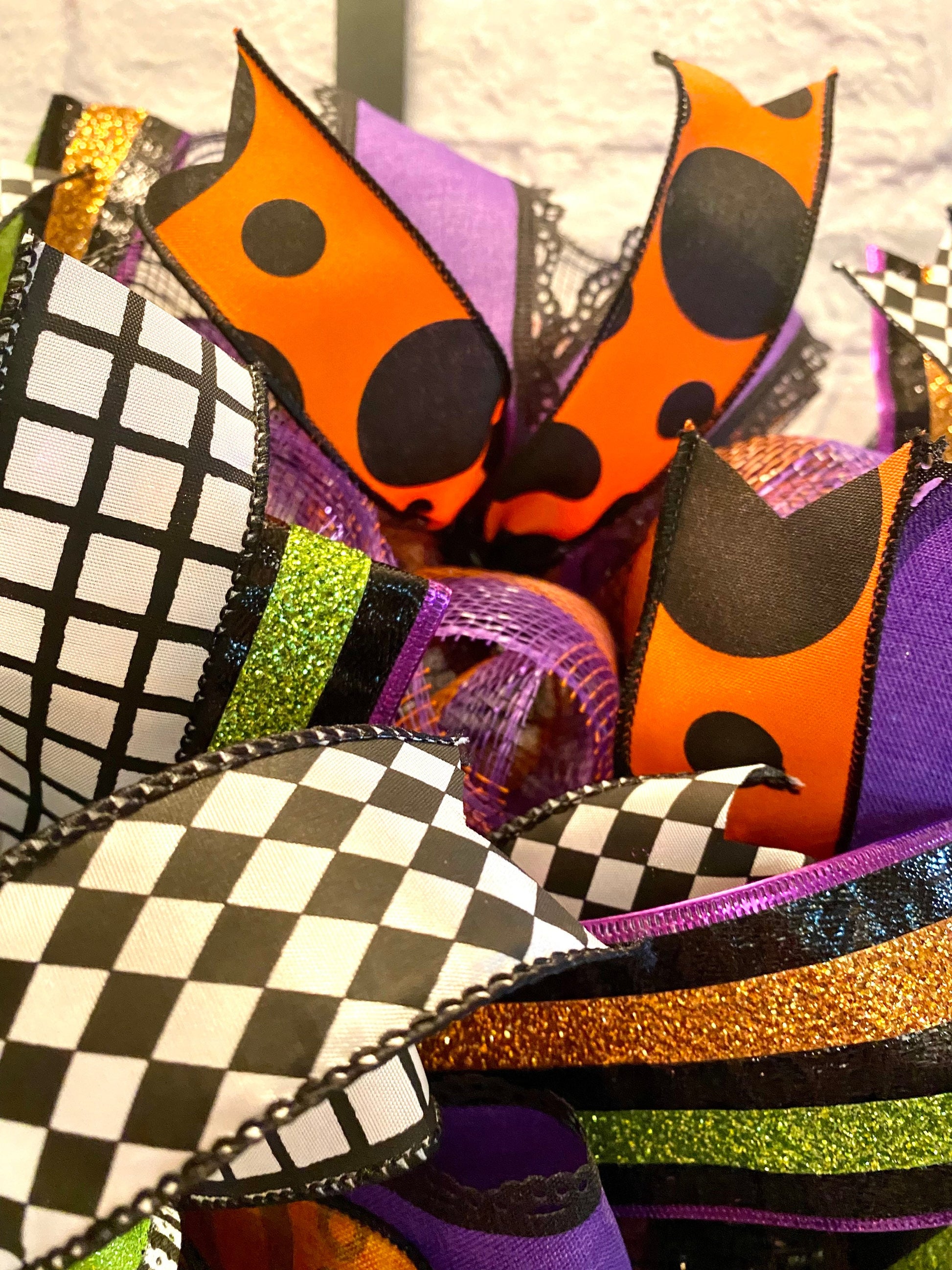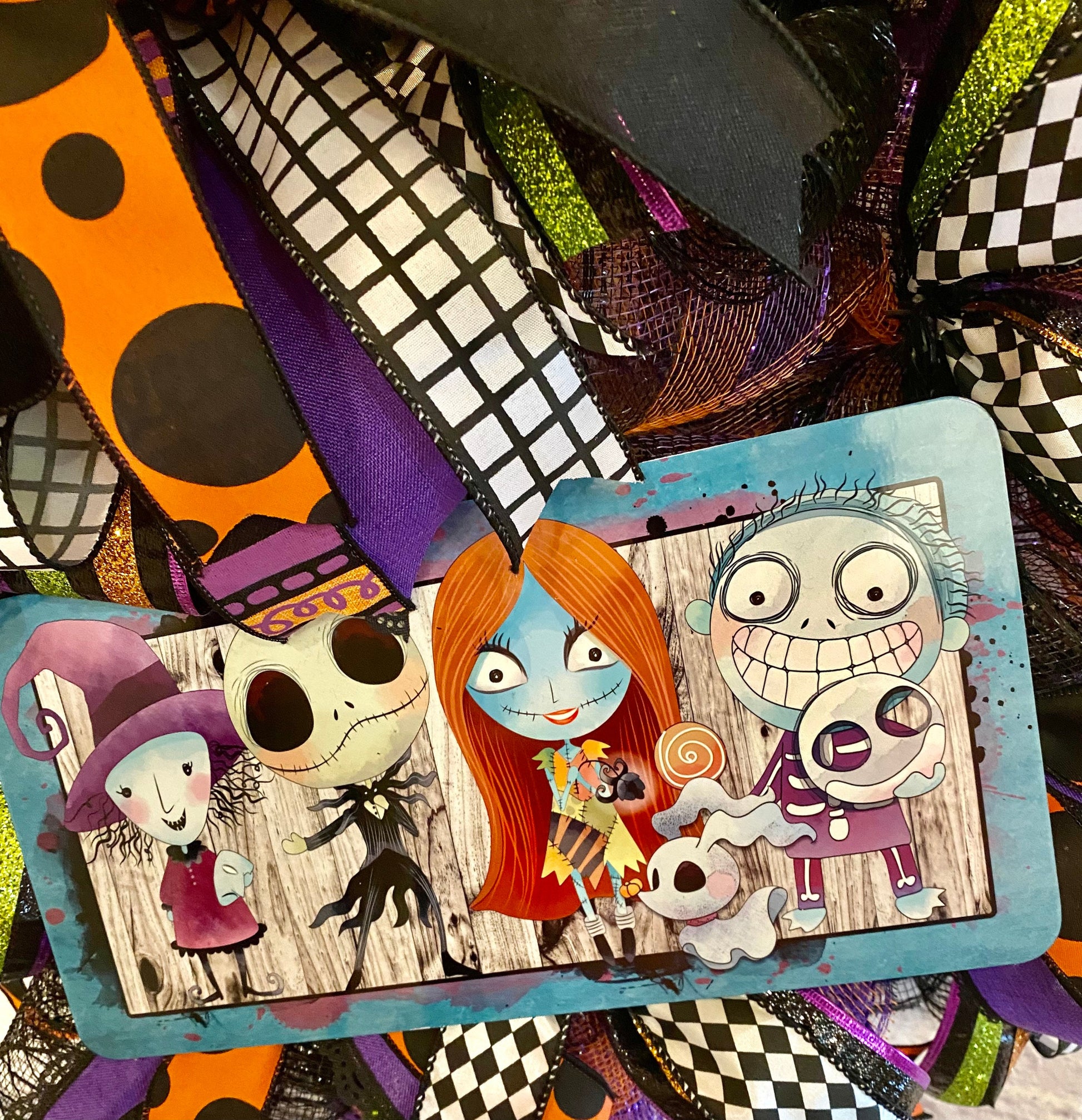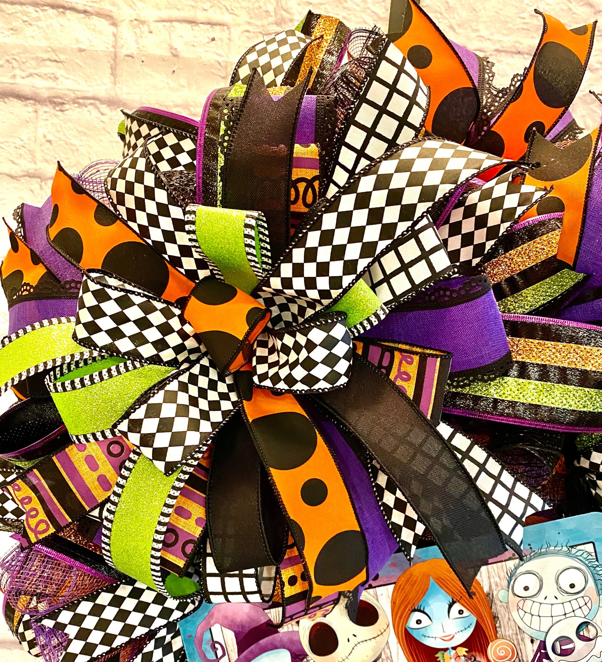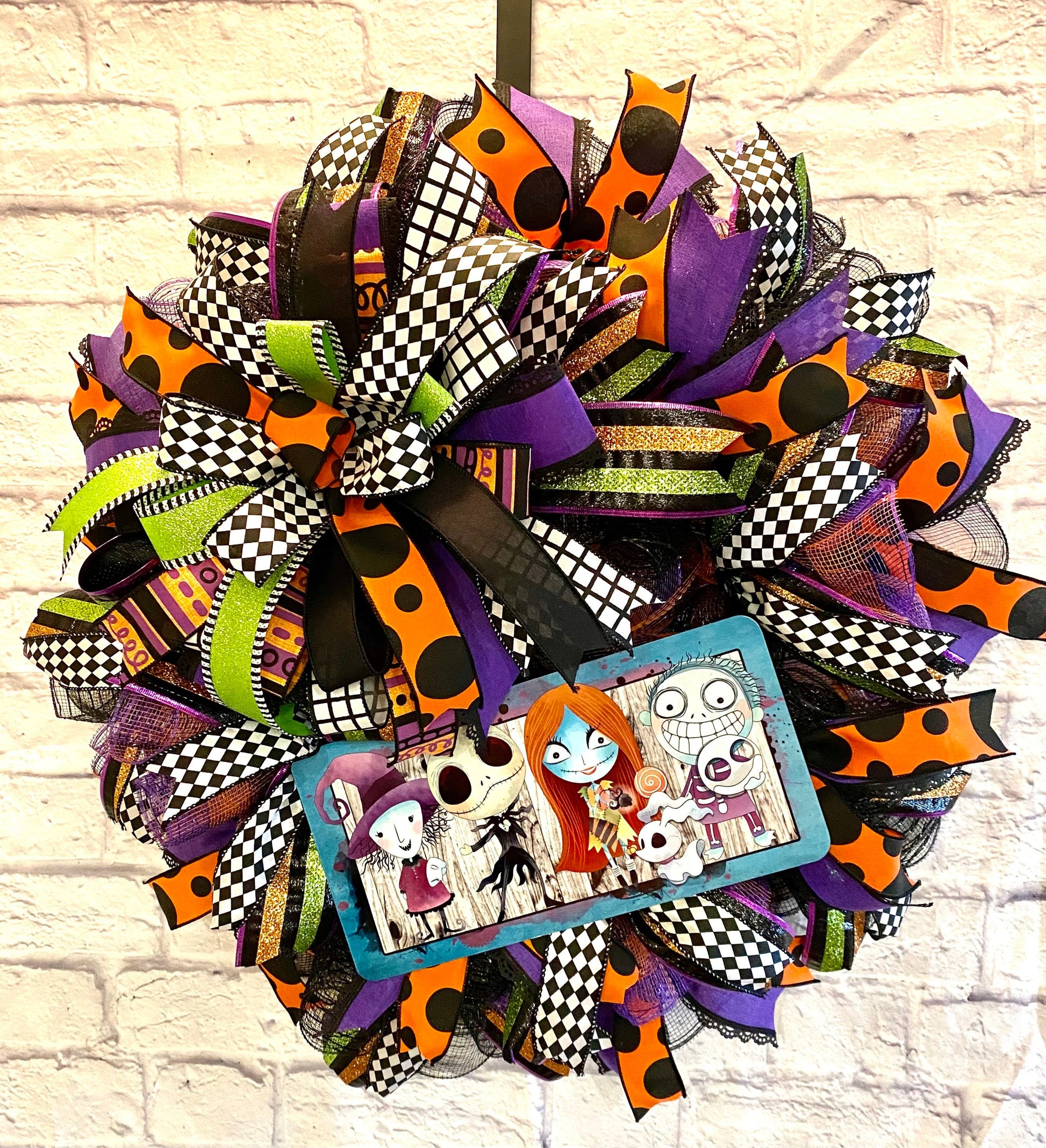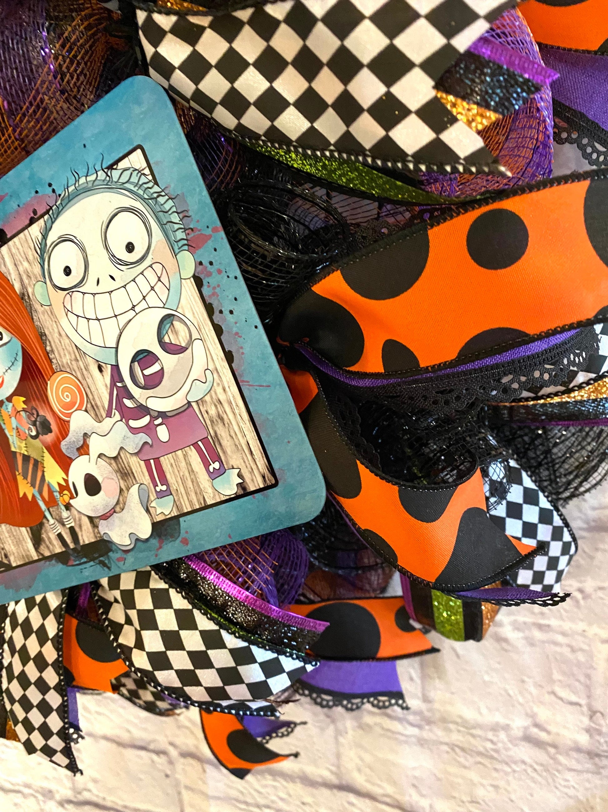 This fun homemade Halloween wreath is made on a wire wreath frame and with black and black, purple, & orange striped deco mesh. It is embellished with a metal sign with Zombies, and wired ribbon in the colors of orange, black, white, green, and purple in various prints. This wreath measures 26 inches in diameter and 10 inches in depth.