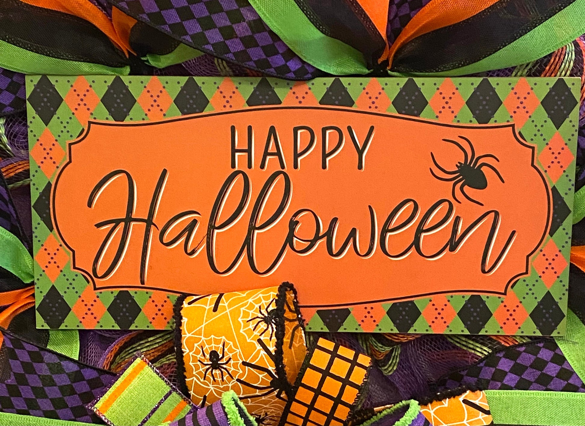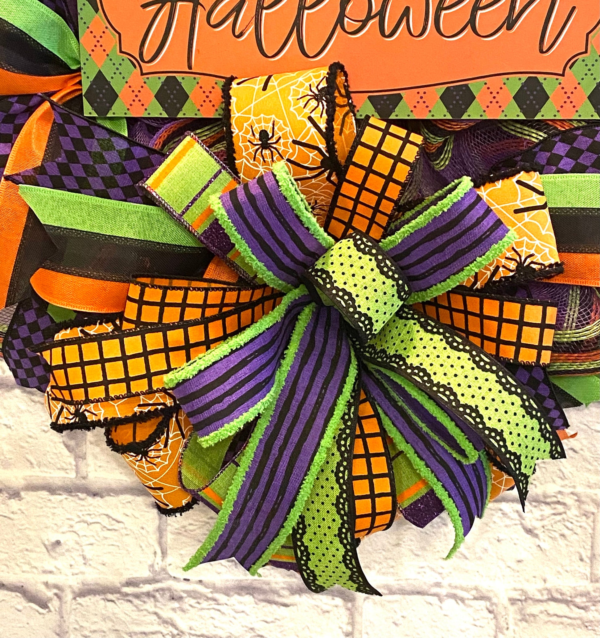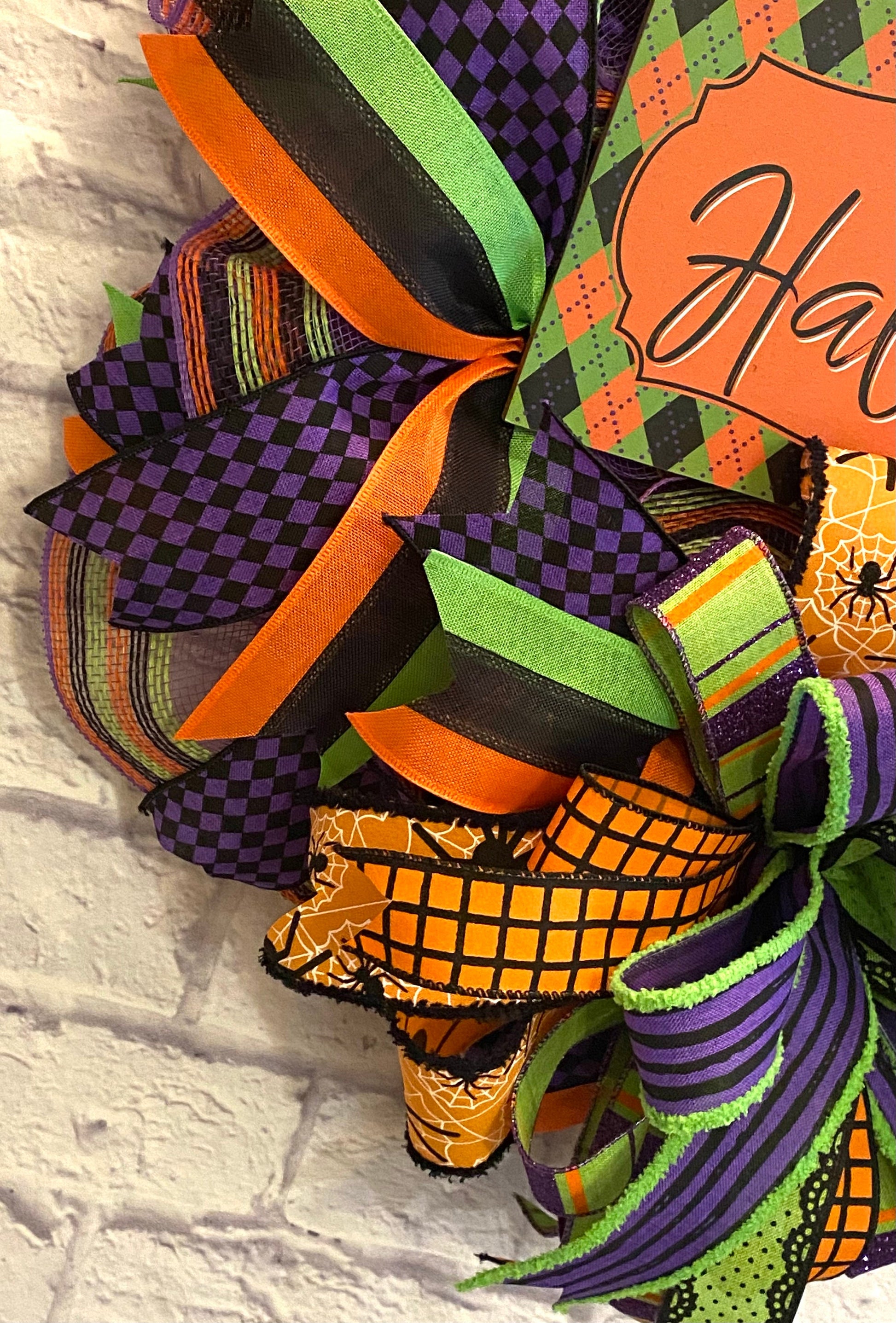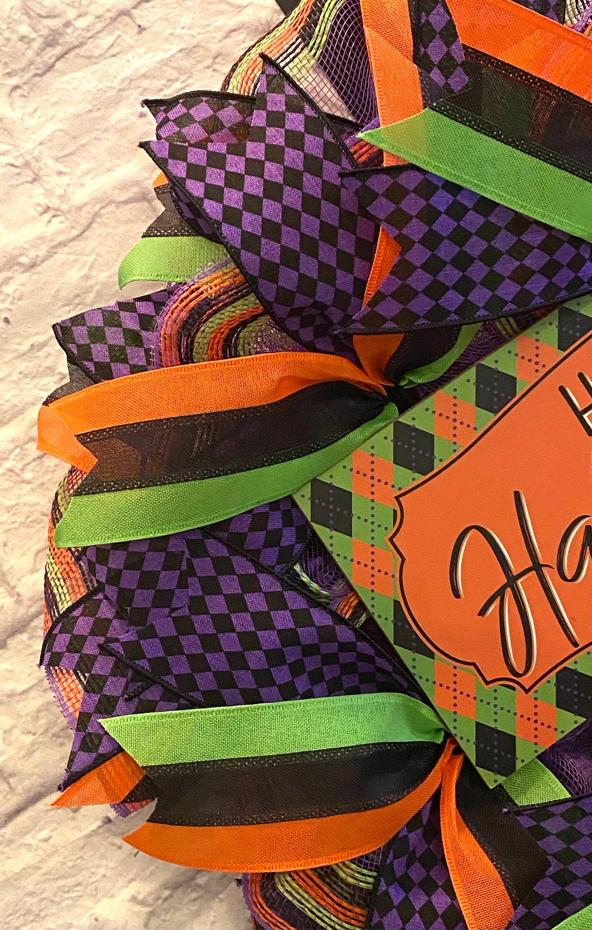 This fun handmade bright & colorful Halloween wreath is made on a round wood wreath frame and with purple deco mesh with orange, green, & black border stripes. It is embellished with a black, green, & orange wood sign stating “Happy Halloween” and wired ribbon in the colors of green, orange, black, and purple in various prints. This wreath measures 21 inches in diameter and 5 inches in depth. This wreath is thin enough to fit in between your door and storm door.