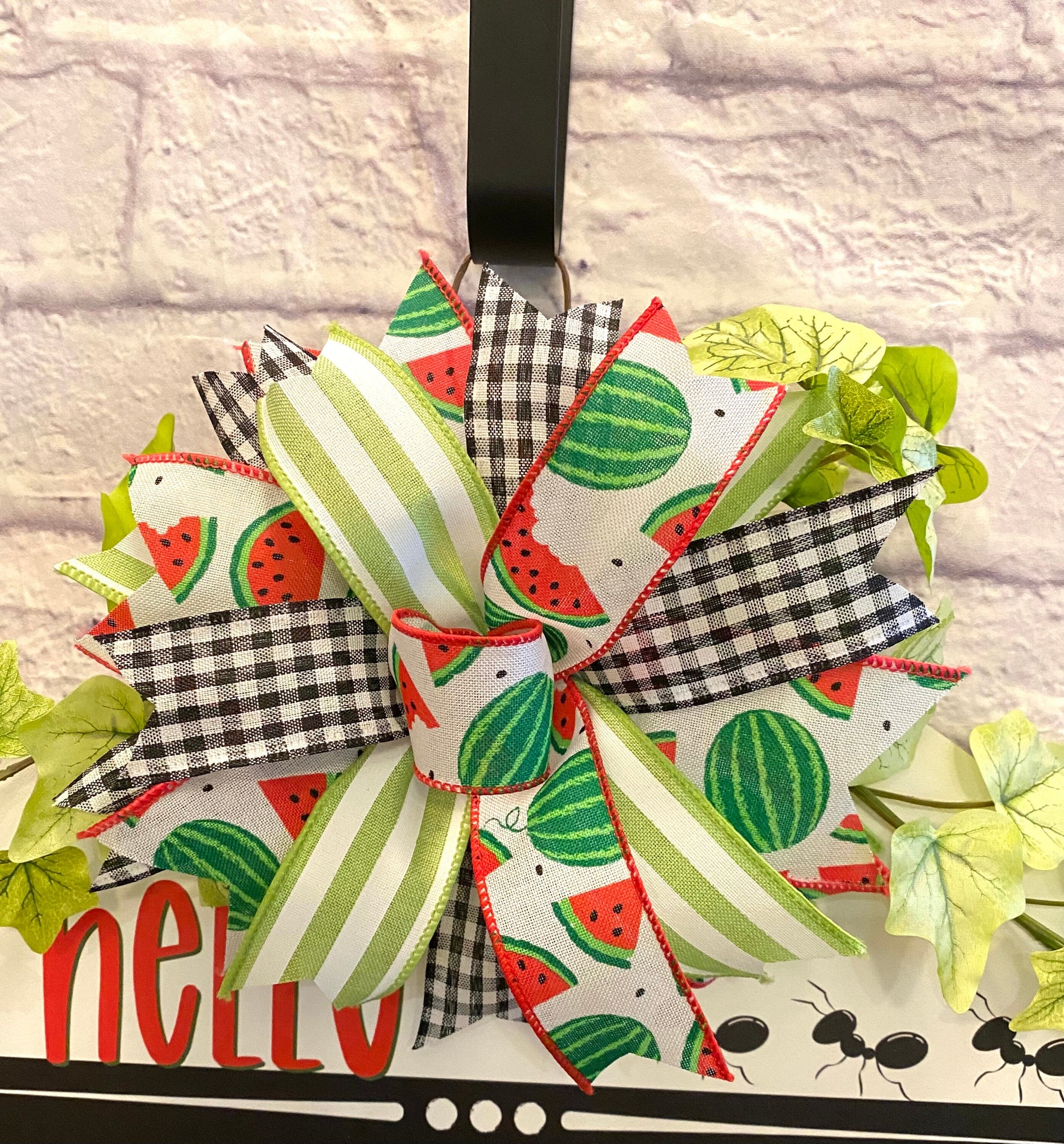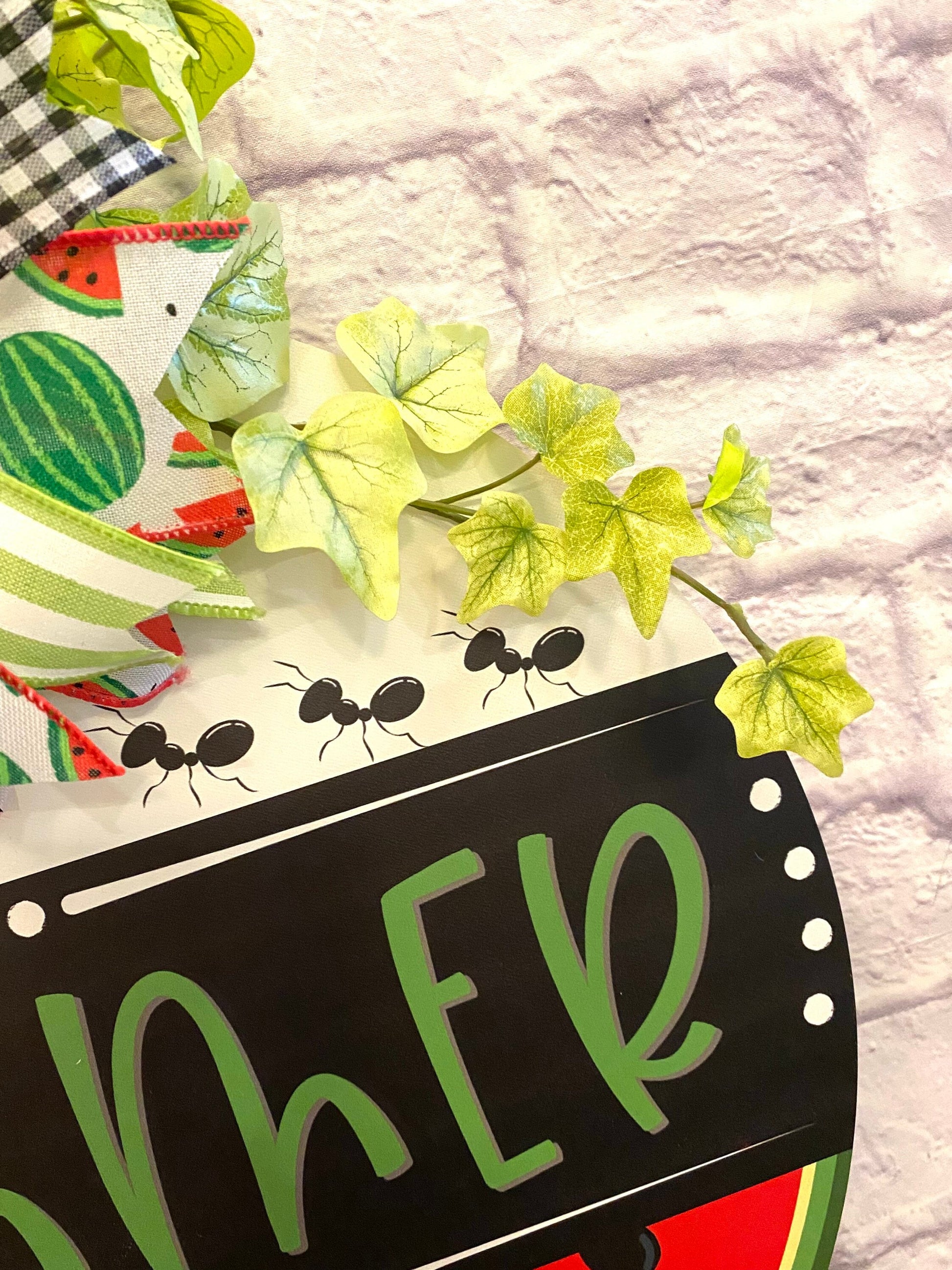 This fun Watermelon door hanger, is made with wood, printed with a watermelon and ants and states “Hello Summer”, measures 18 inches in diameter, and 5 inches in depth. The door hanger is embellished with greenery, and a bow made with red, black, and green wired ribbon in various prints.