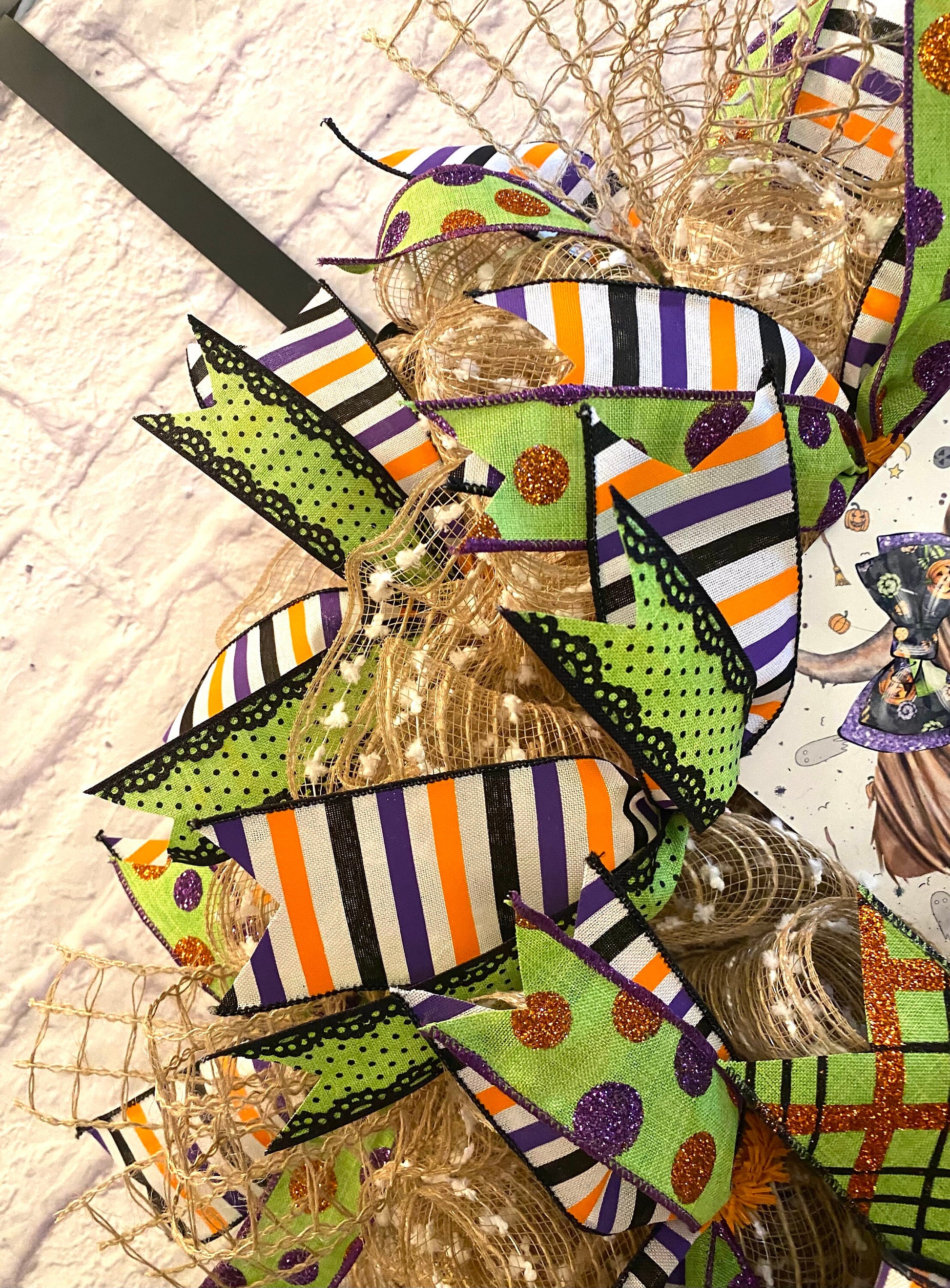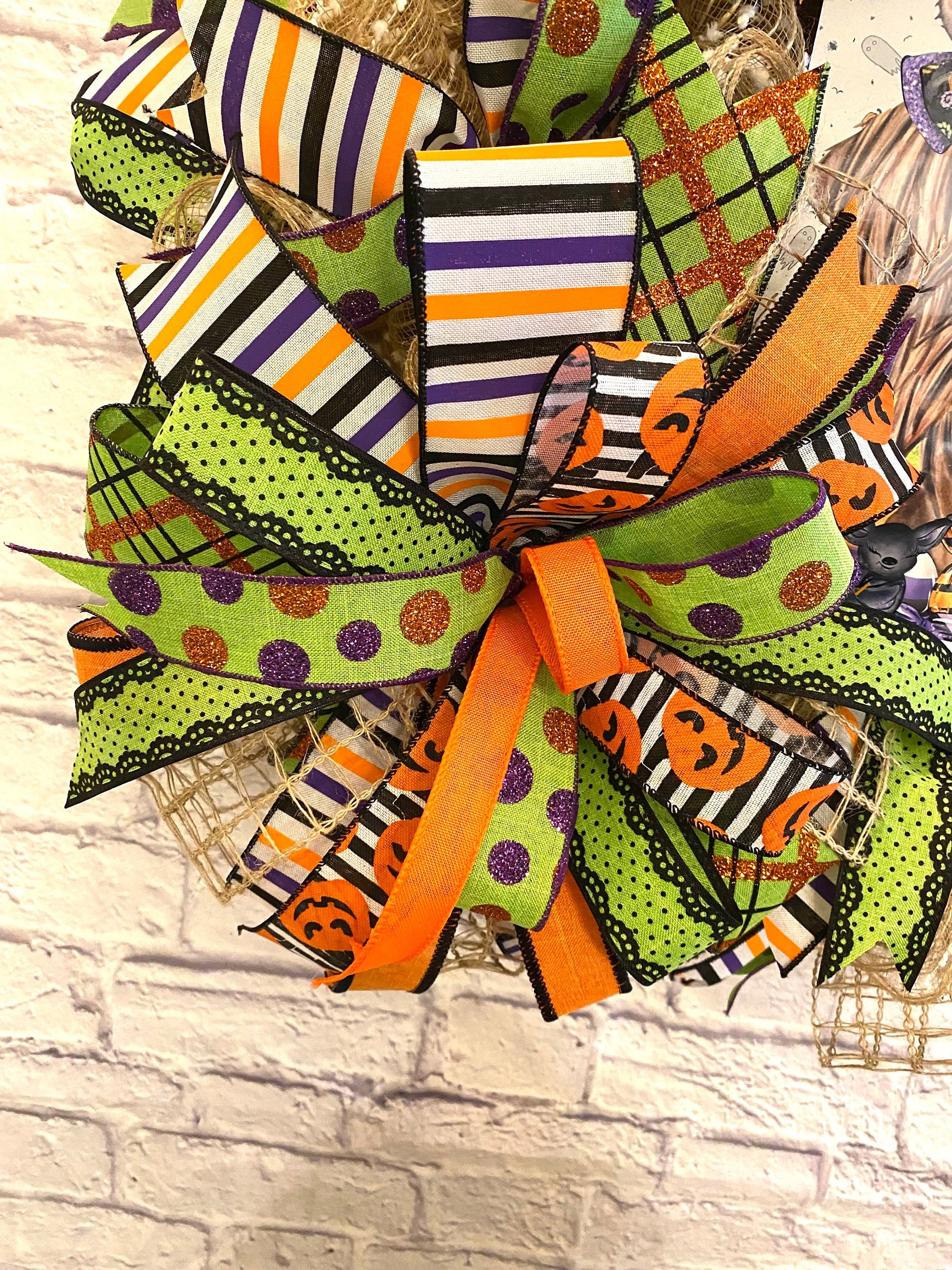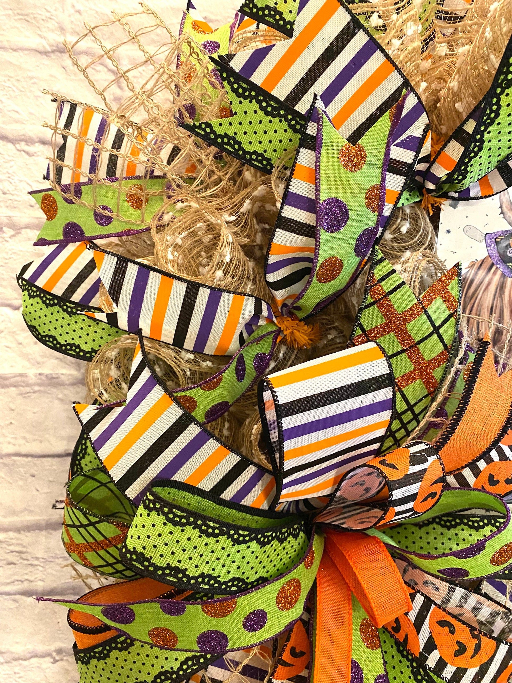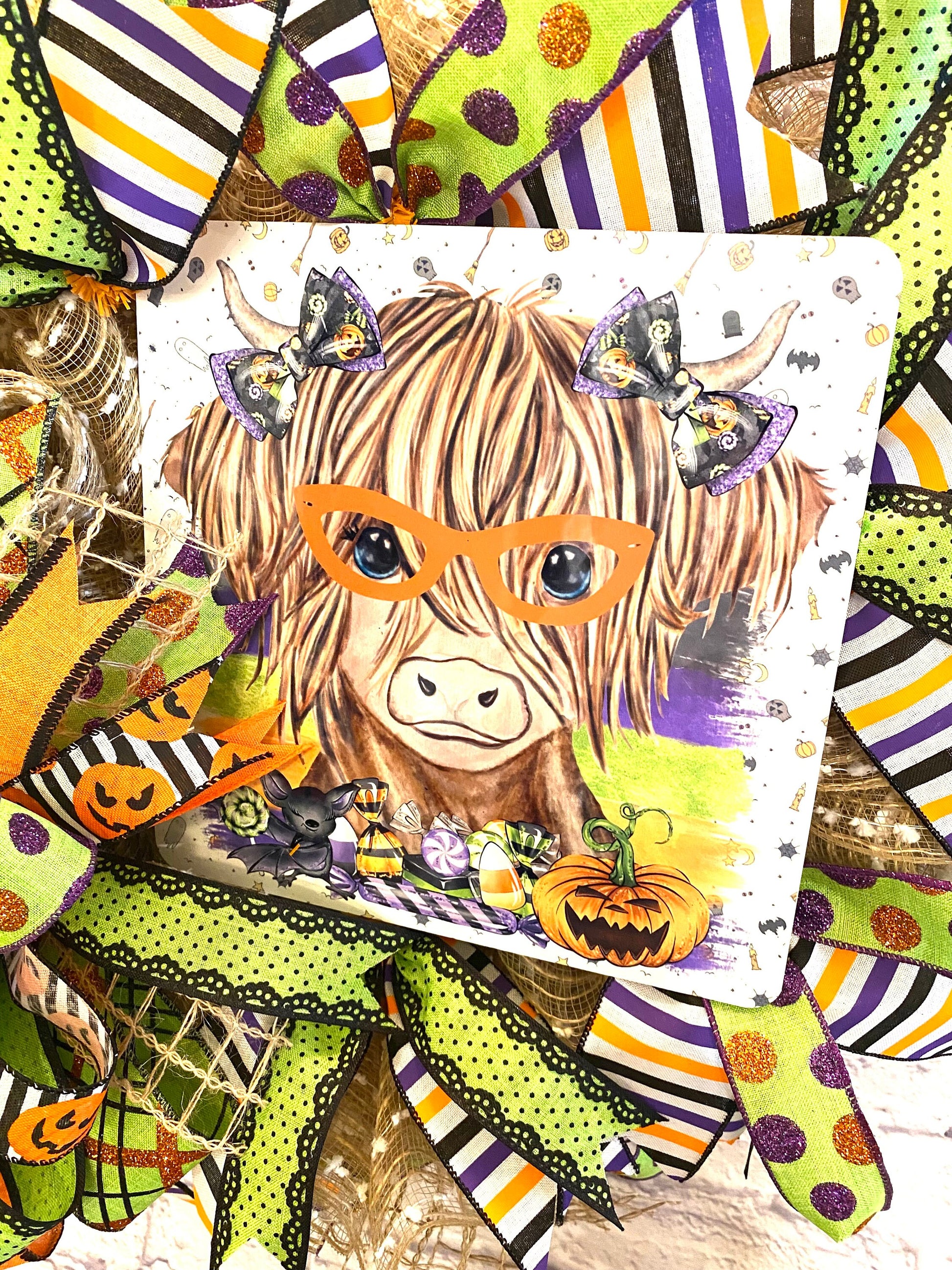 This fun & whimsical handmade Highland Cow Halloween wreath is made with beige jute mesh with white stripes. It is embellished with a metal sign with a highland cow with orange glasses and surrounded by Halloween candy, pumpkins, bats, & ghosts , and wired ribbon in the colors of beige, black, green, orange, and purple, in various prints. The wreath is made on a wire wreath frame and measures 25 inches in diameter and 10 inches in depth.
