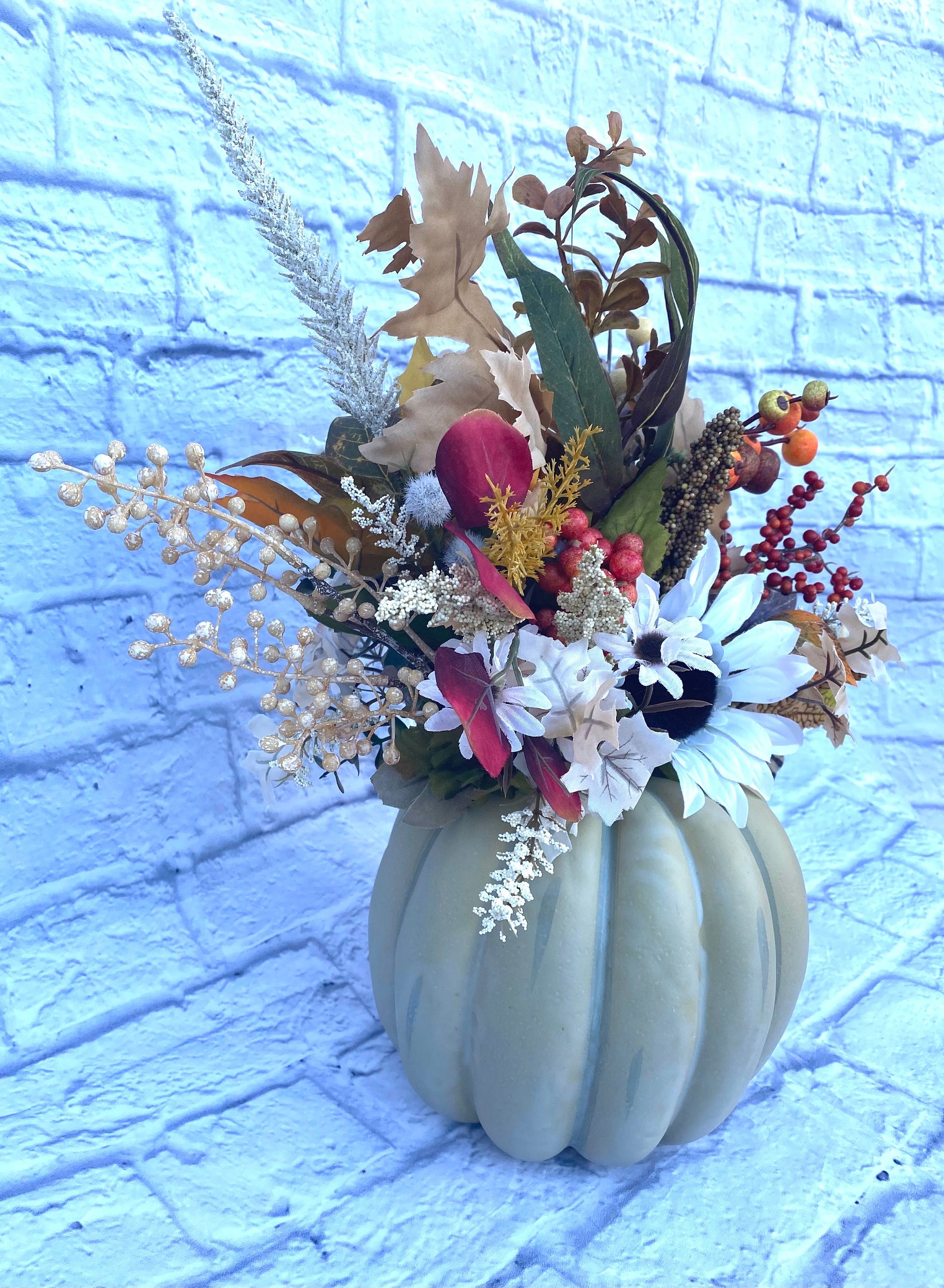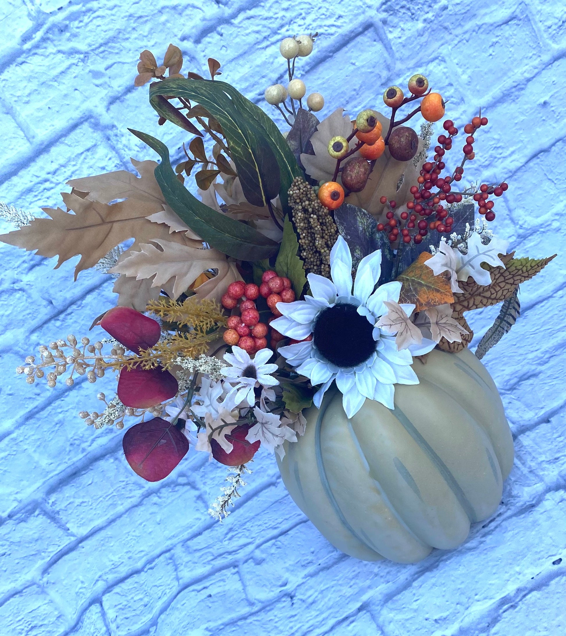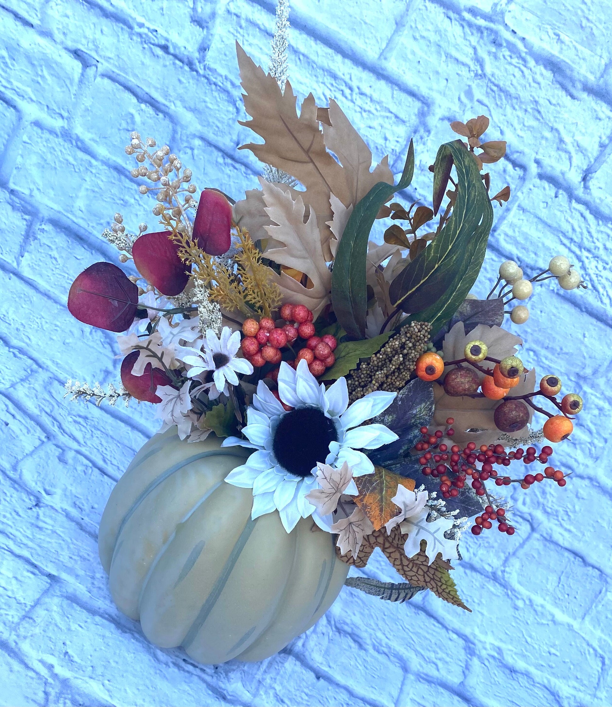 This pumpkin centerpiece is made with a green foam pumpkin and fall florals in the colors of cream, greens, orange, rust, and browns. This centerpiece measures 17 inches in height and 12 inches in width. It would be best to display inside, but would be fine on a covered porch as well. Please note, there could be fading if placed in direct sunlight.