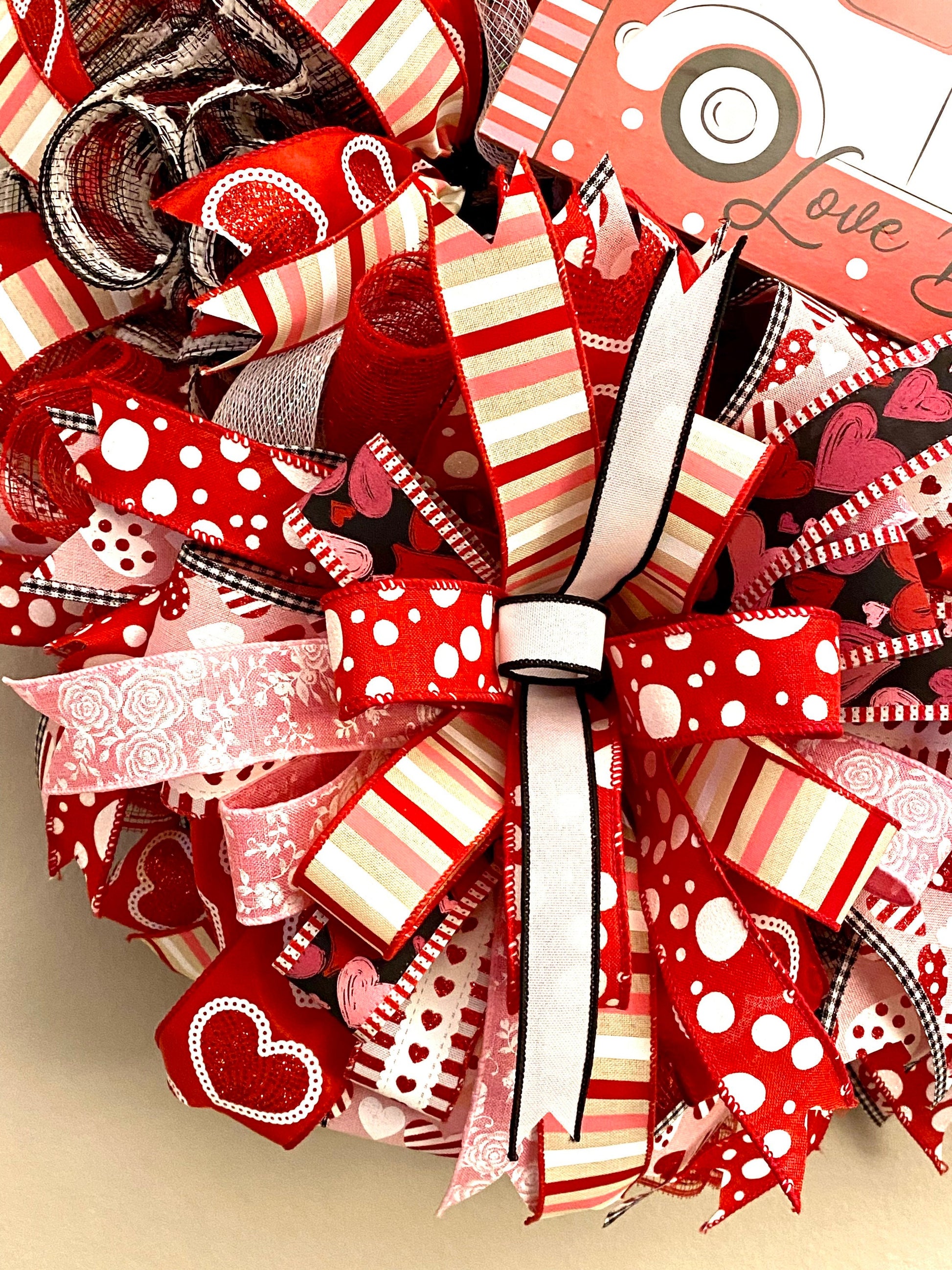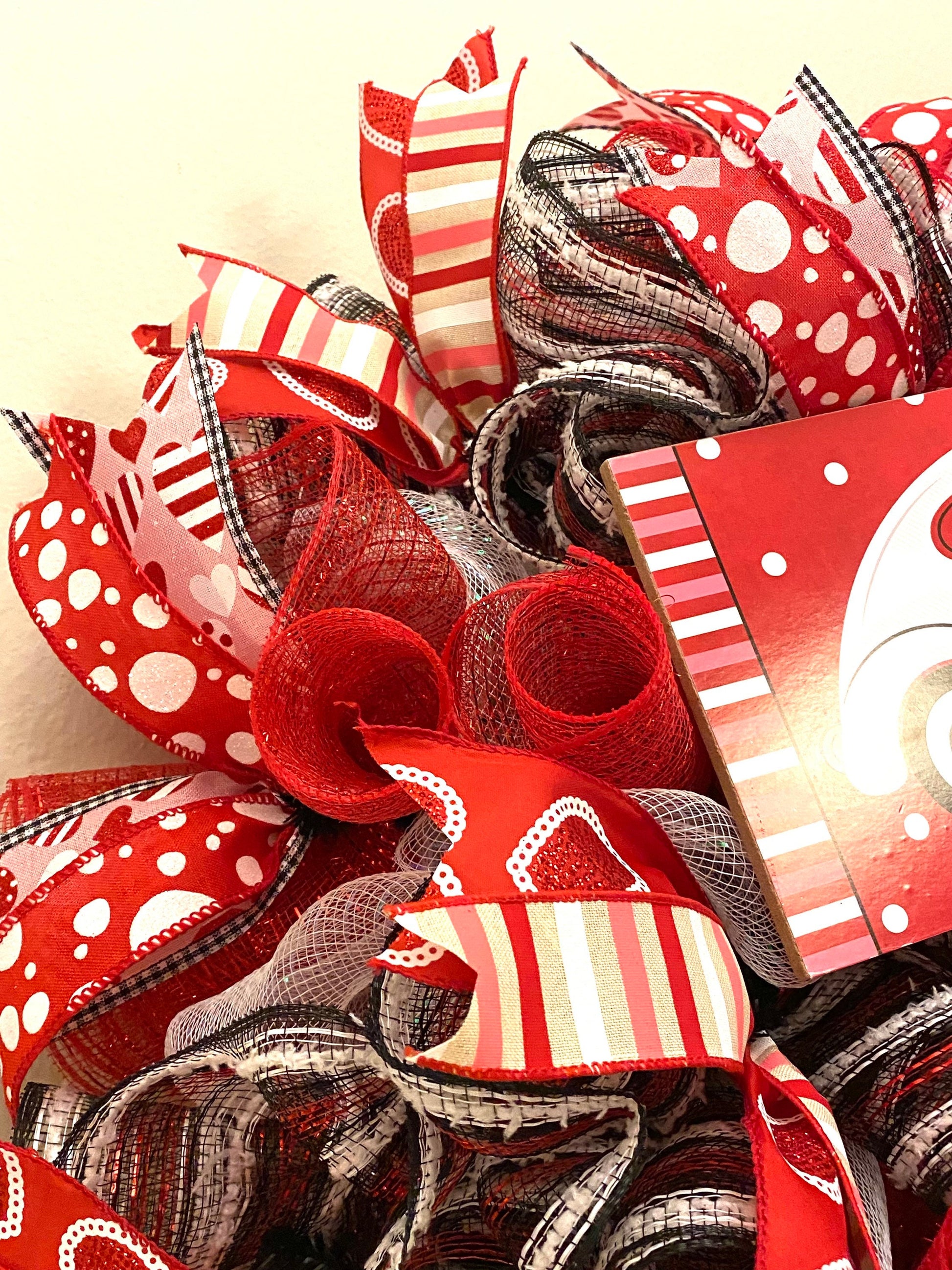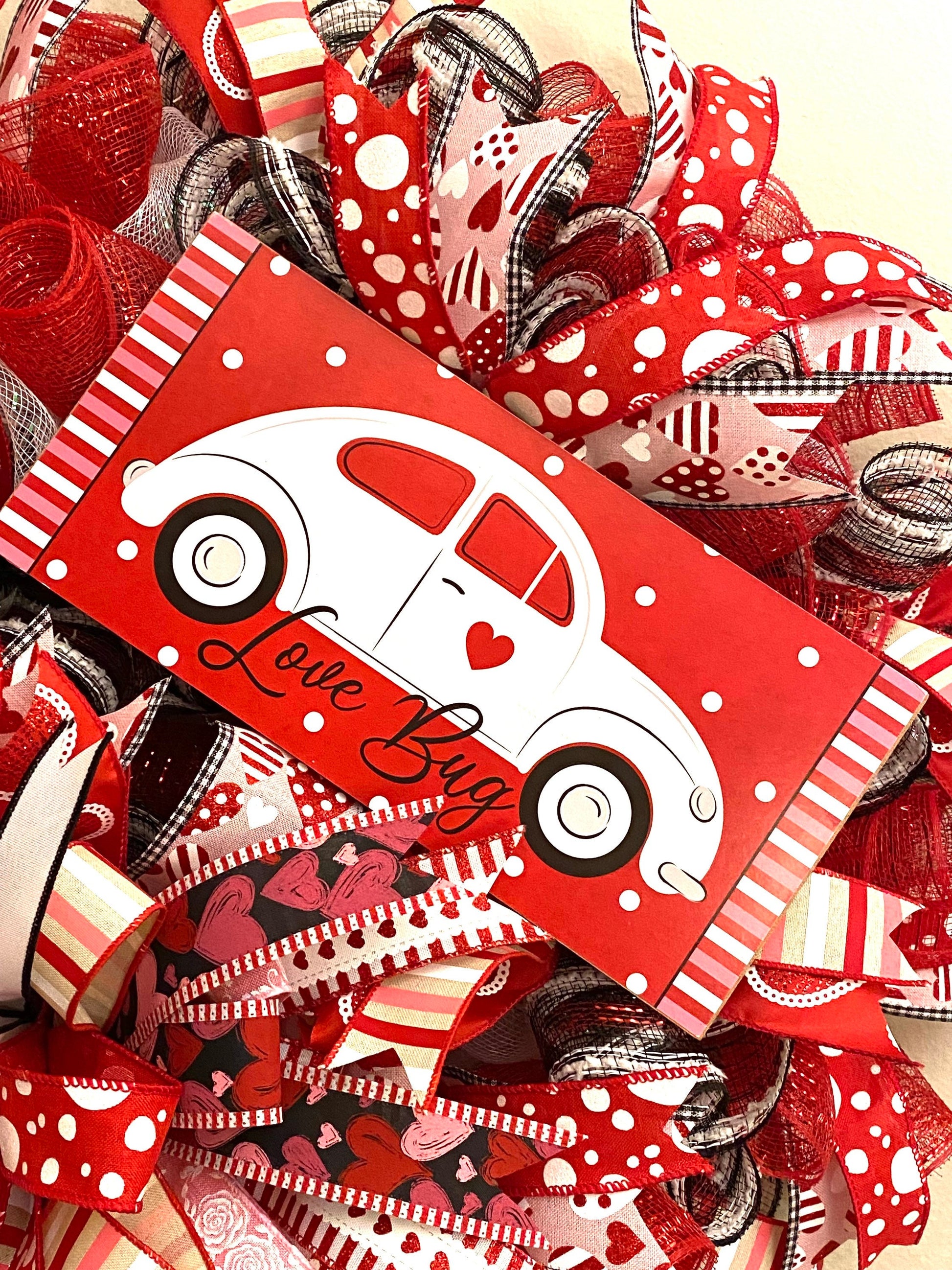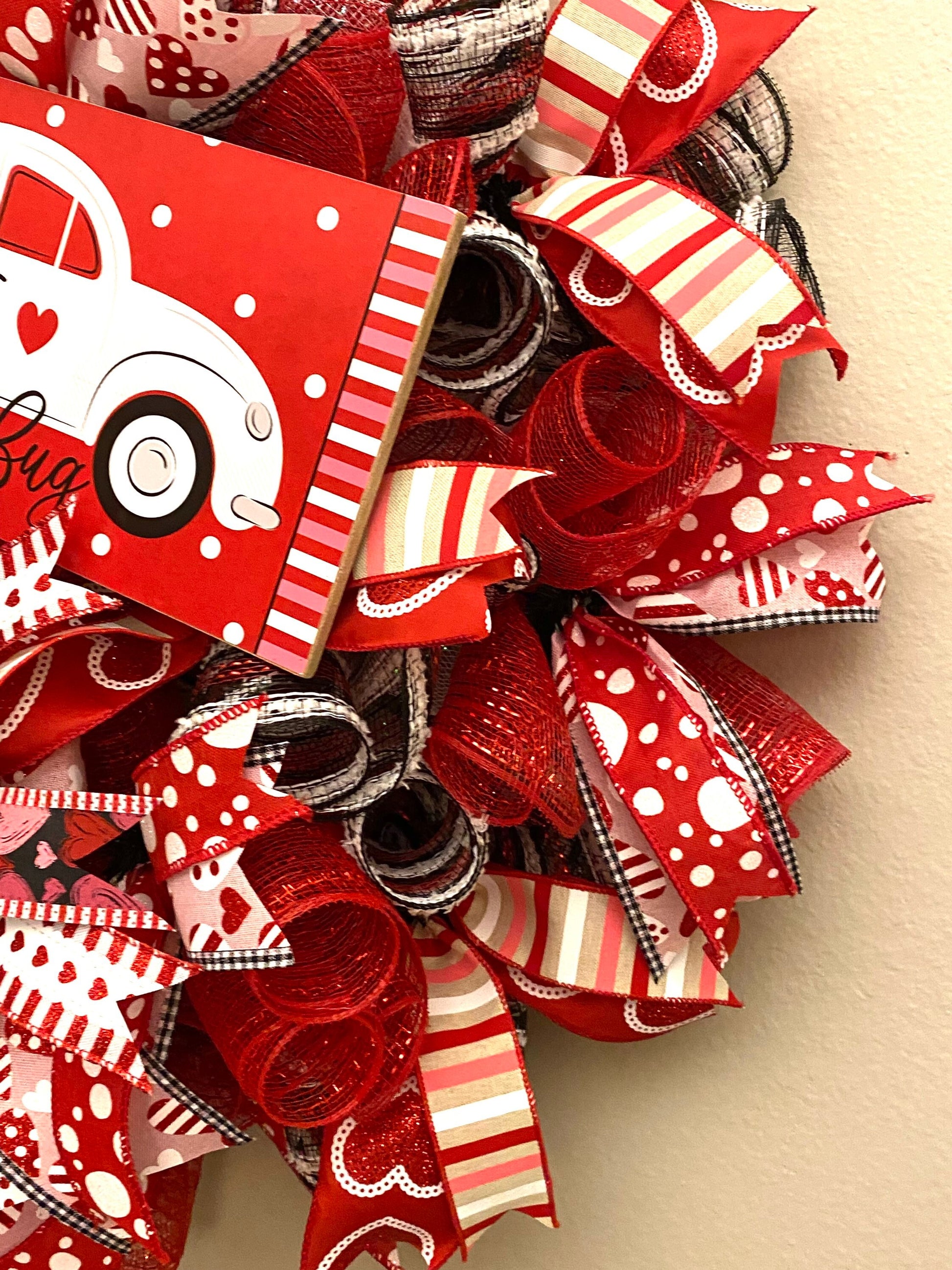 The wreath is made on a wire wreath frame and is 24 inches in diameter and 10 inches deep. The wreath is made with black with red & white stripes, white, and red and deco mesh. It is embellished with wired ribbon and the colors of red, black, white, and pink in various prints, and a wooden sign with a VW Bug and states Love Bug.