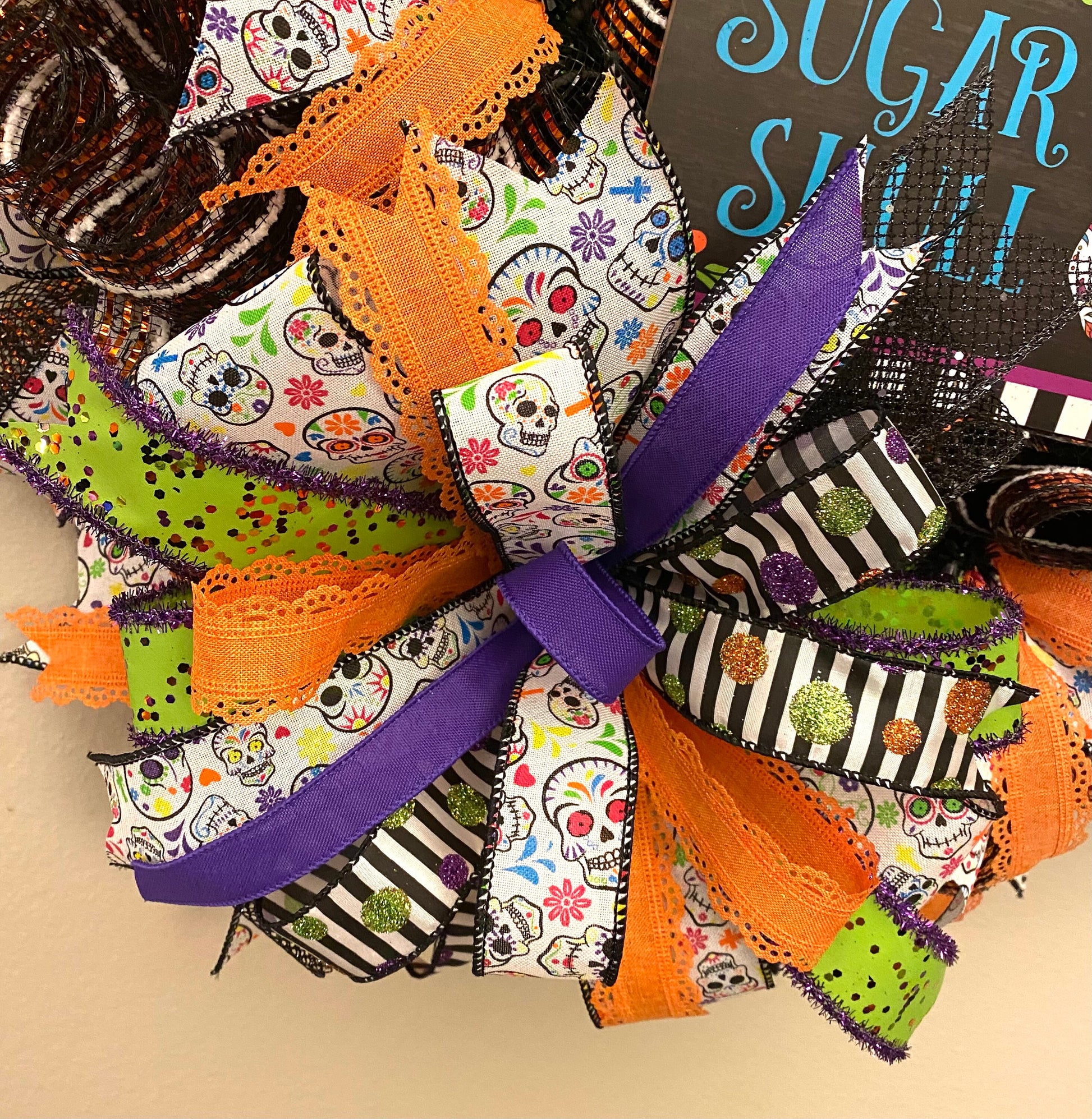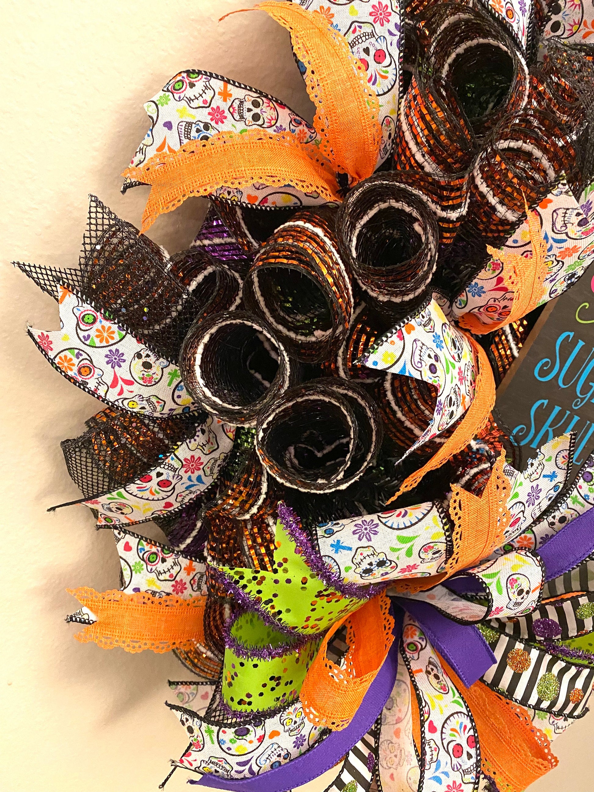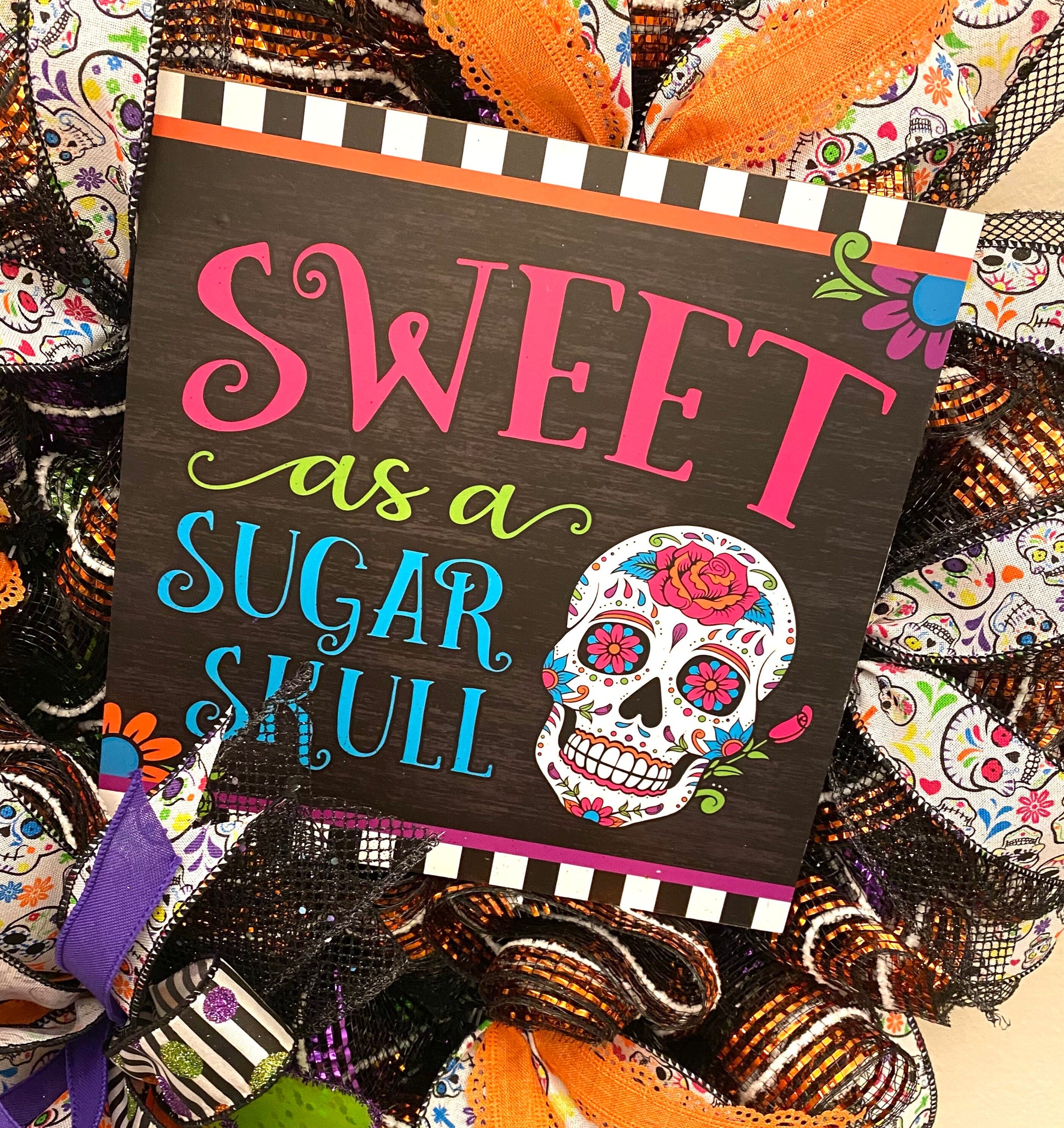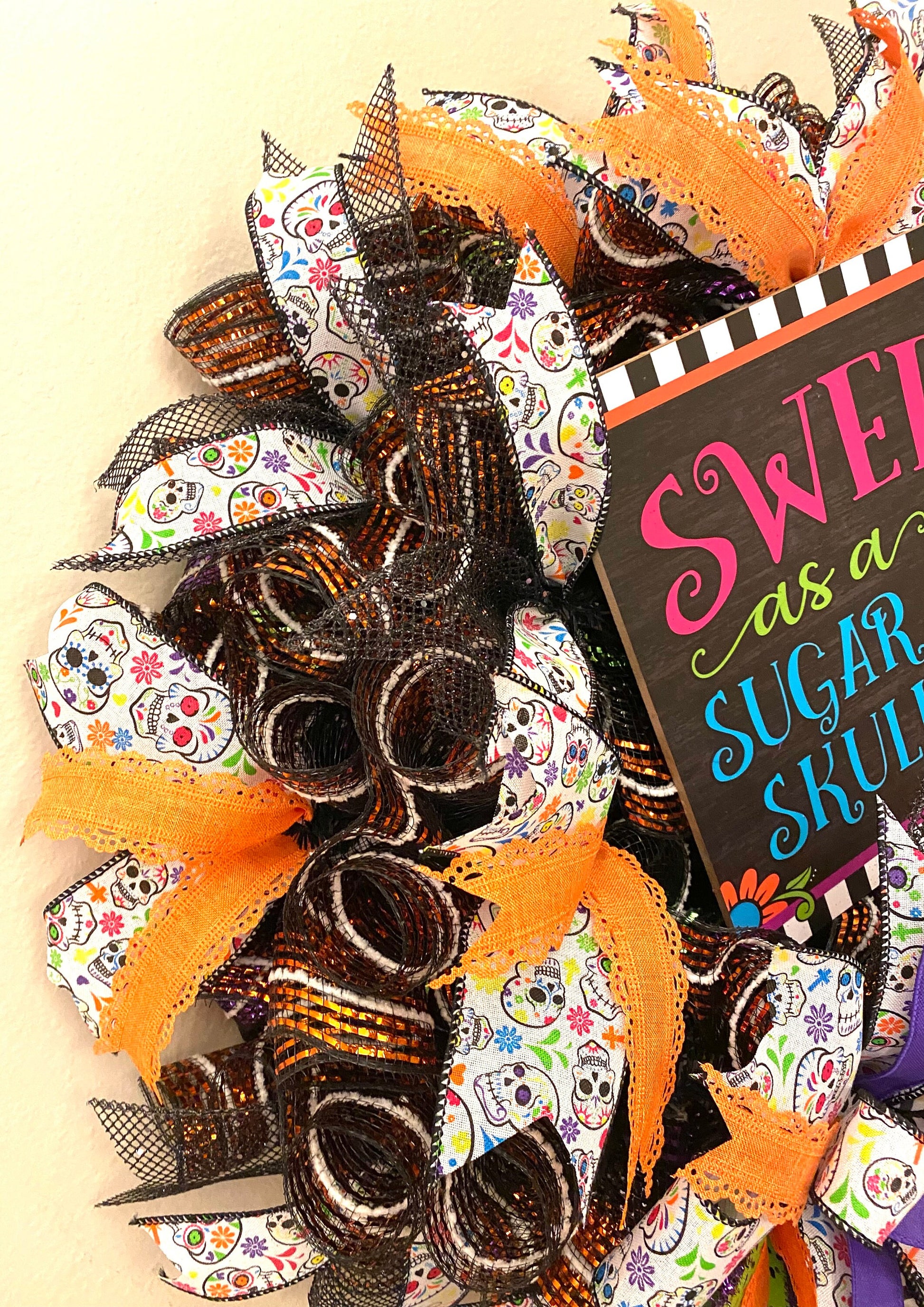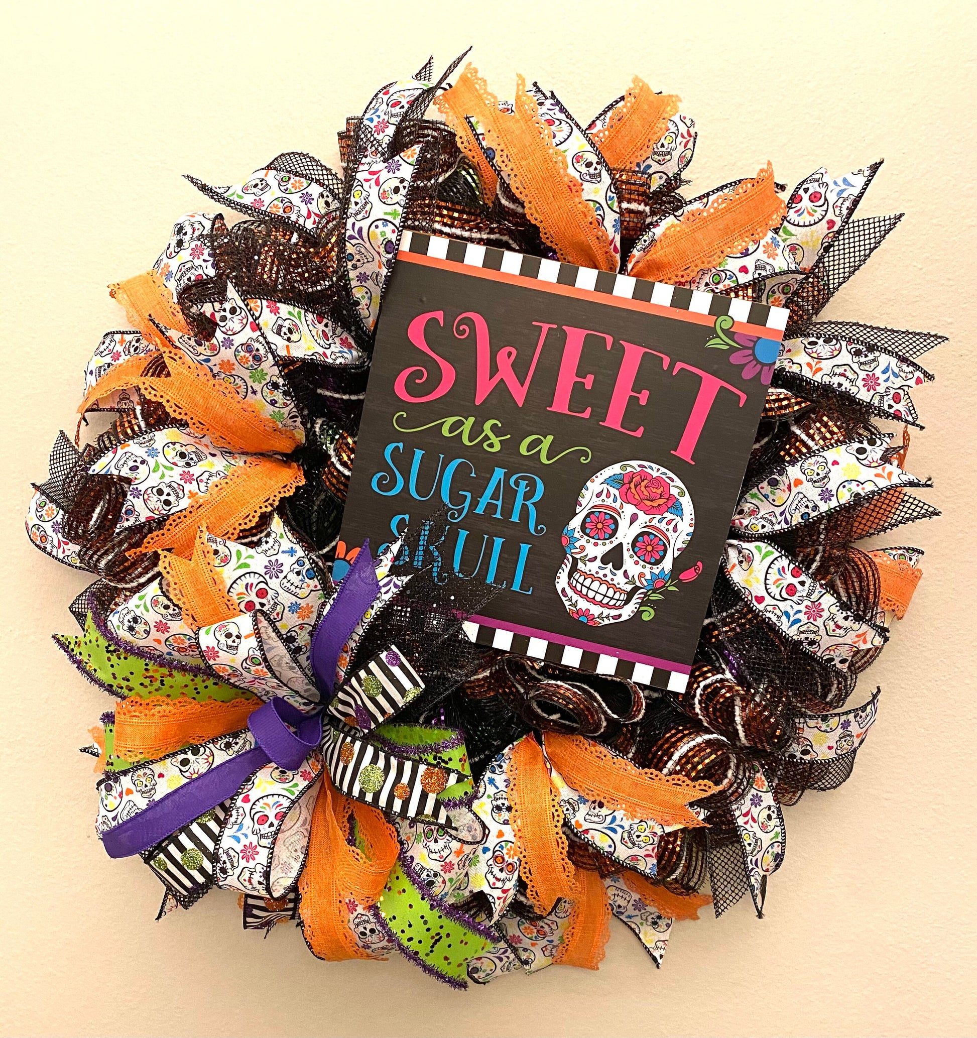 This fun handmade bright & colorful Halloween, or Day of the Dead, wreath is made on a wire wreath frame and with black, purple, green, & orange striped metallic deco mesh. It is embellished with a wood sign with a Sugar Skull, and states “Sweet as a Sugar Skull”, and wired ribbon in the colors of orange, black, white, green, and purple in various prints. This wreath measures 25 inches in diameter and 10 inches in depth.