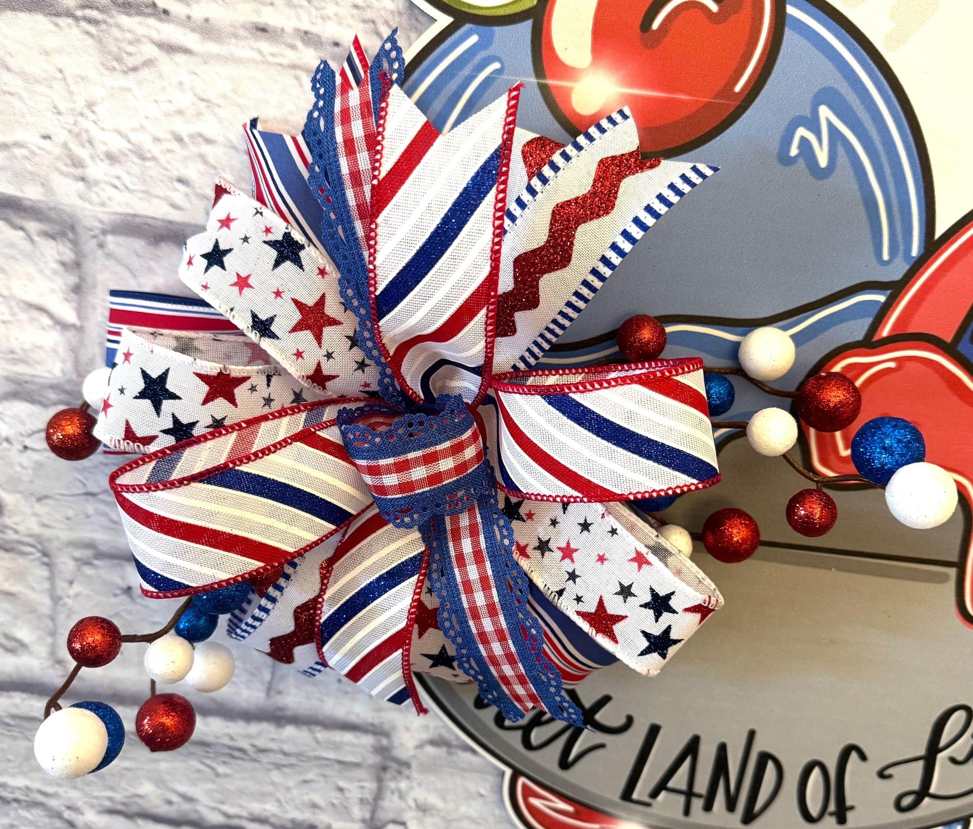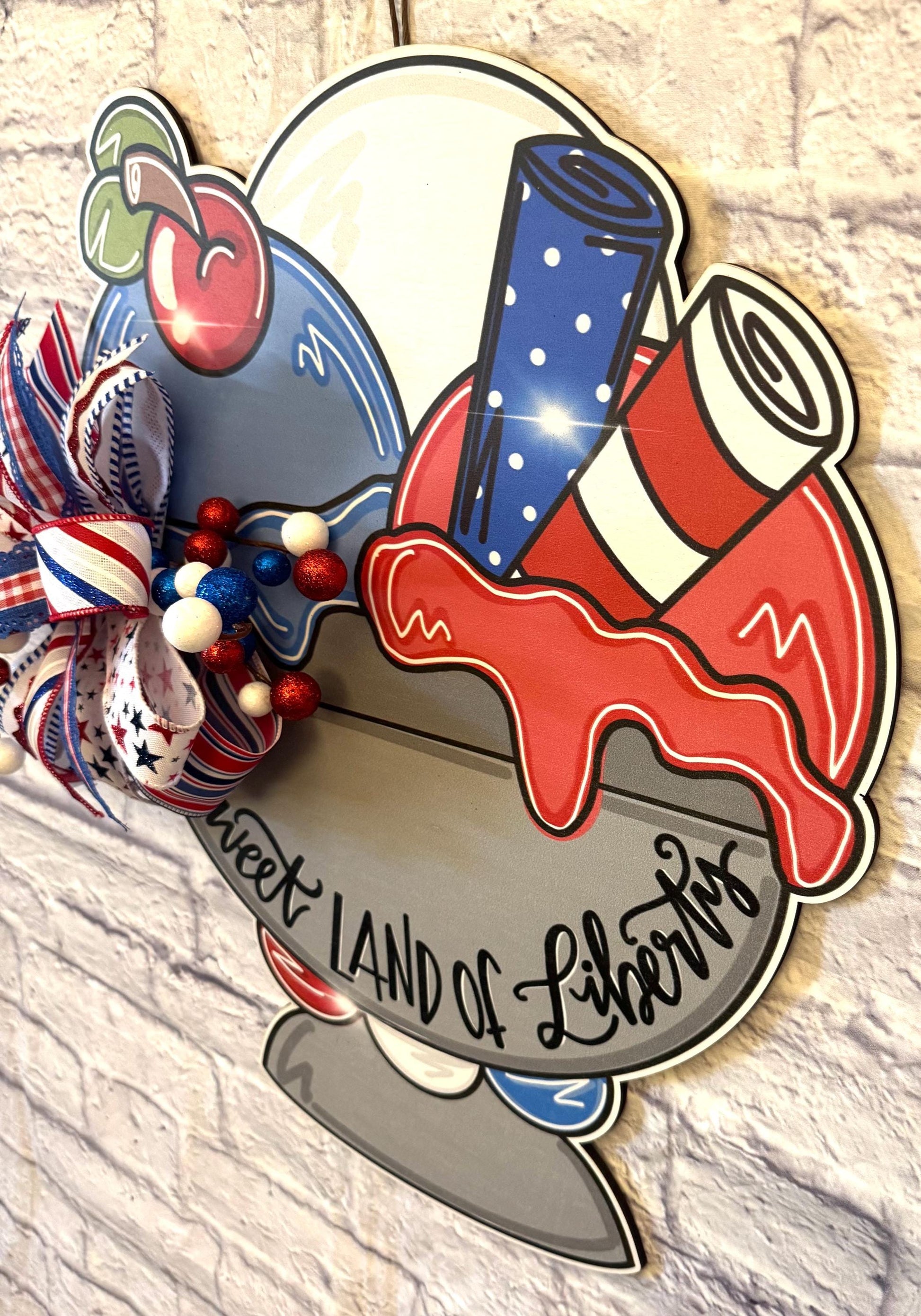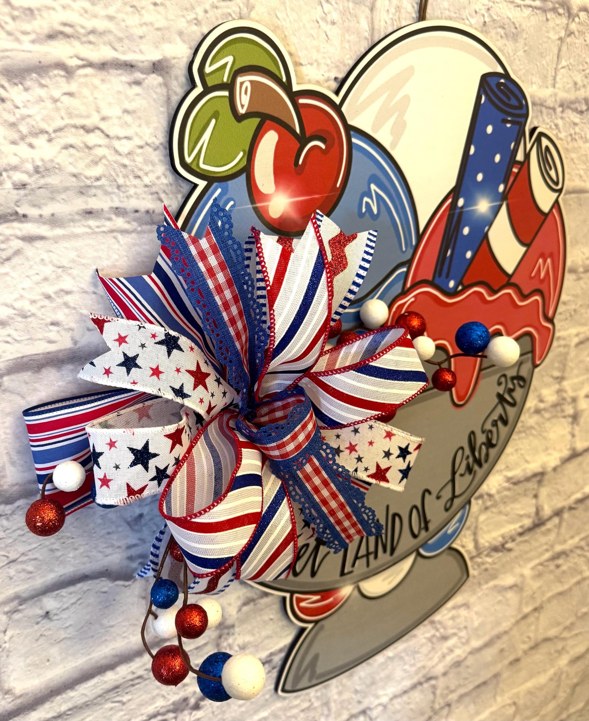 Add a scoop of patriotic charm to your front door with this “Sweet Land of Liberty” ice cream sundae door hanger! This festive piece features red, white, and blue scoops, striped “firework” rolls, a cherry on top, and a playful star-spangled bow with glittery bead sprays. A perfect way to celebrate summer and Independence Day with sweetness and sparkle!