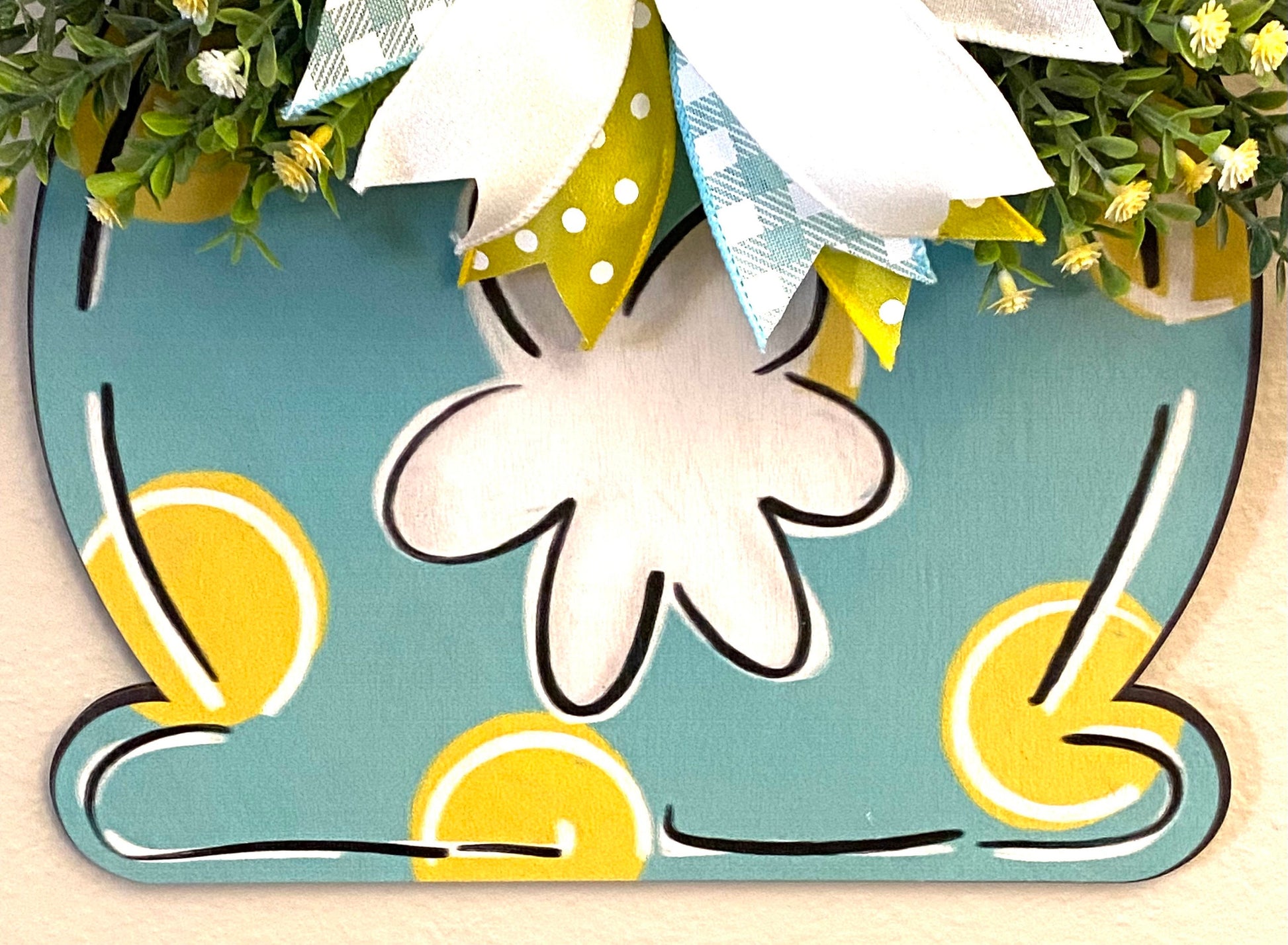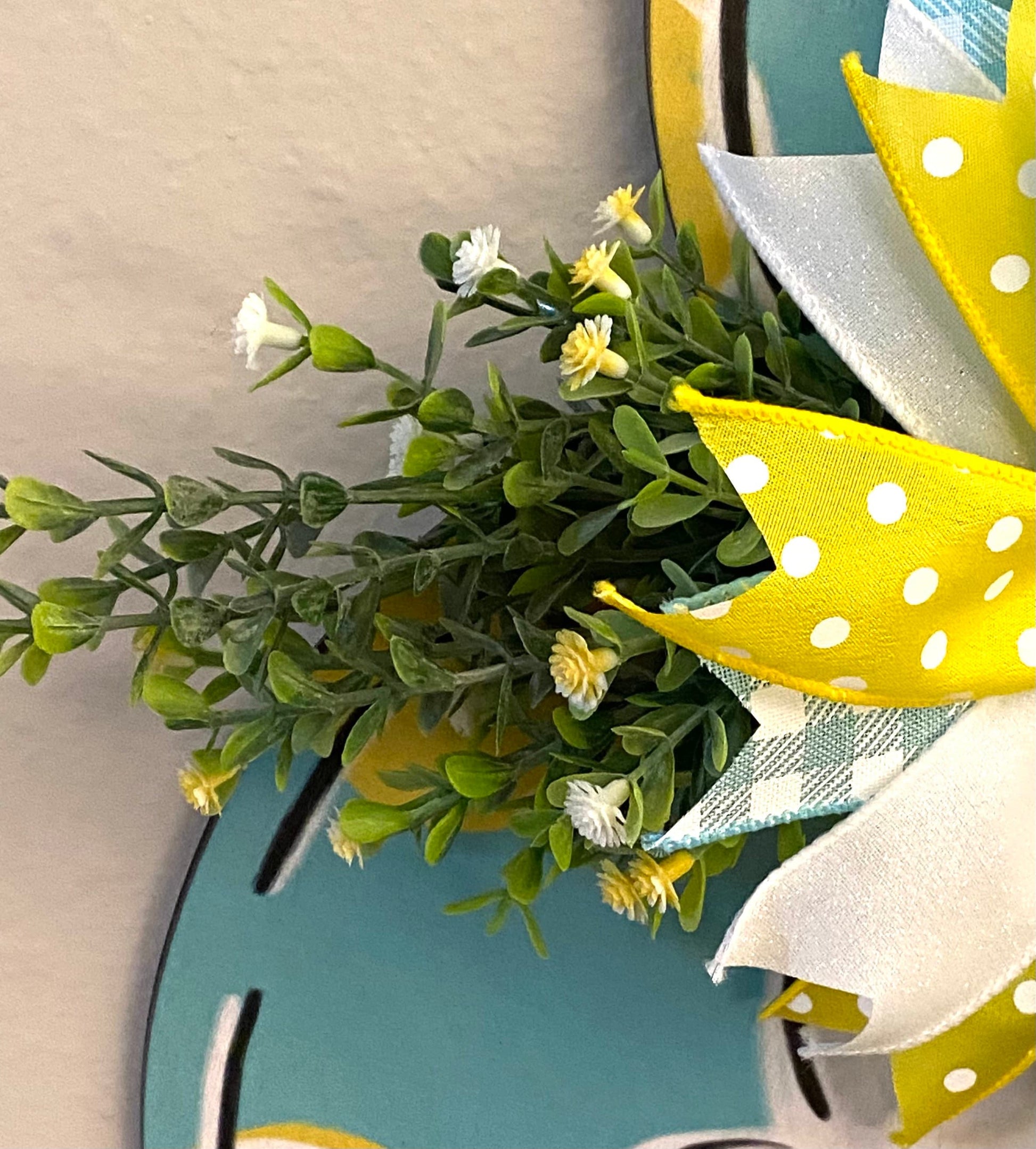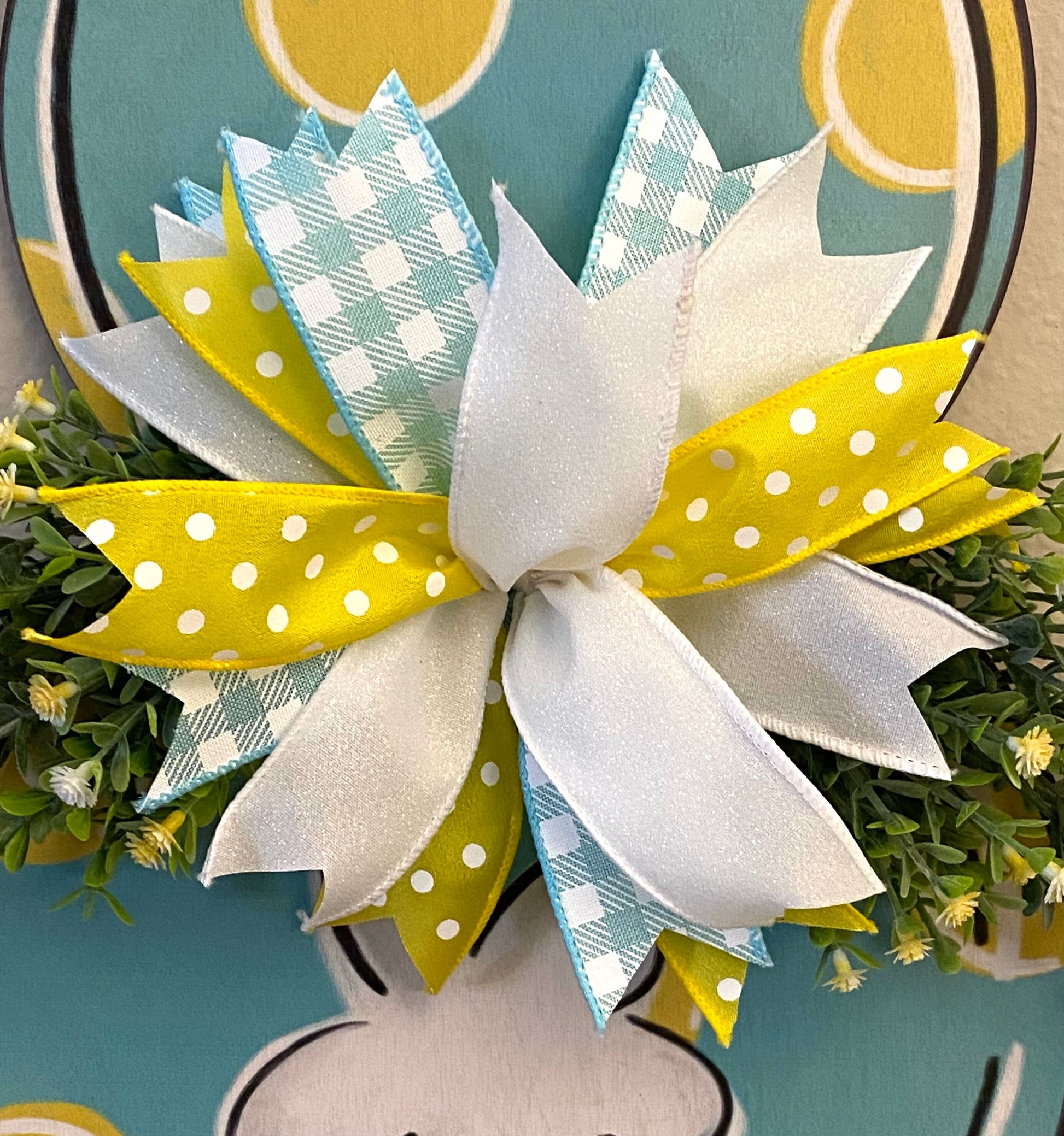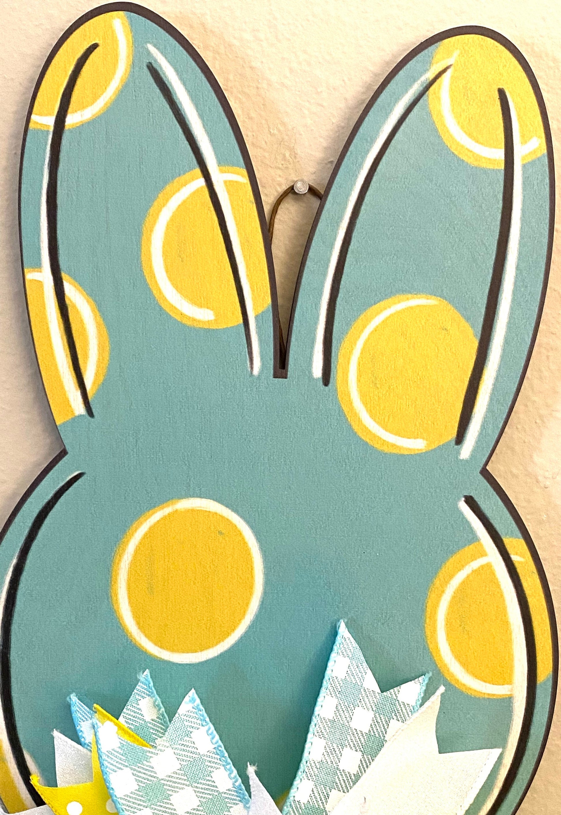 This fun and playful, handmade bunny door hanger is made of wood and printed in turquoise blue with yellow polka dots. The bunny is embellished with a bow made with wired ribbon in the colors of turquoise, yellow, & white, and yellow & white flowers,