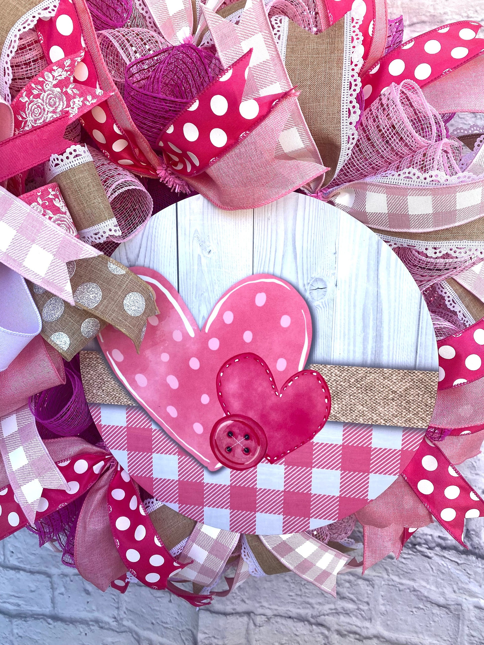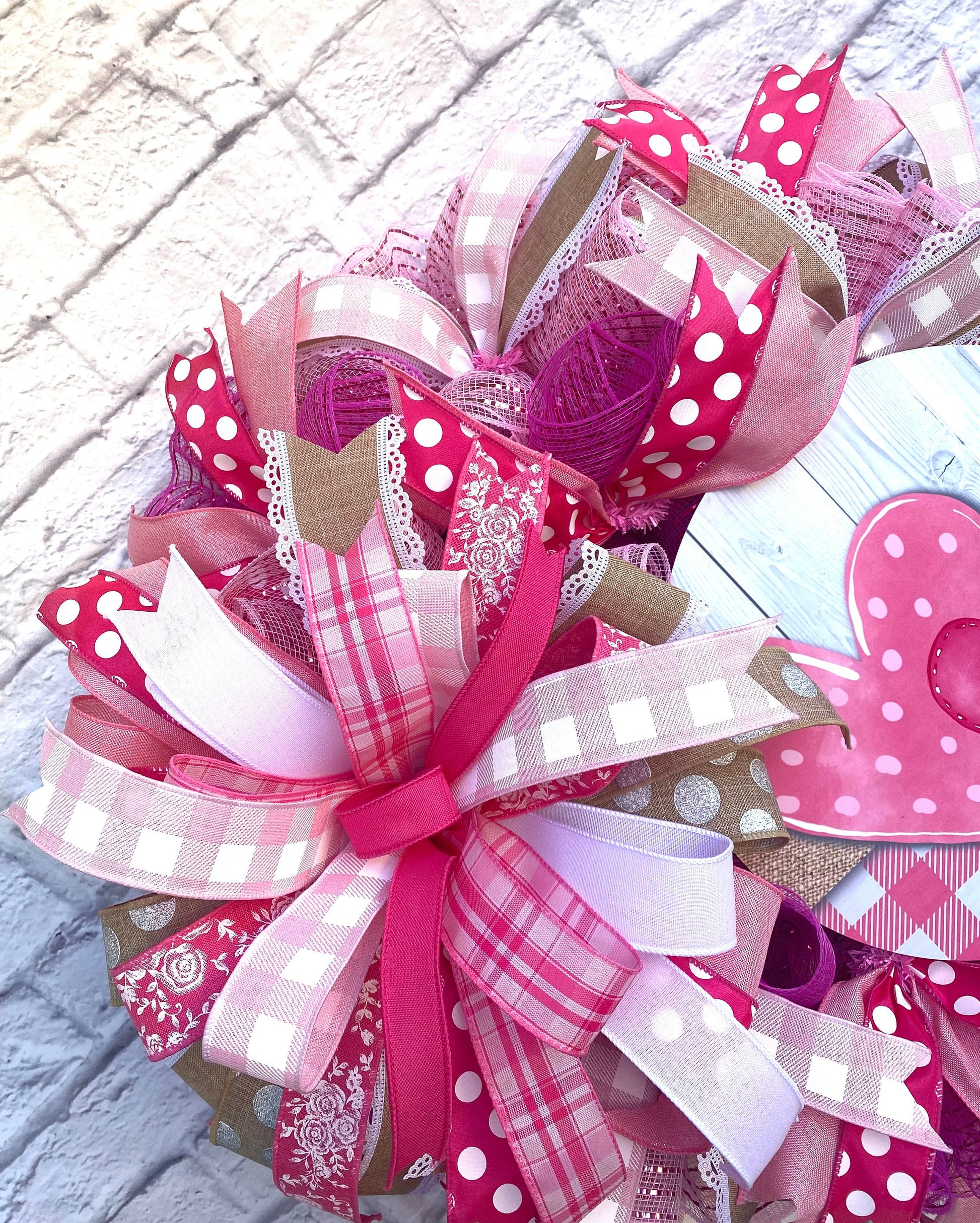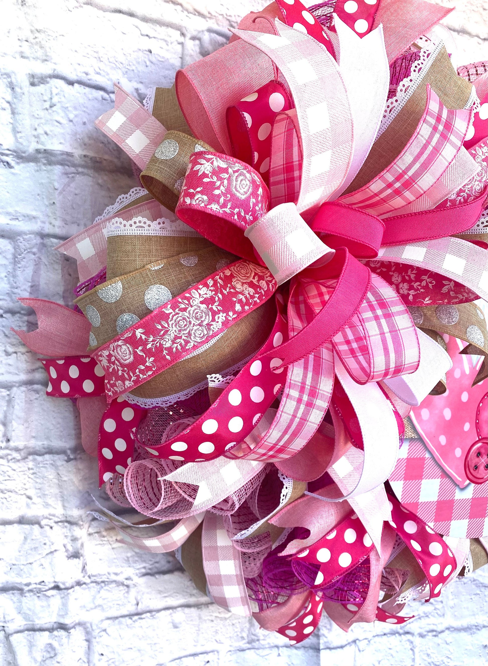 The wreath is made on a wire wreath frame and is 24 inches in diameter and 10 inches deep. The wreath is made with pink and hot pink deco mesh and is embellished with wired ribbon and the colors of pink, hot pink, white, and beige in various prints, and a metal sign with pink hearts.