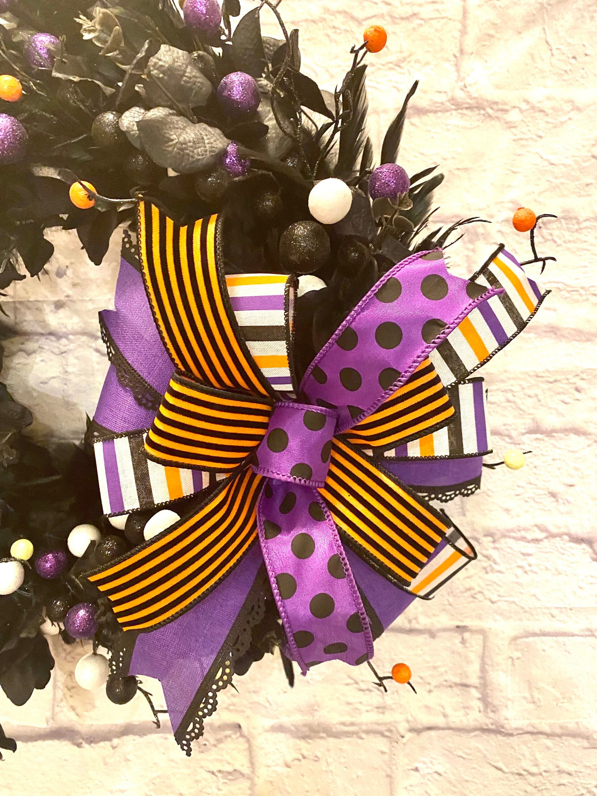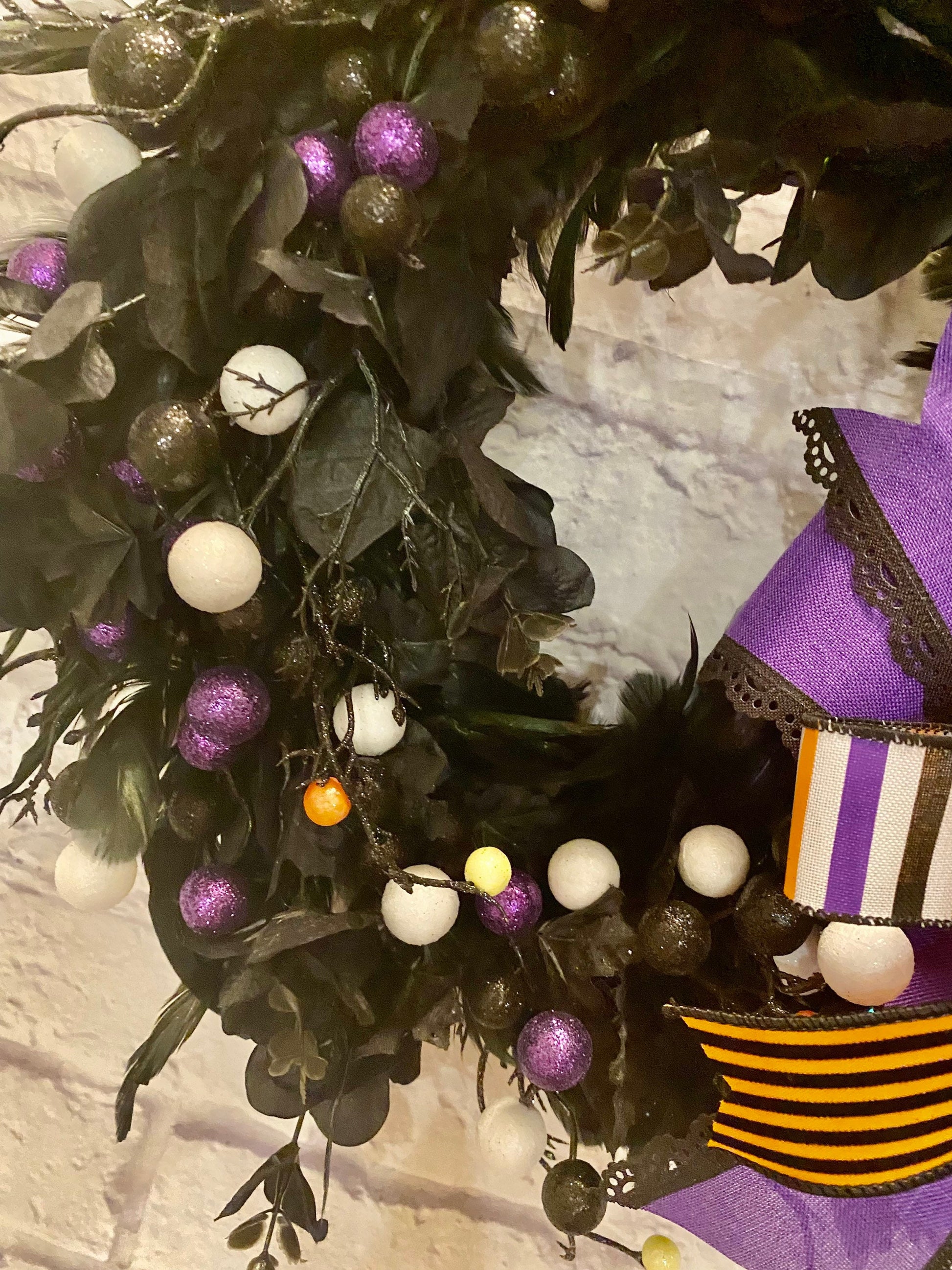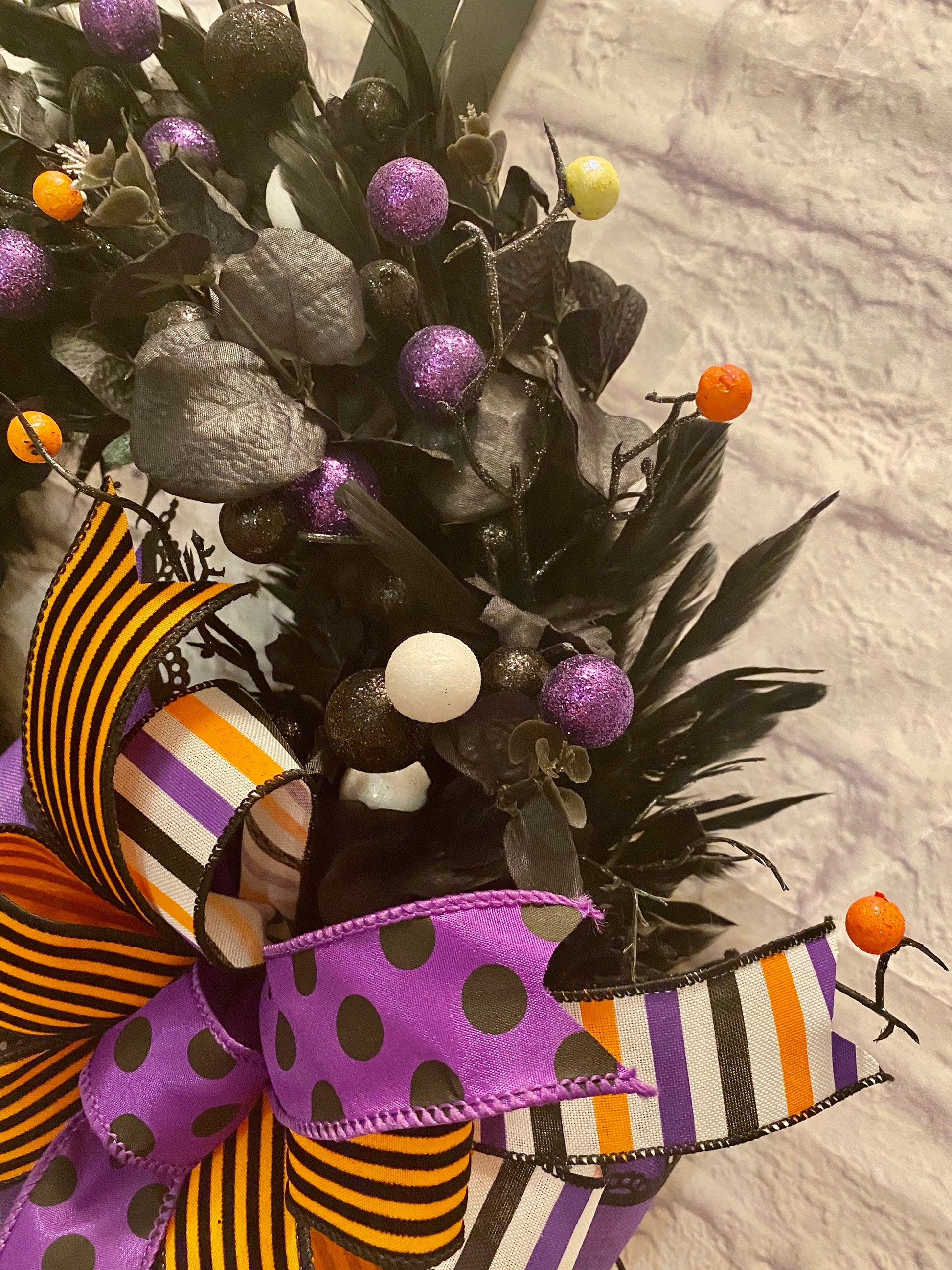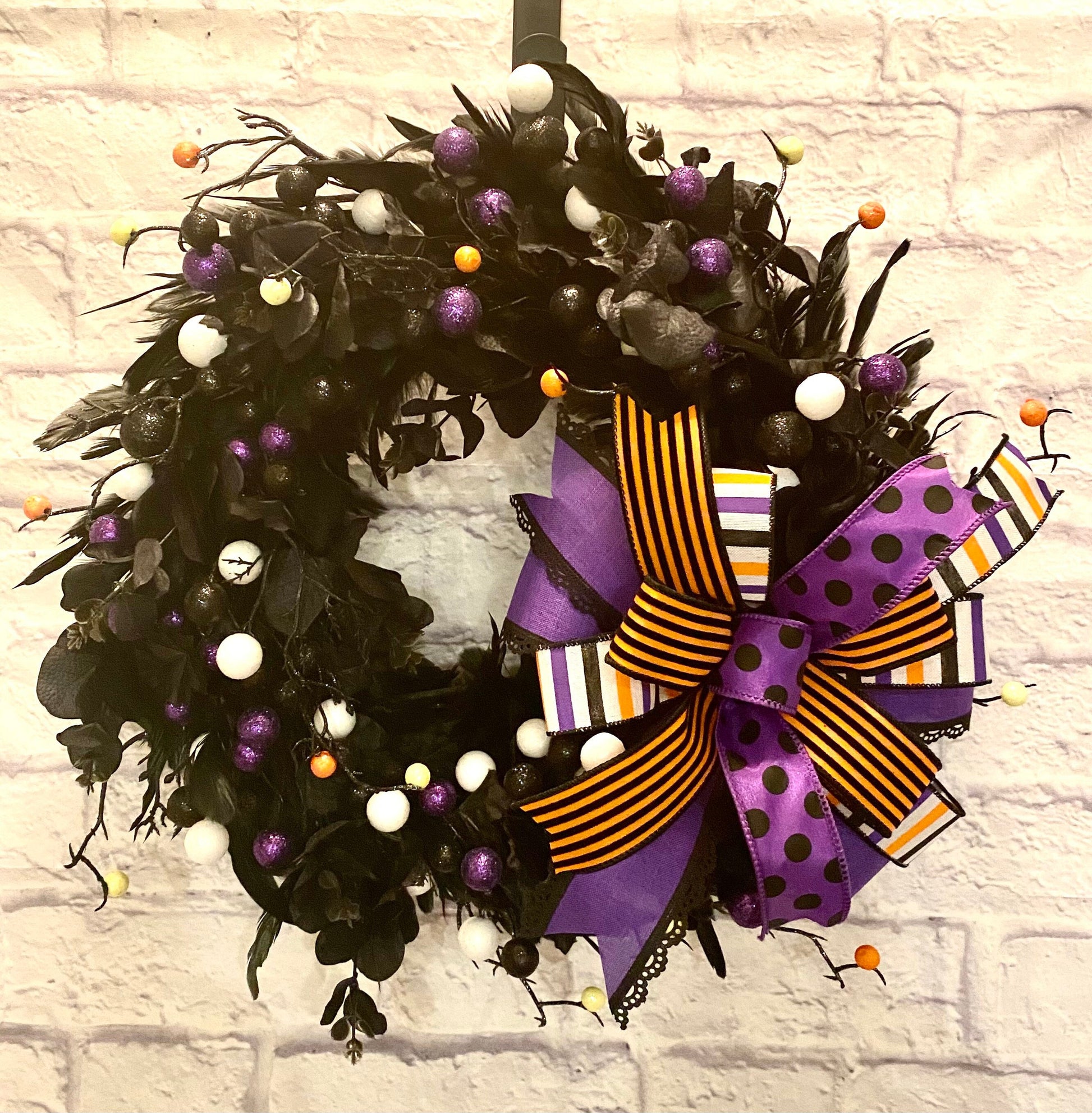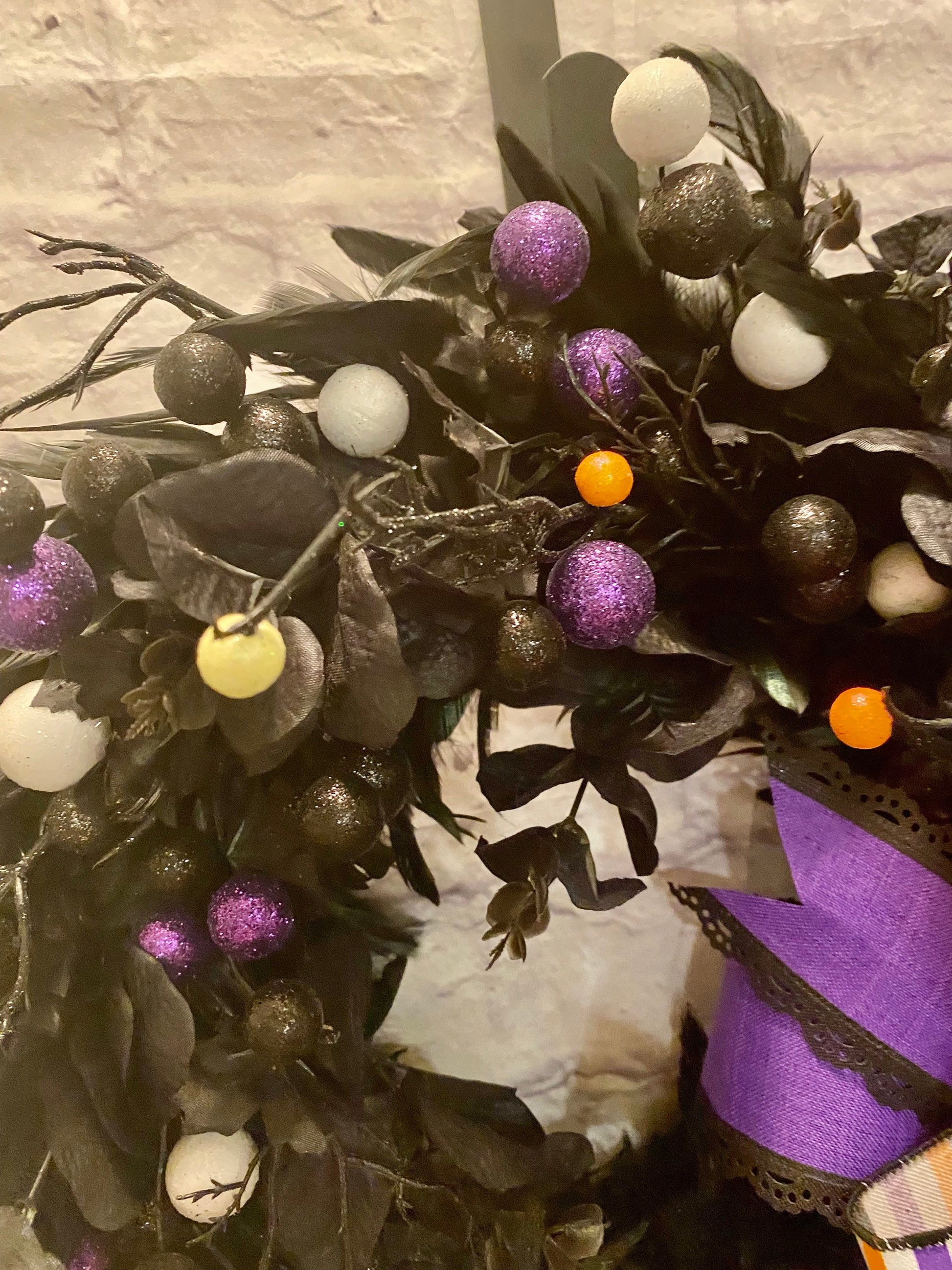This fun and whimsical handmade Halloween wreath is made on a styrofoam frame and with black feathers. It is embellished with black eucalyptus leaves, glittery black, purple, and white balls, a garland of black leaves & sprigs, and black sprigs with orange & white balls. The bow is made of wired ribbon in the colors of black, orange, purple, and white in various prints. This wreath measures 16 inches in diameter and 6 inches in depth.