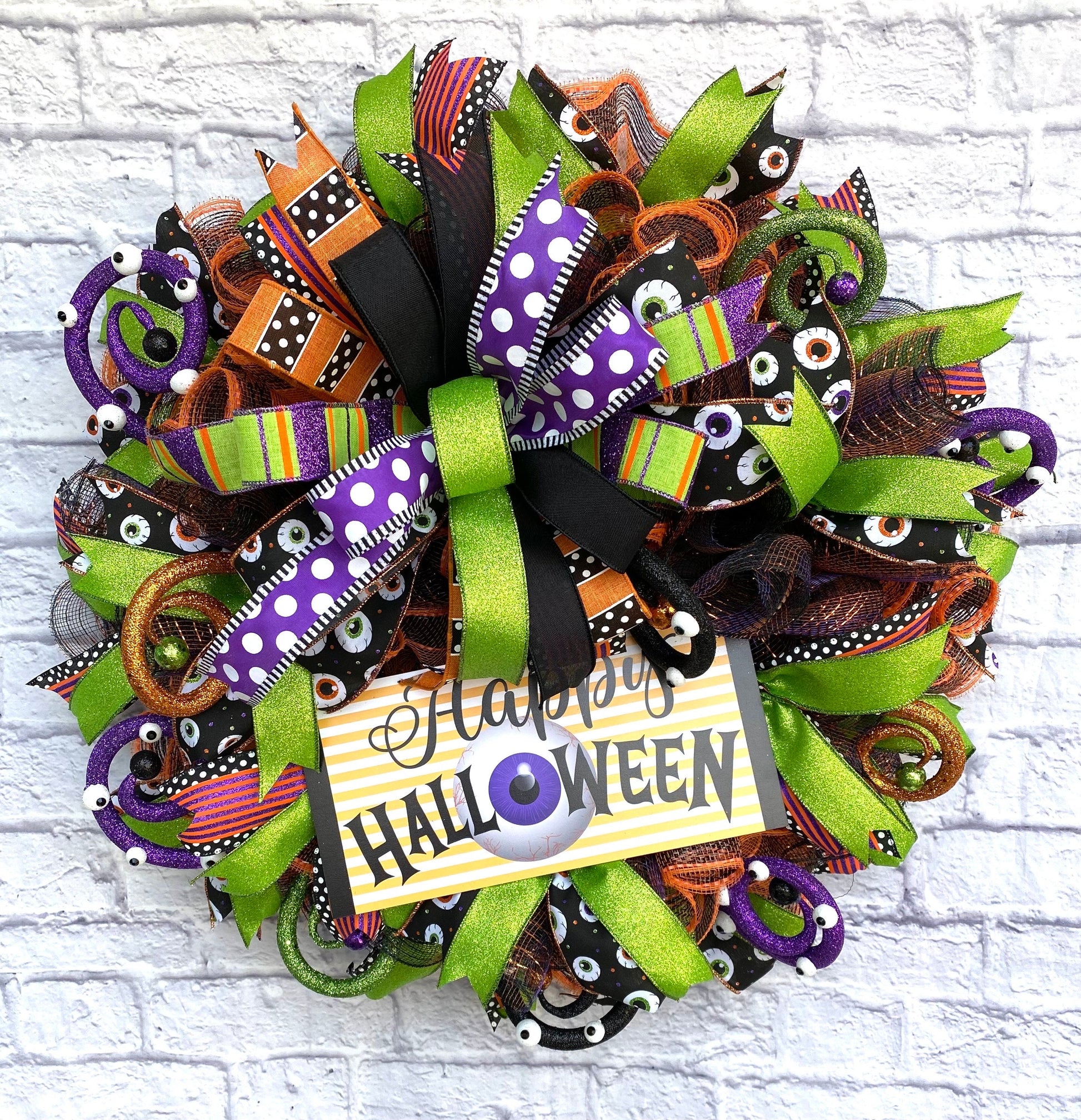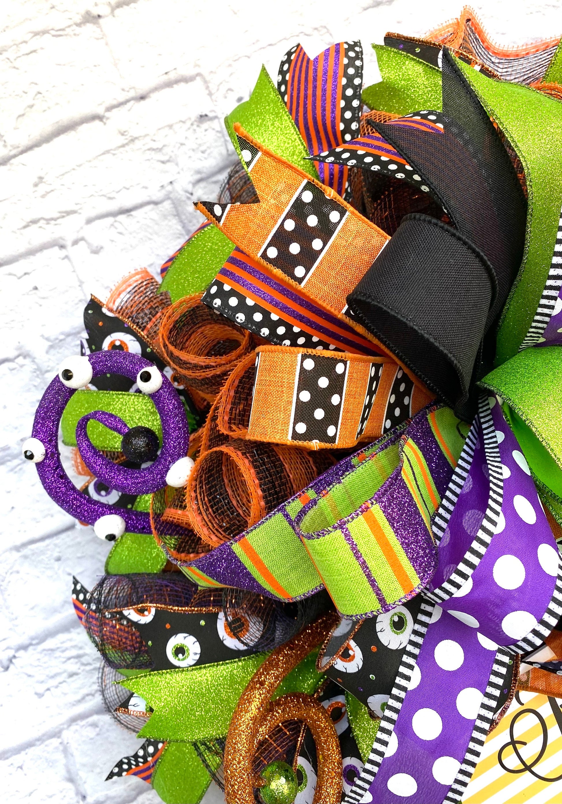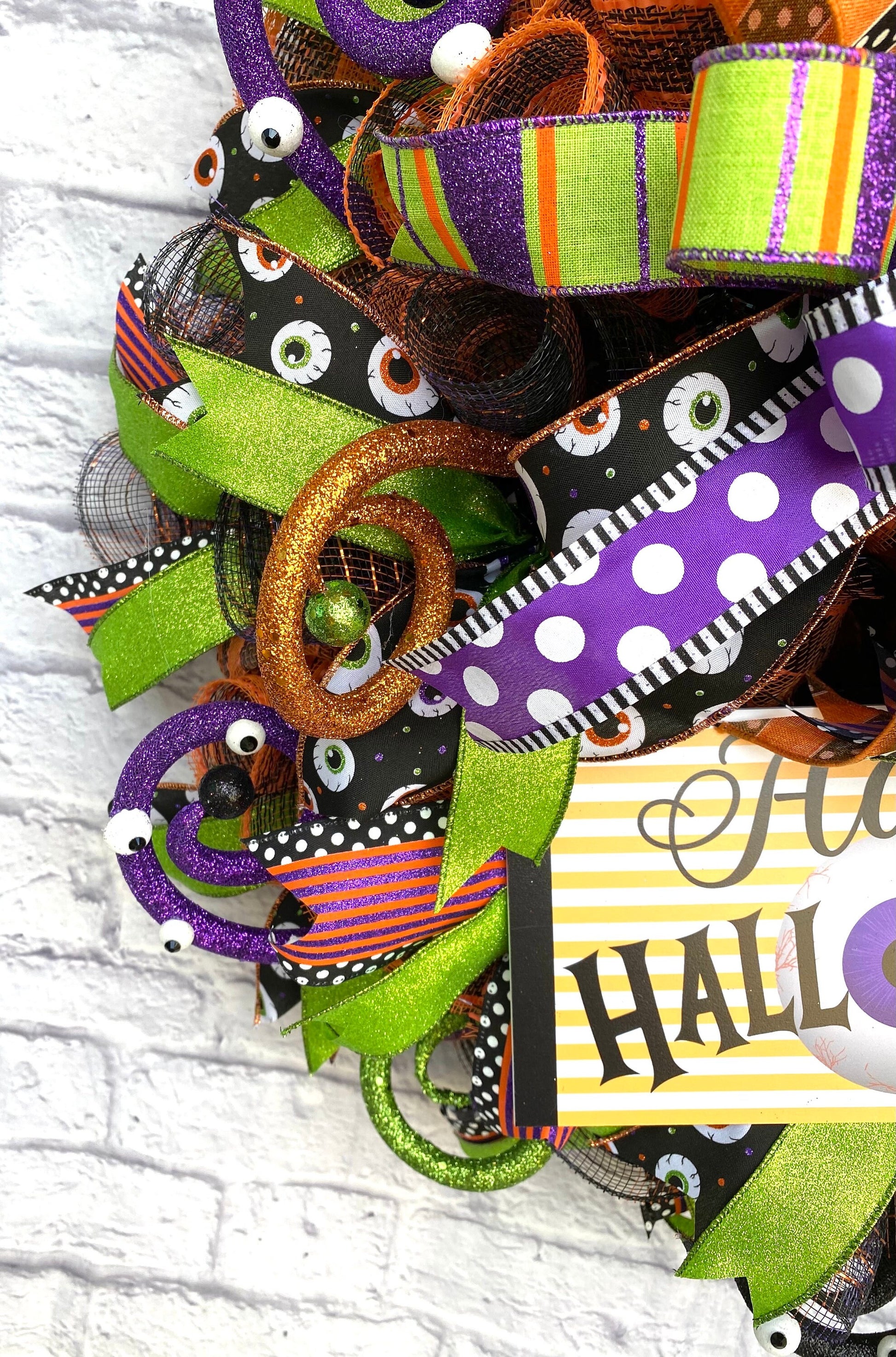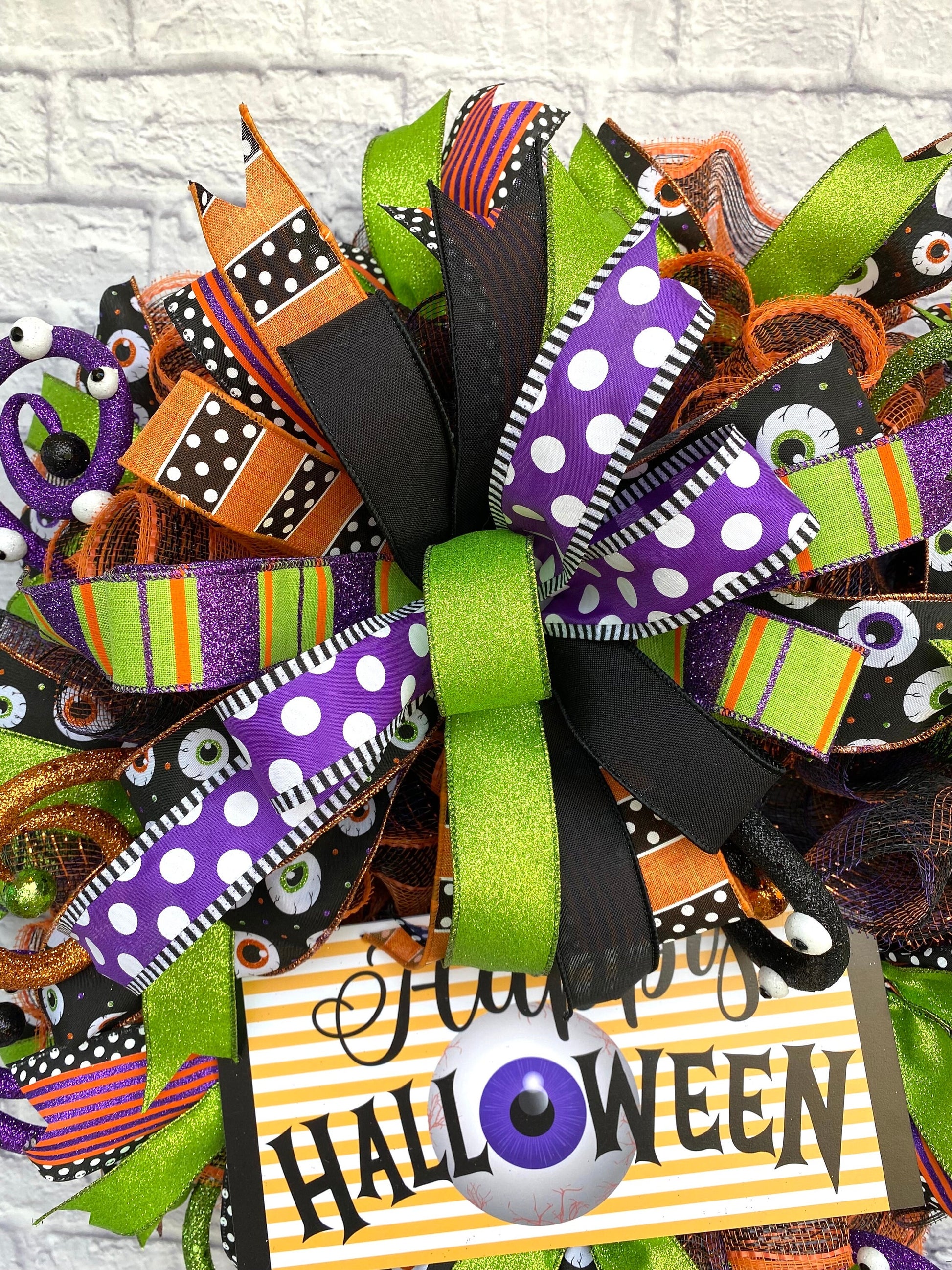 - Design: This wreath features a delightful combination of colors including black, green, orange, and purple. It is adorned with a variety of wired ribbons in polka dots, stripes, and Halloween-themed patterns, adding a playful touch.